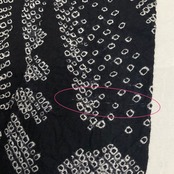 衿部分(左側白場)、上前身頃(裾から約31cm付近、白場)に、写真にも写りづらい程、目立ちにくいですが、うっすらシミ有り。