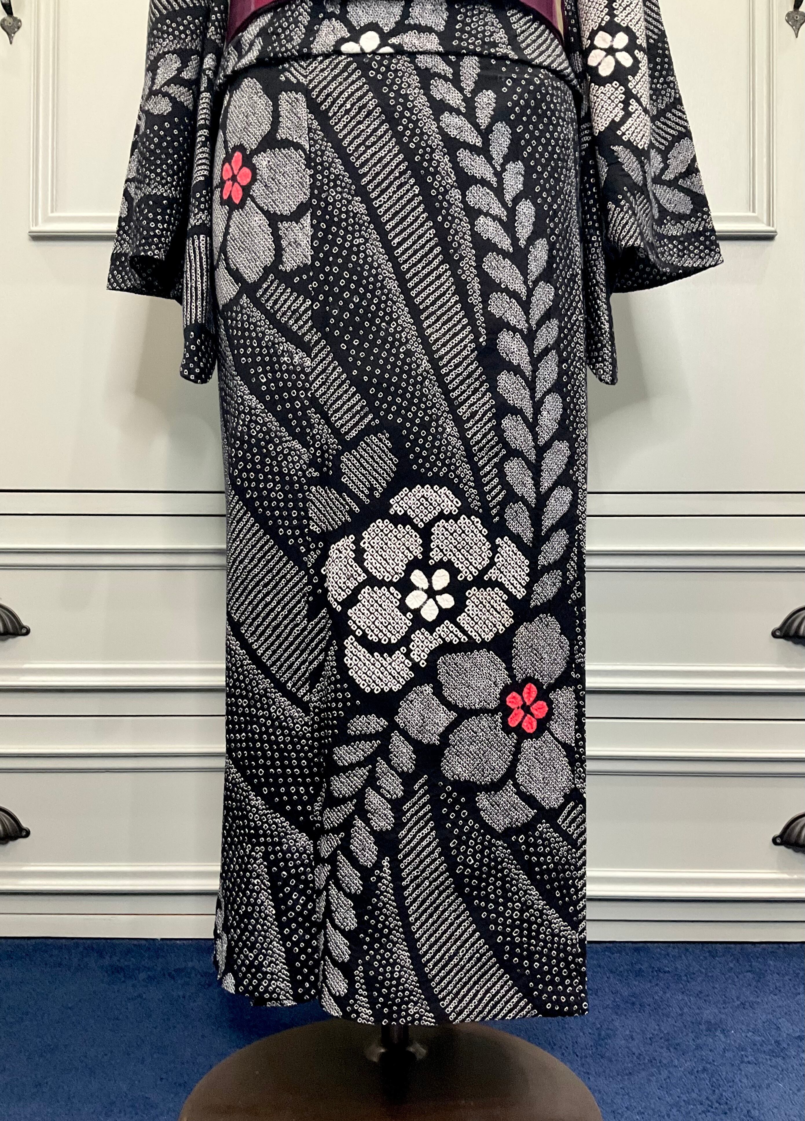 ロング*有松鳴海絞り浴衣*ブラック×ホワイト エレガント・フラワー 0854