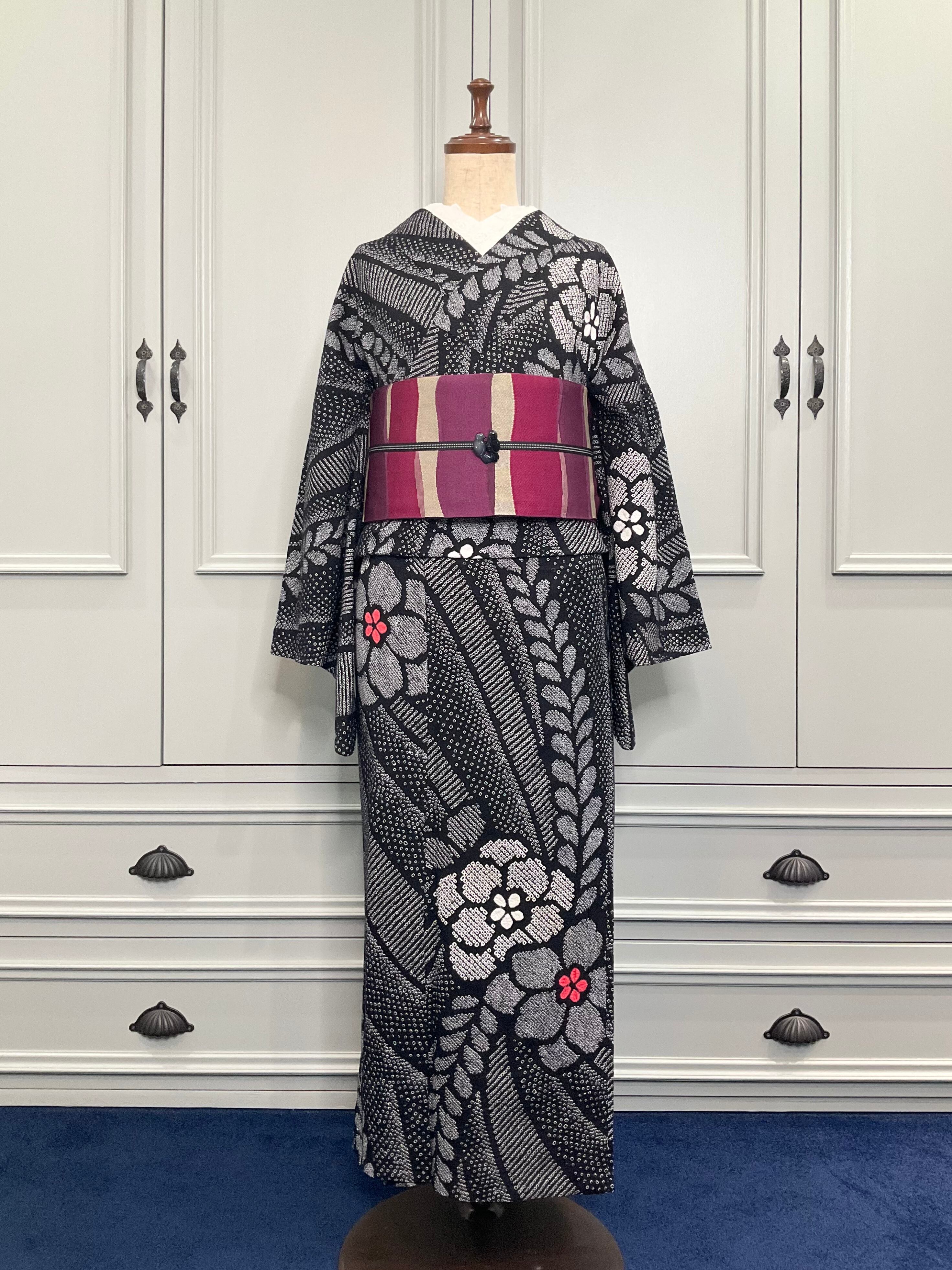 ブラック×ホワイトの地色に、花模様がデザインされた、有松鳴海絞り浴衣です♪
