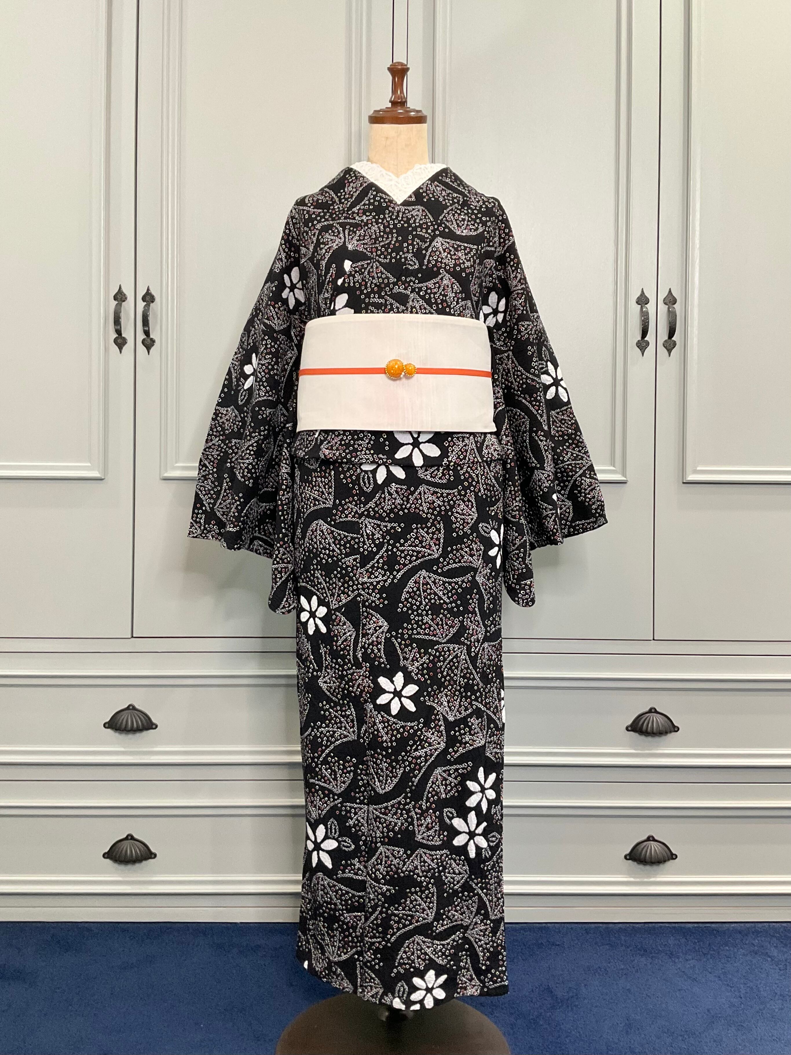 ブラックの地色に、花模様がデザインされた、有松鳴海絞り浴衣です♪