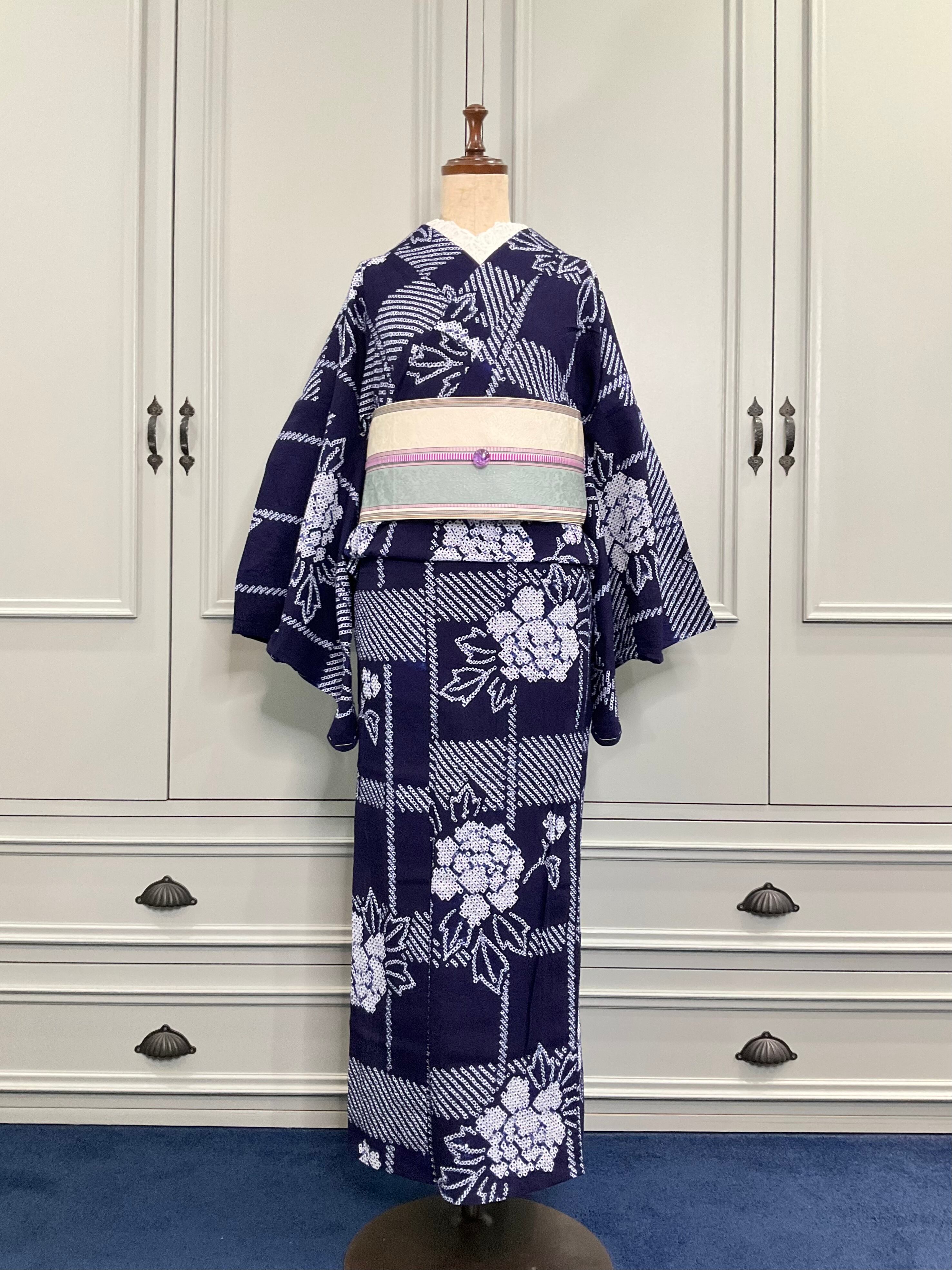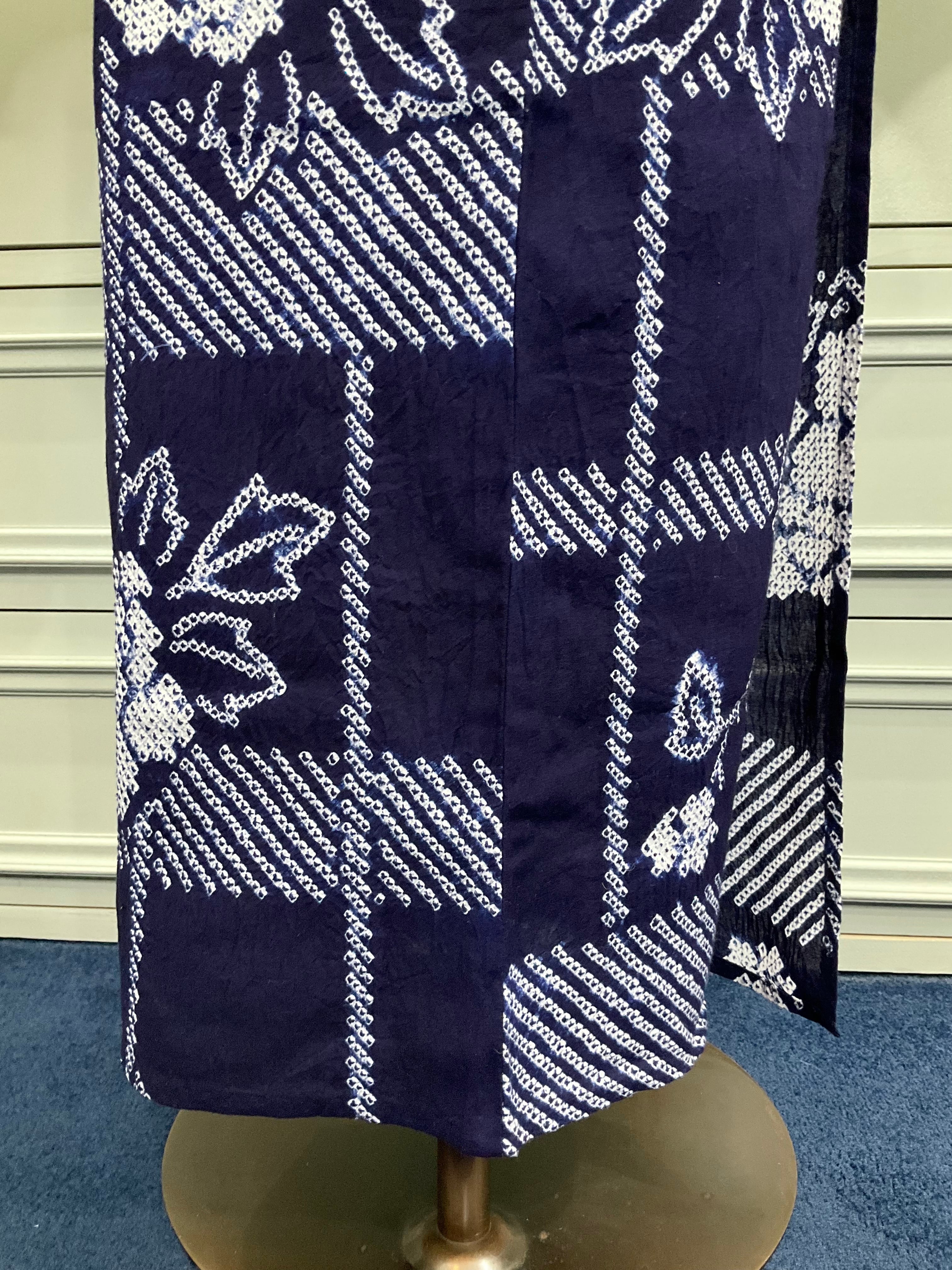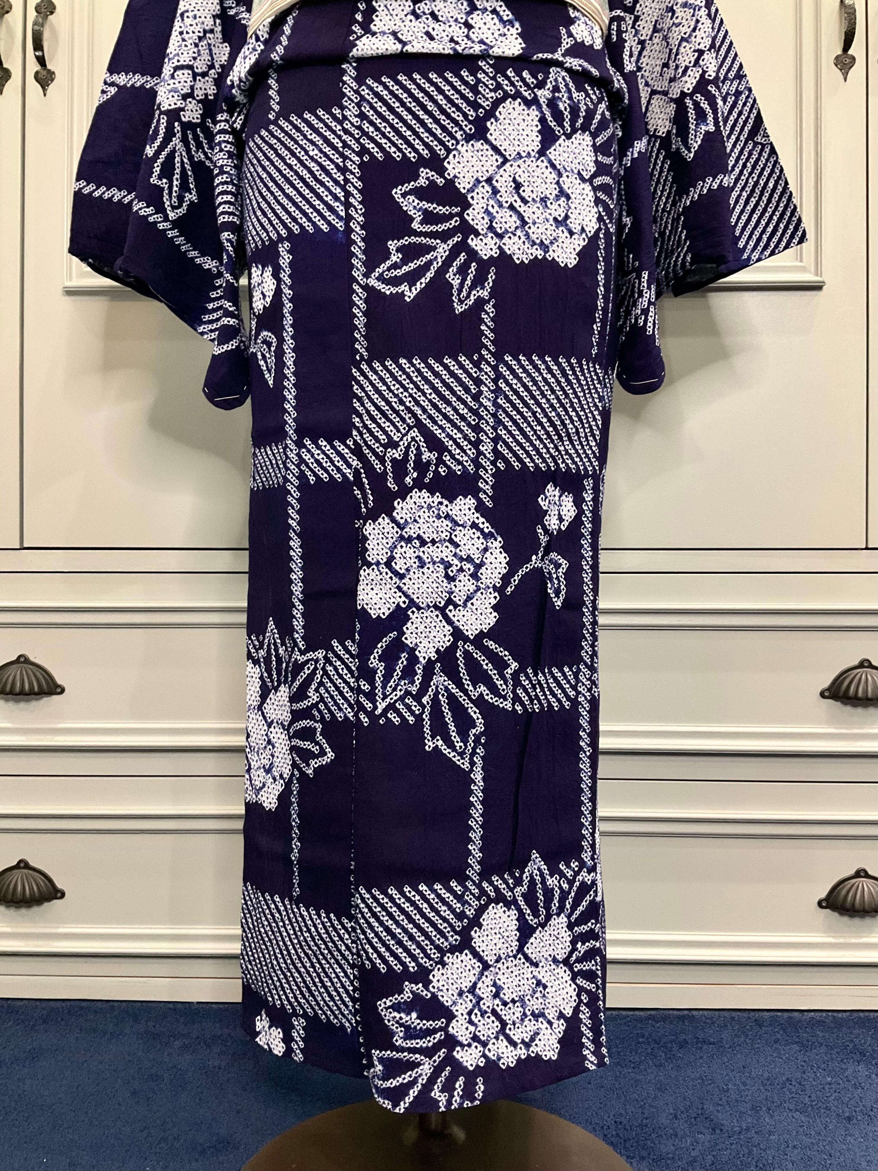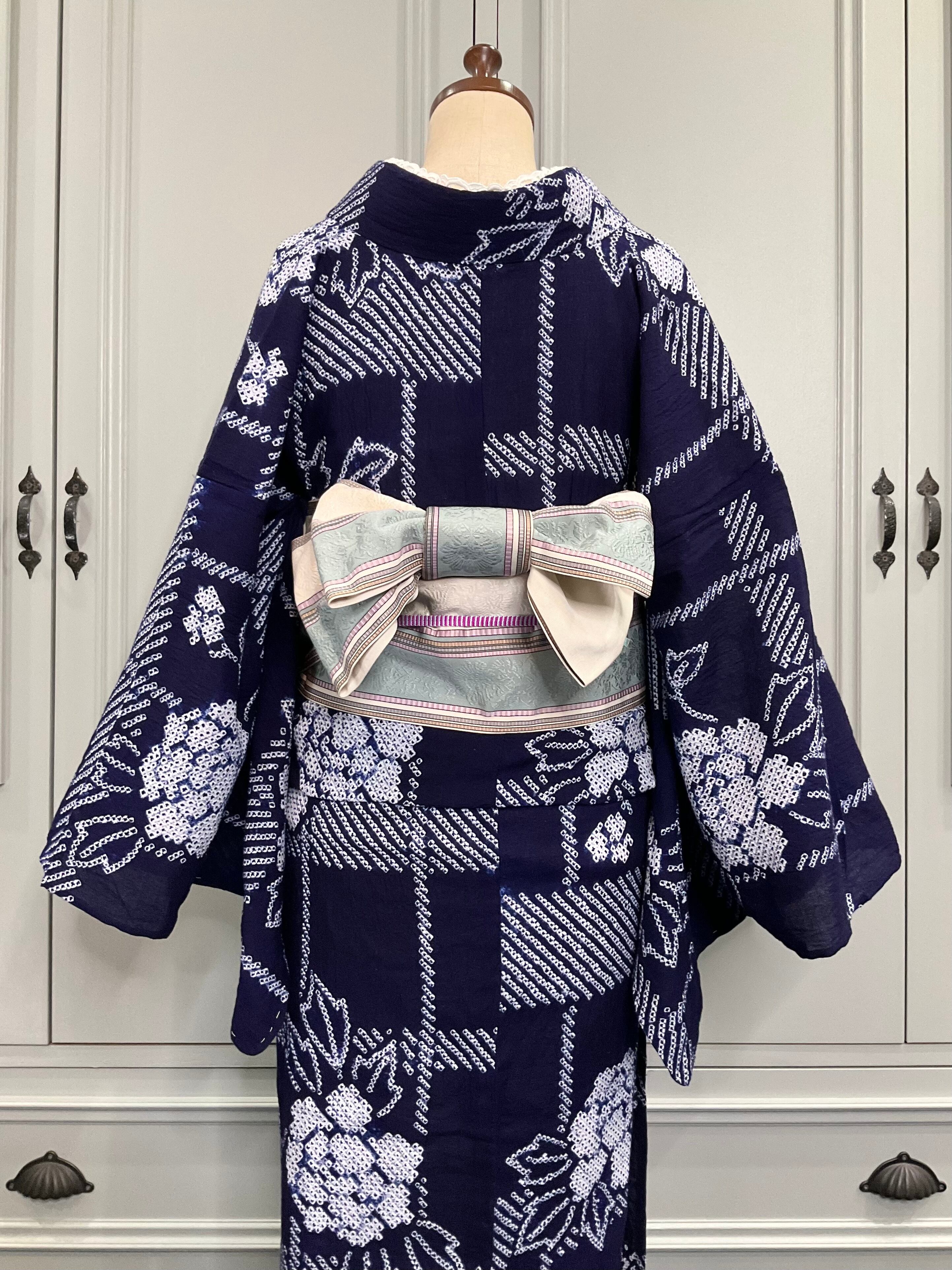 ロング*有松鳴海絞り浴衣*藍色 格子窓から見える花景色 0861
