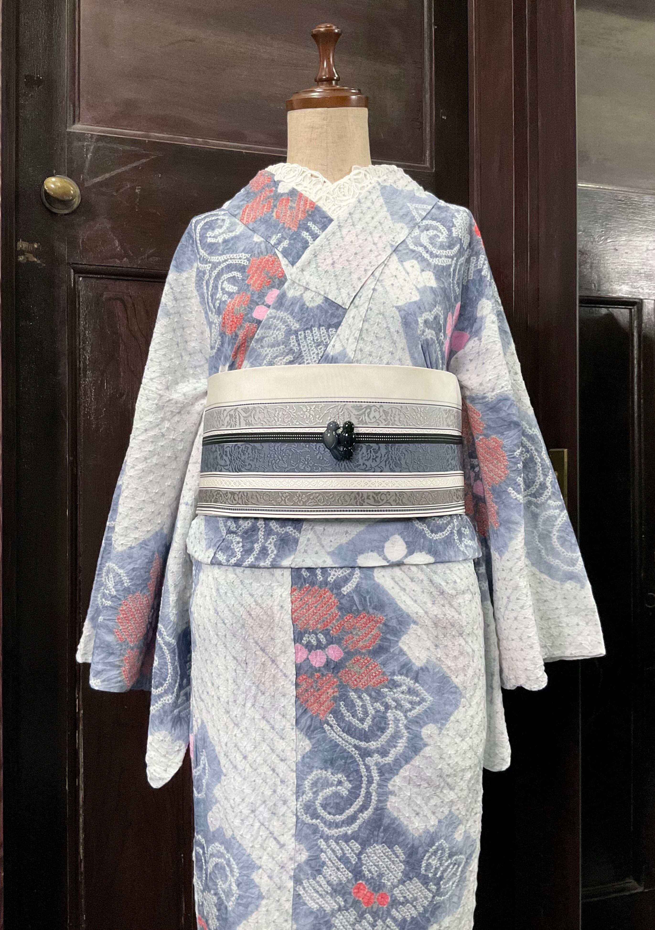 ホワイトと、ほんのりブルーがかった淡いグレーの組み合わせが、涼し気なこちらの絞り浴衣。
