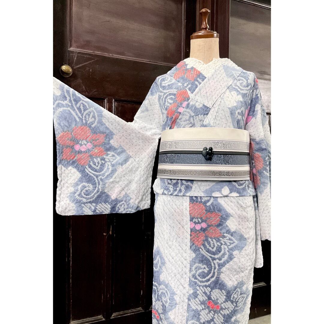 有松鳴海絞り浴衣*ホワイト×グレー フラワー 0874