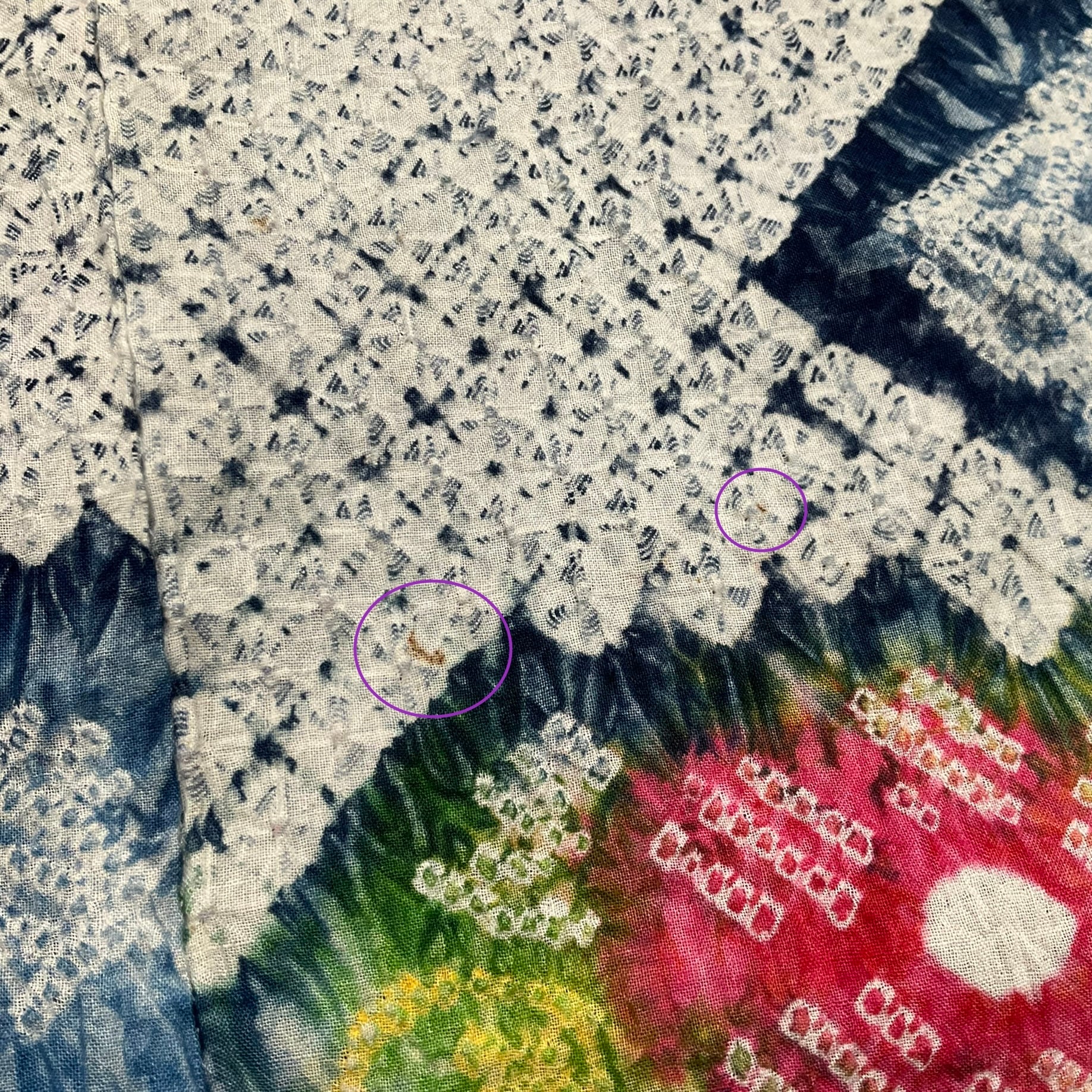 右後身頃(裾から約33cmあたり)、右外袖(袖付付近)に、目立ちにくいですが、小さな変色有り。