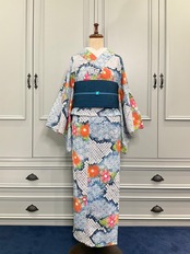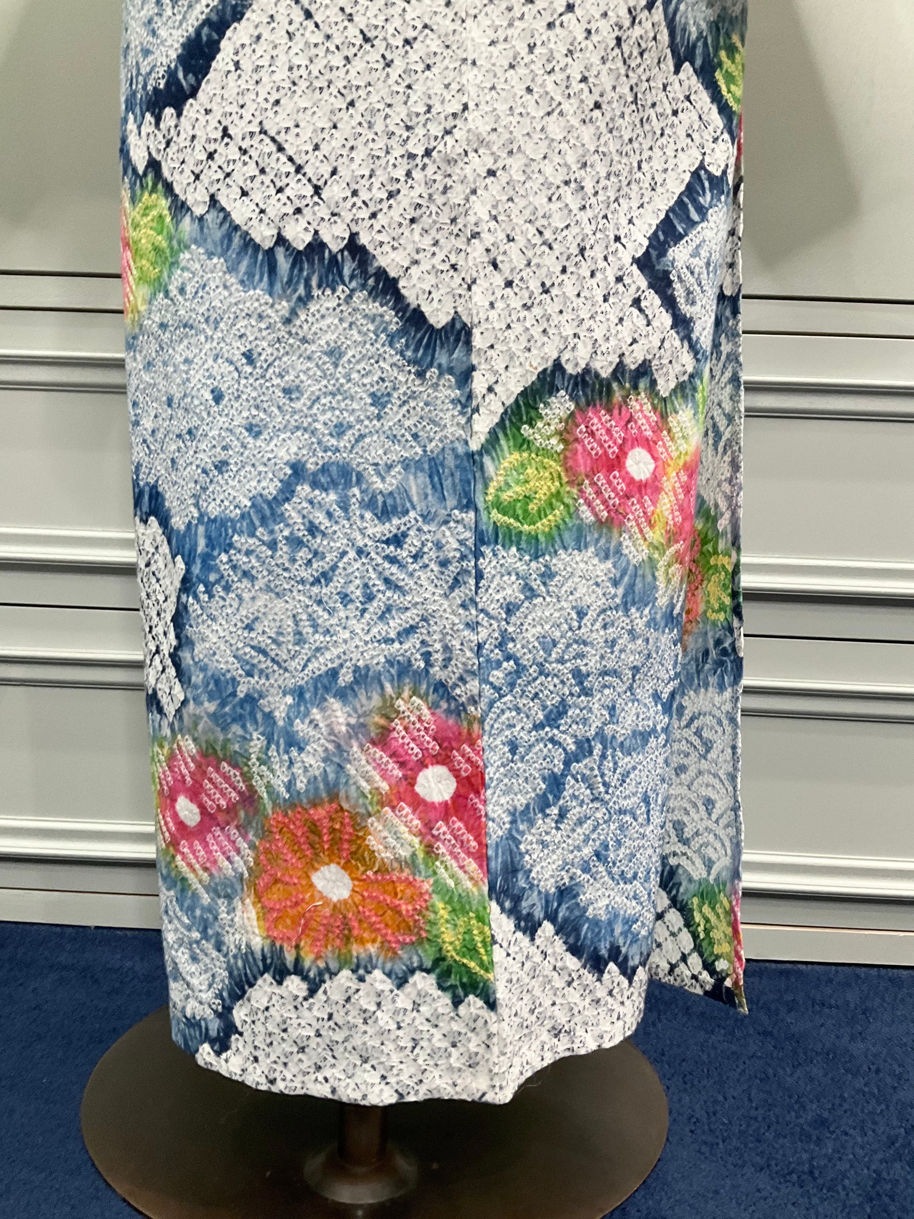 ホワイト×ブルー系の地色に、花模様がデザインされた、有松鳴海絞り浴衣です♪