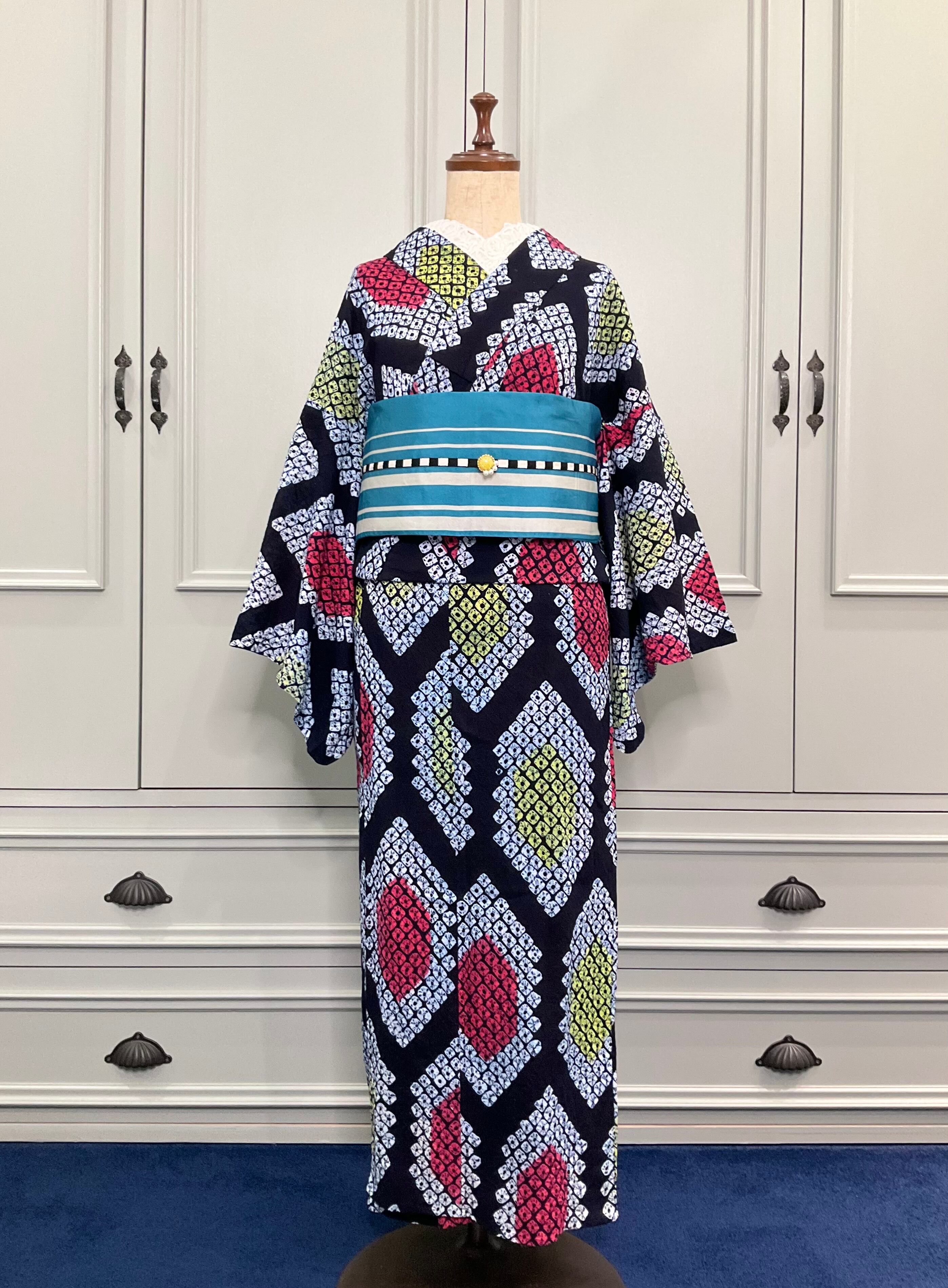 藍色に、亀甲のようなデザインが素敵な、有松鳴海絞り浴衣です♪