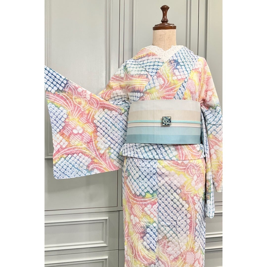 全体的にパステル調でまとめられたデザインにきゅん♡とする、こちらの絞り浴衣。