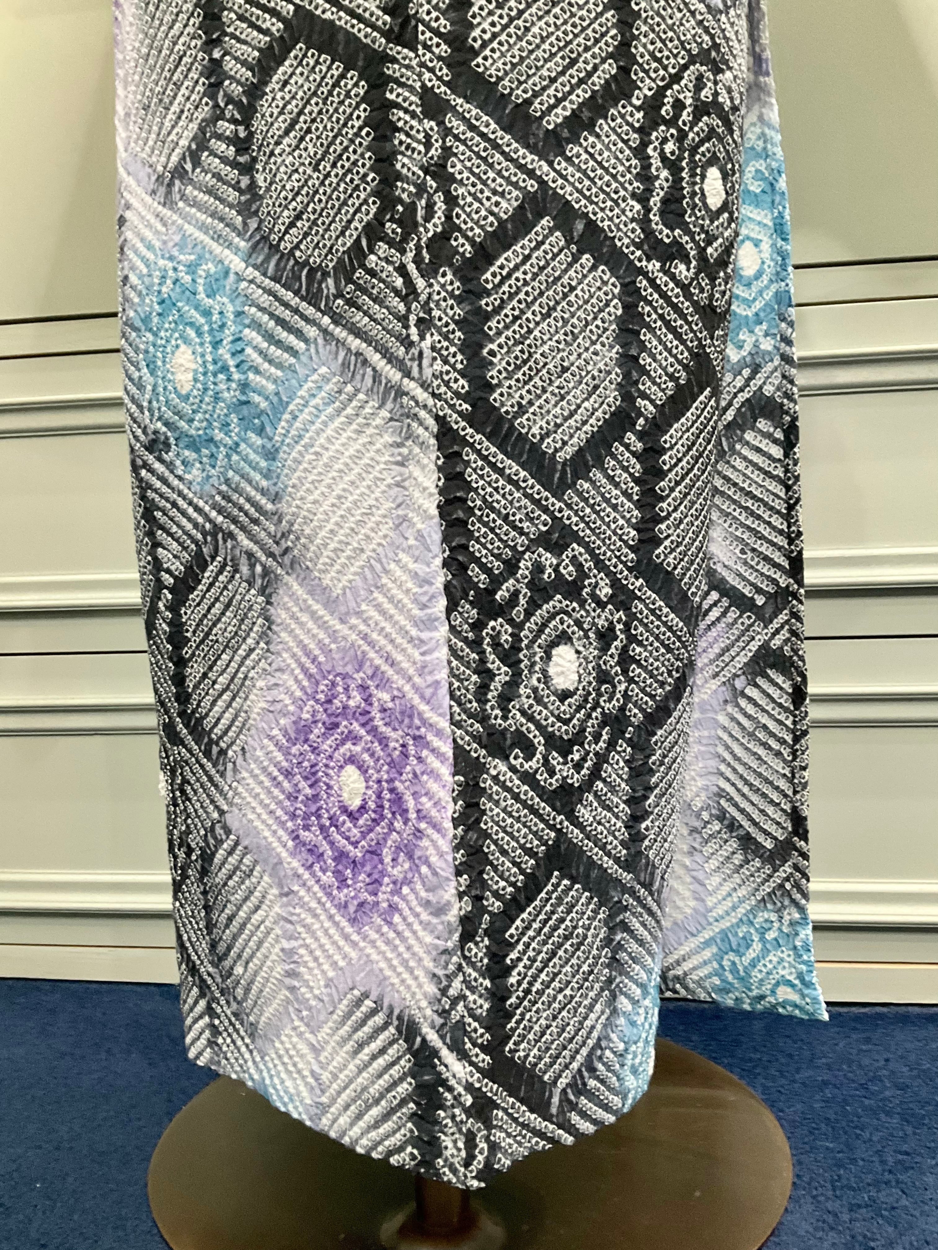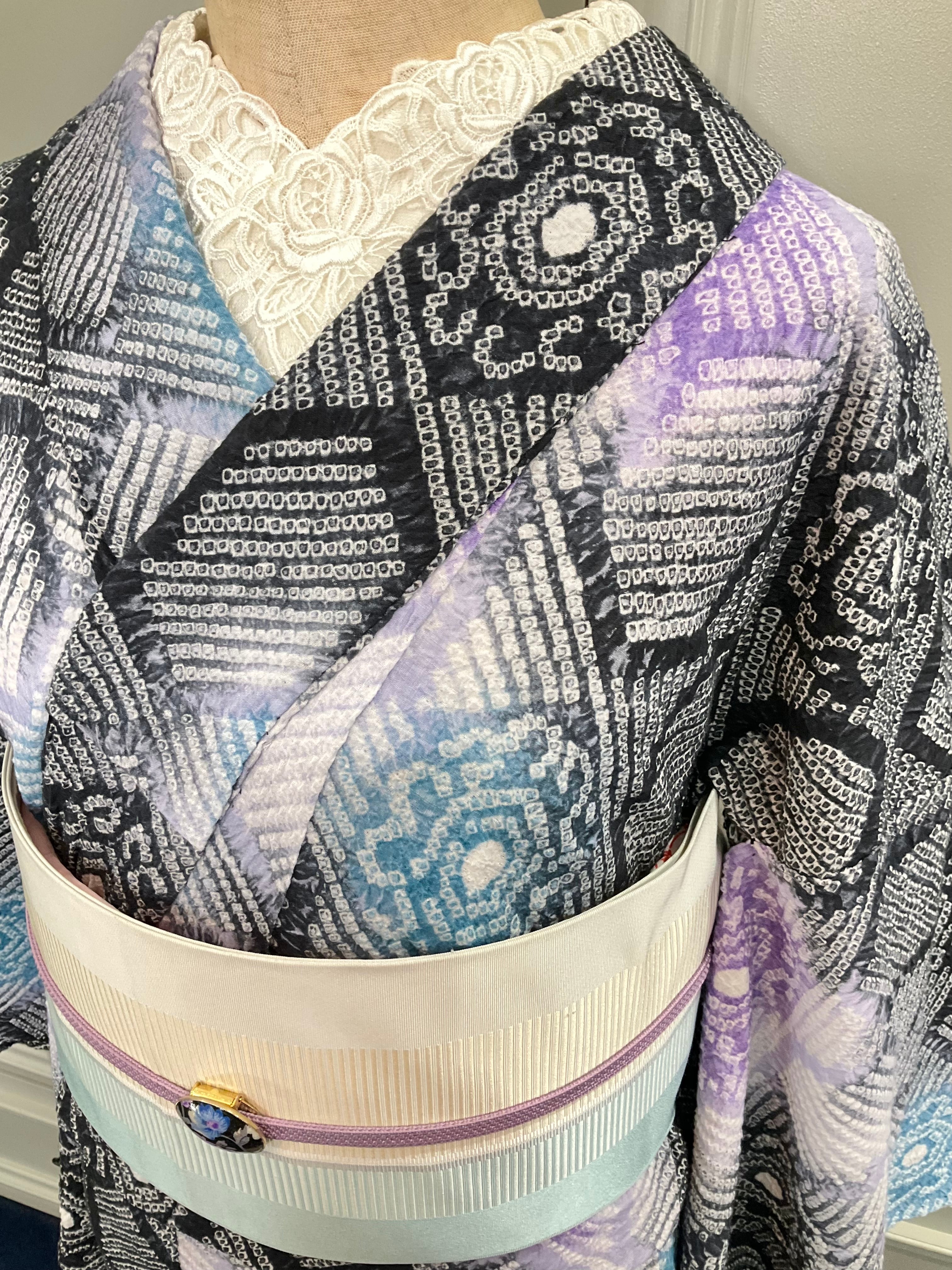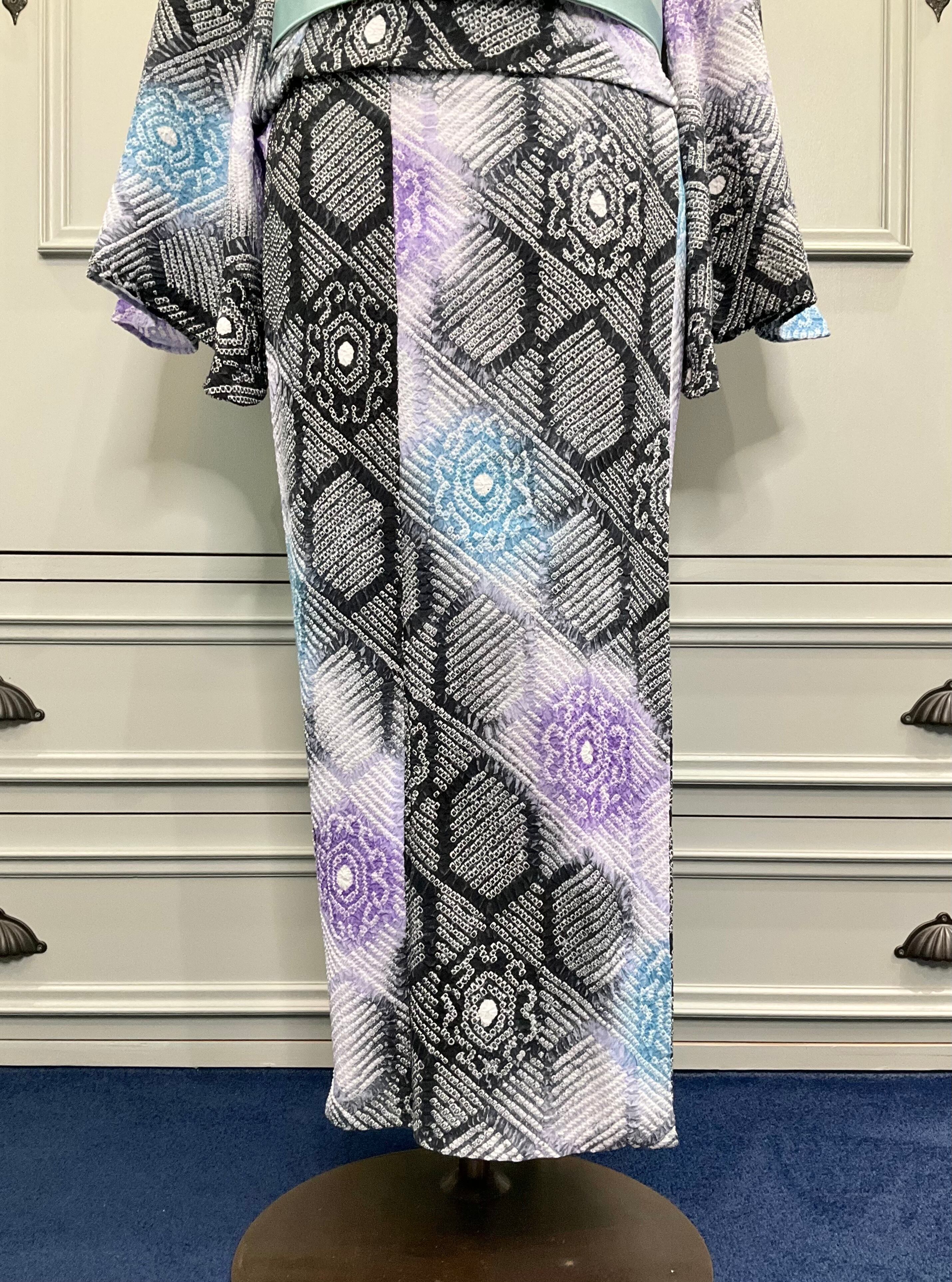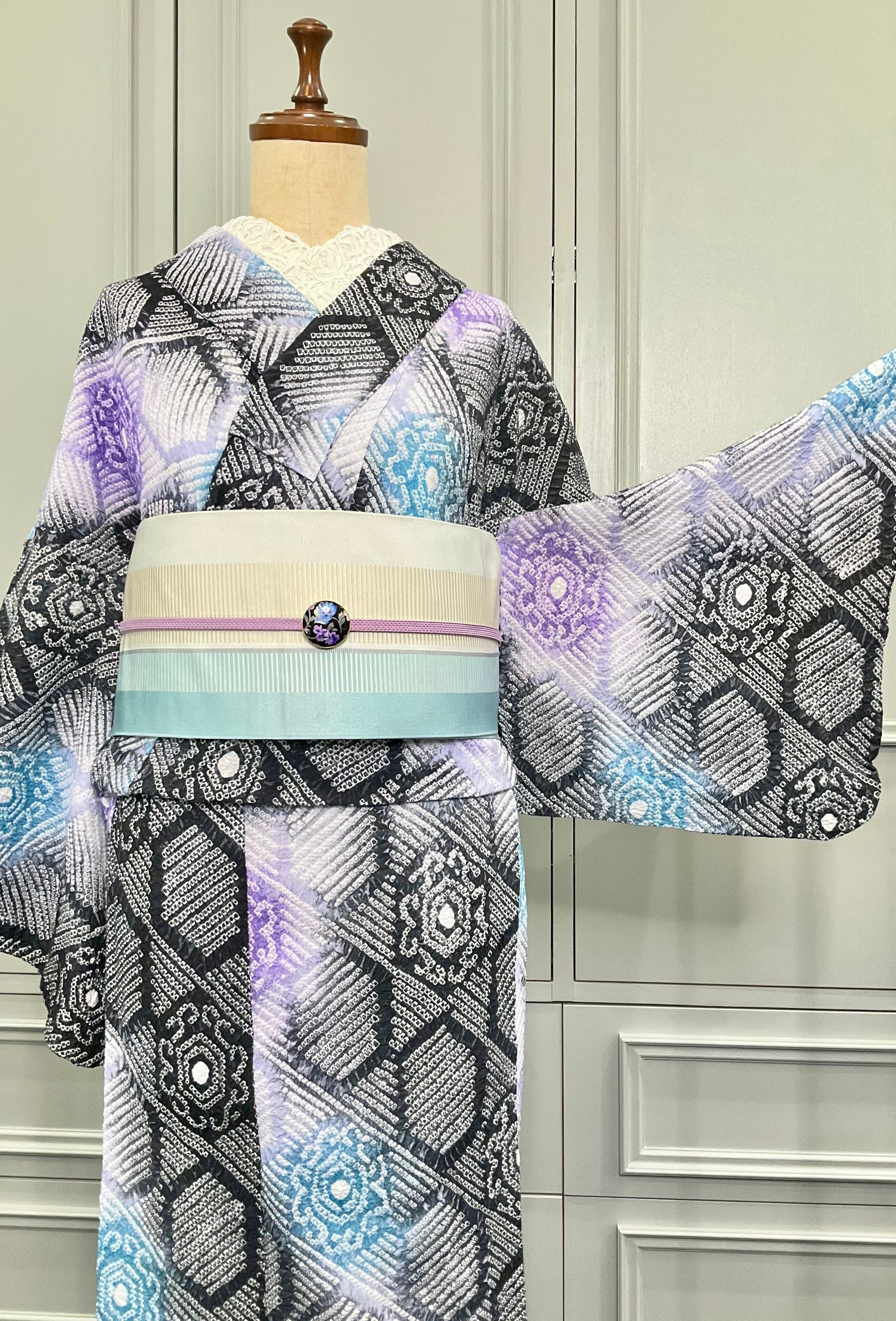 モノトーンカラーの地色の中に、彩られた明るいブルーやパープルのお色が綺麗なこちらの絞り浴衣。