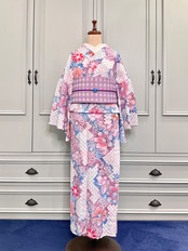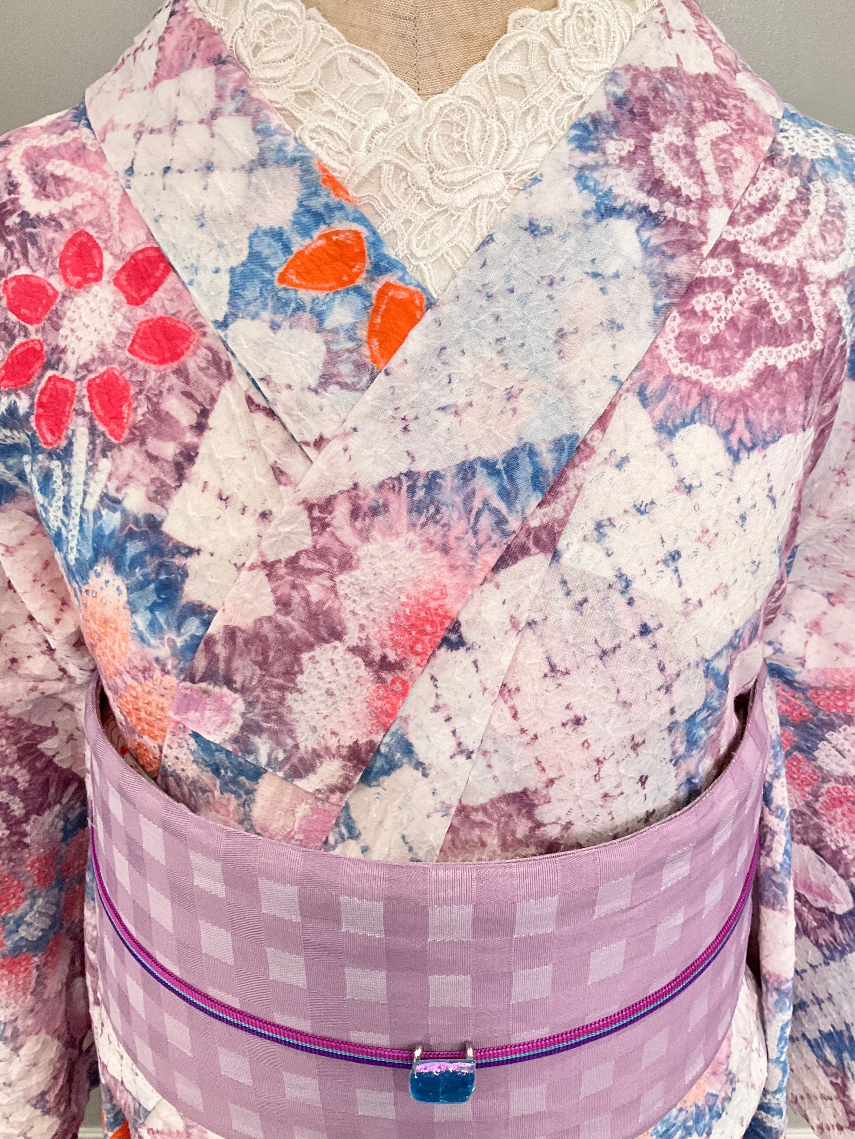ホワイト×モーブピンク系×ブルー系の地色に、花模様がデザインされた、有松鳴海絞り浴衣です♪