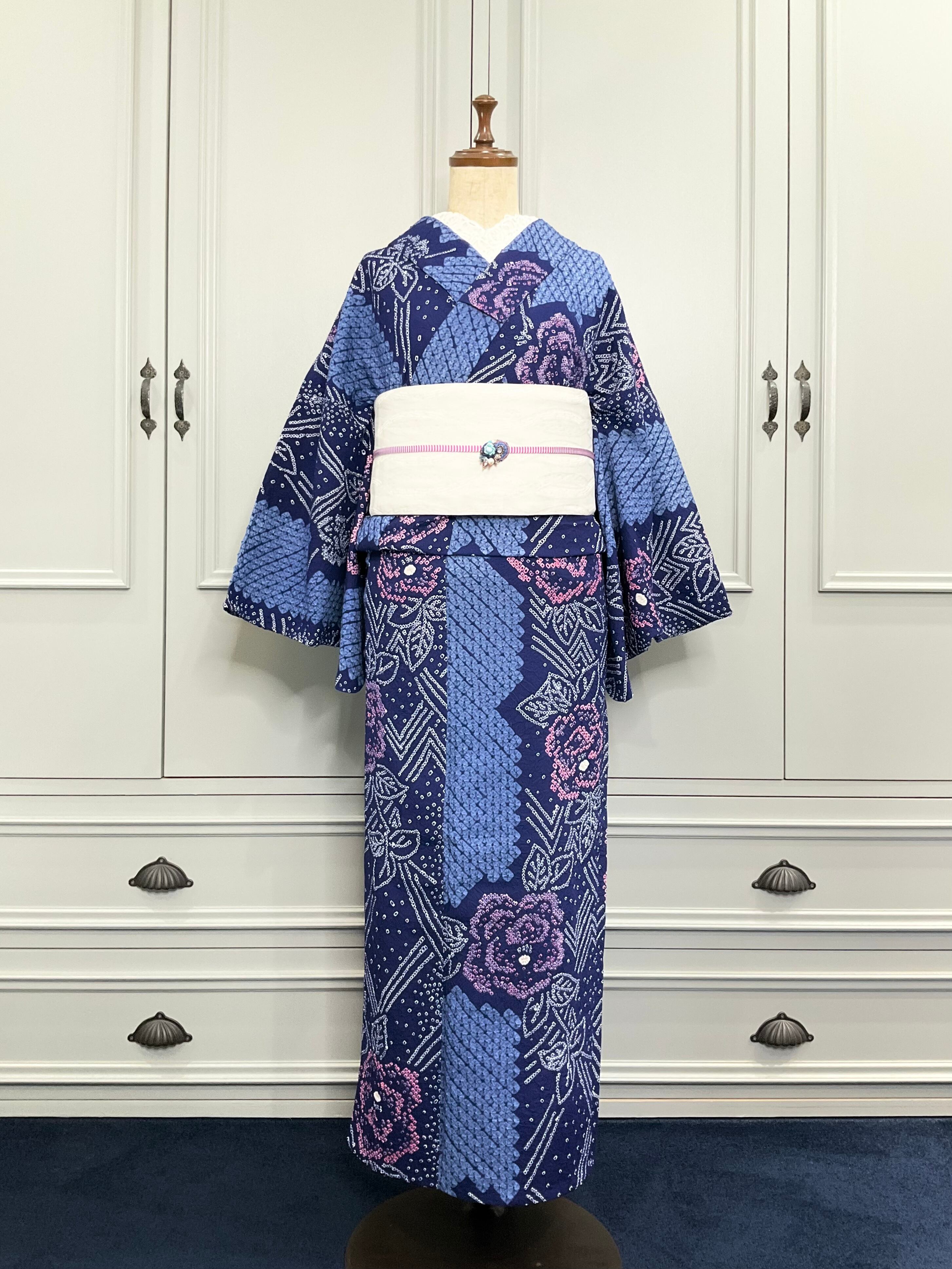 ロング*有松鳴海絞り浴衣*薔薇と水中花 0902