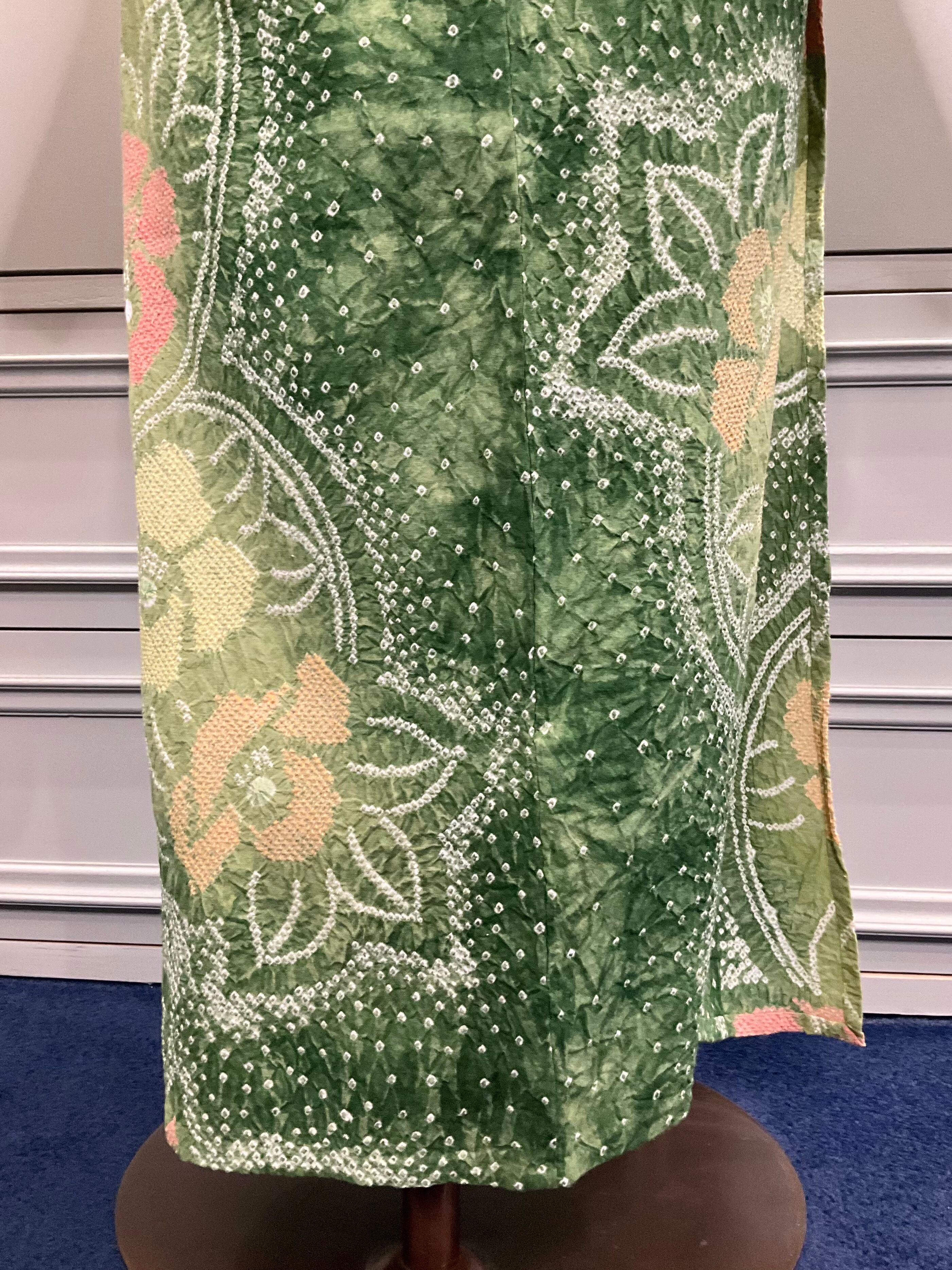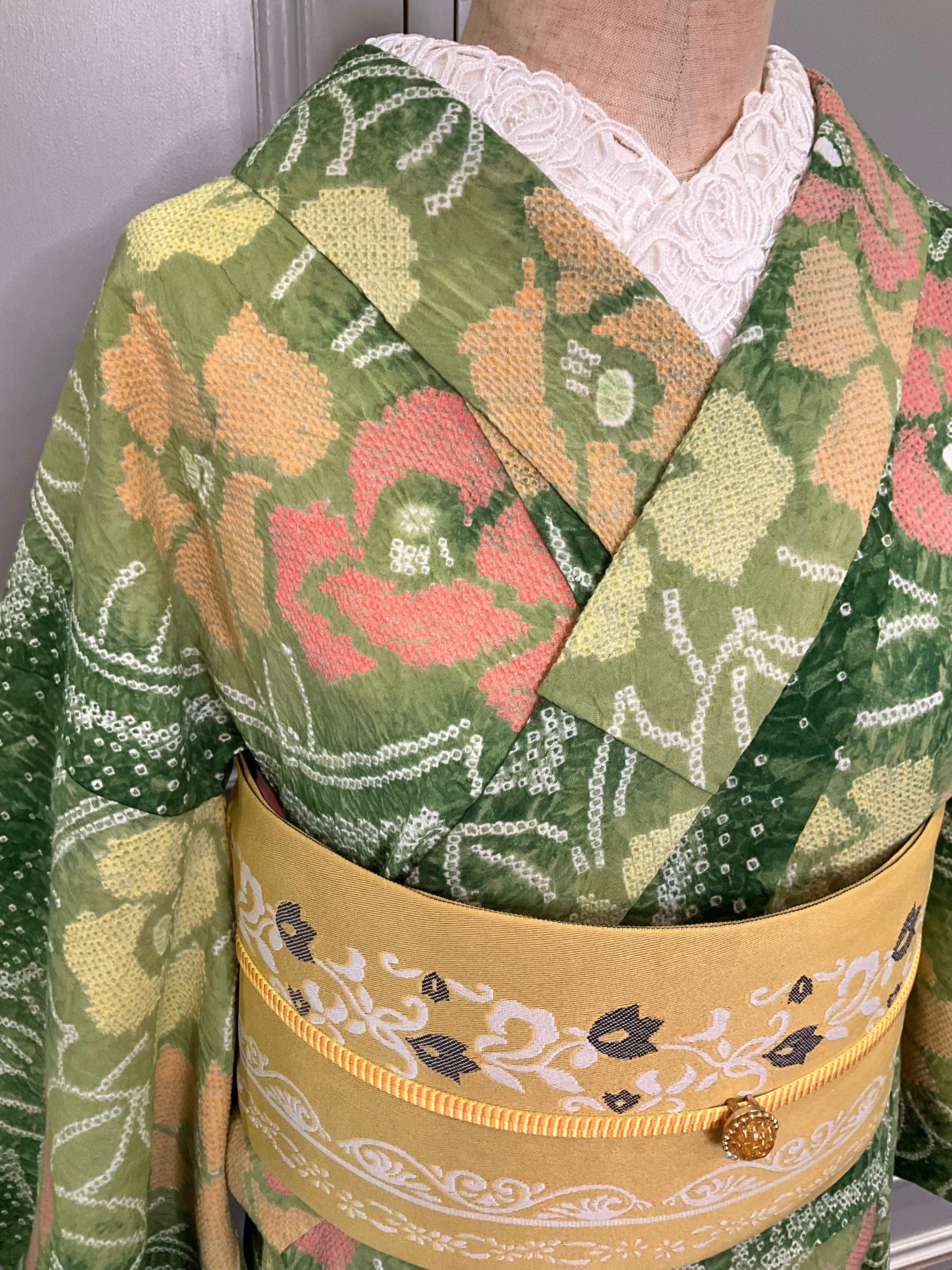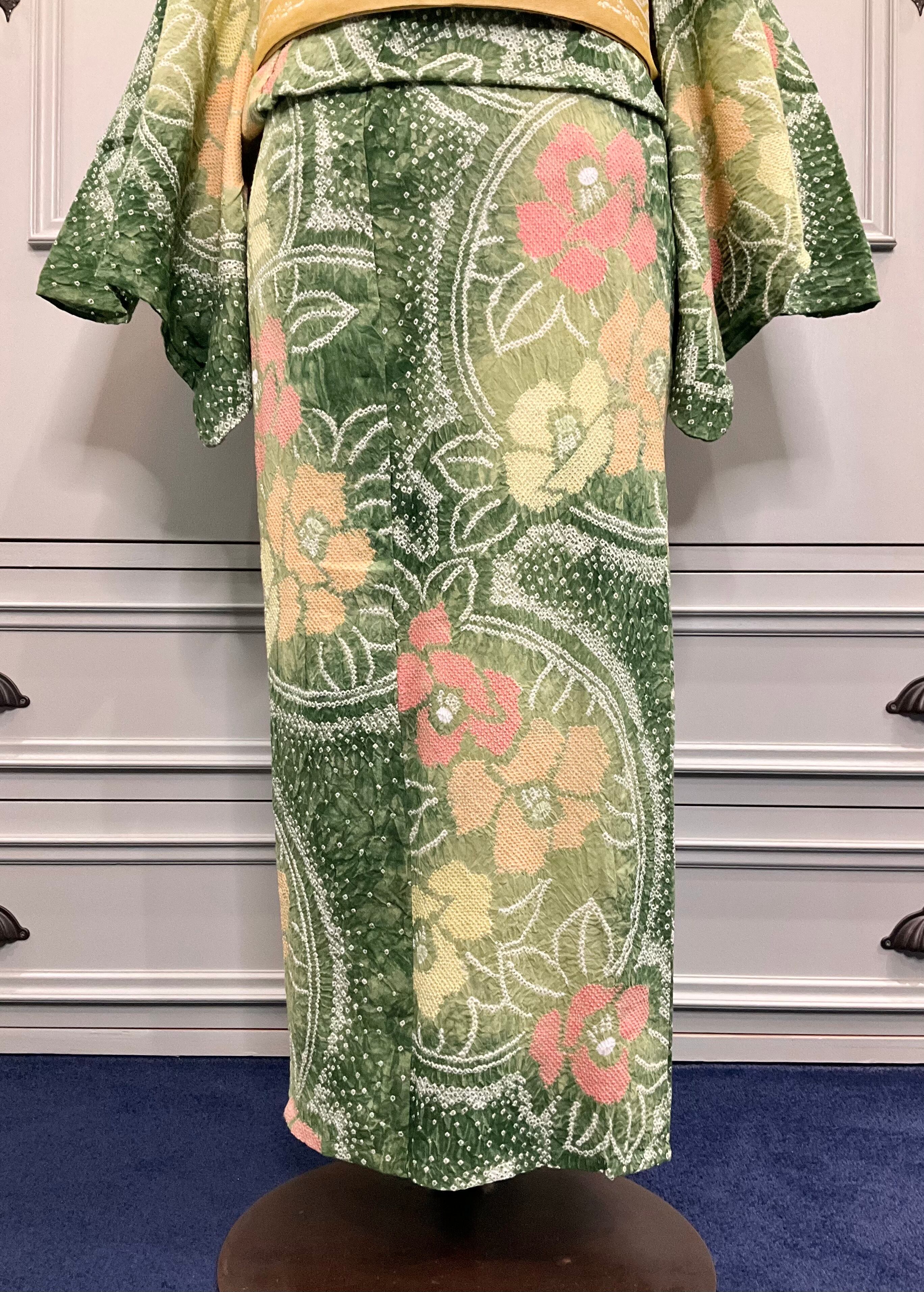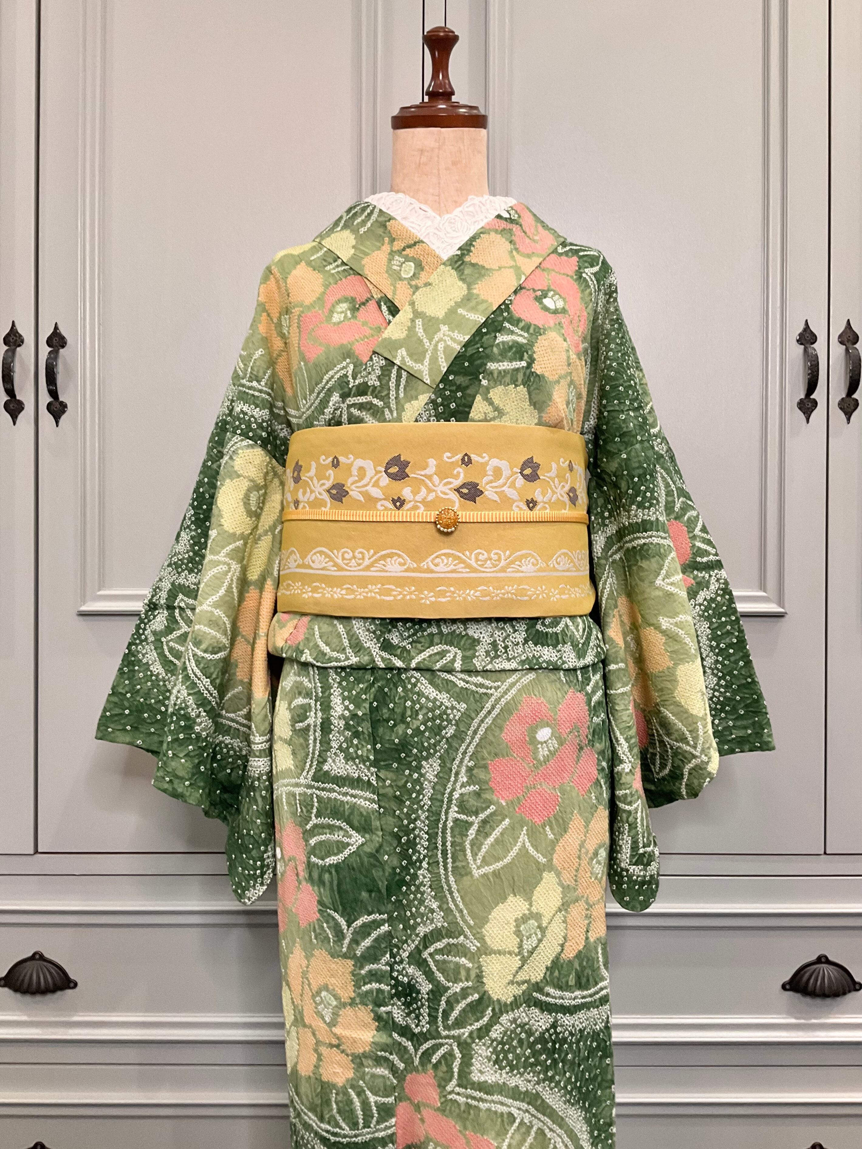 グリーン系の地色に、花模様がデザインされた、有松鳴海絞り浴衣です♪