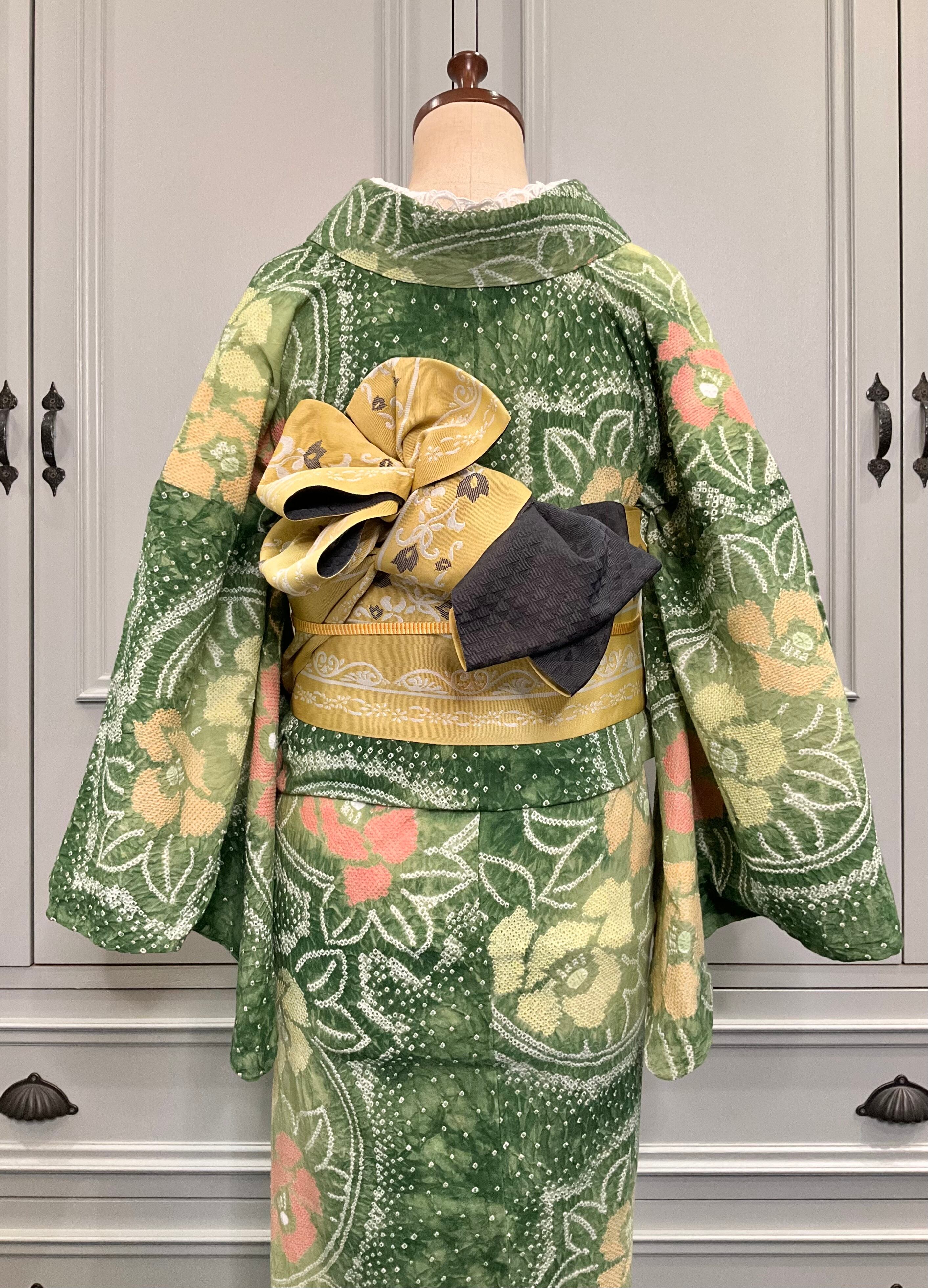 少しくすみカラーで、濃淡のあるグリーンが、お抹茶ラテのようなカラーのこちらの絞り浴衣。