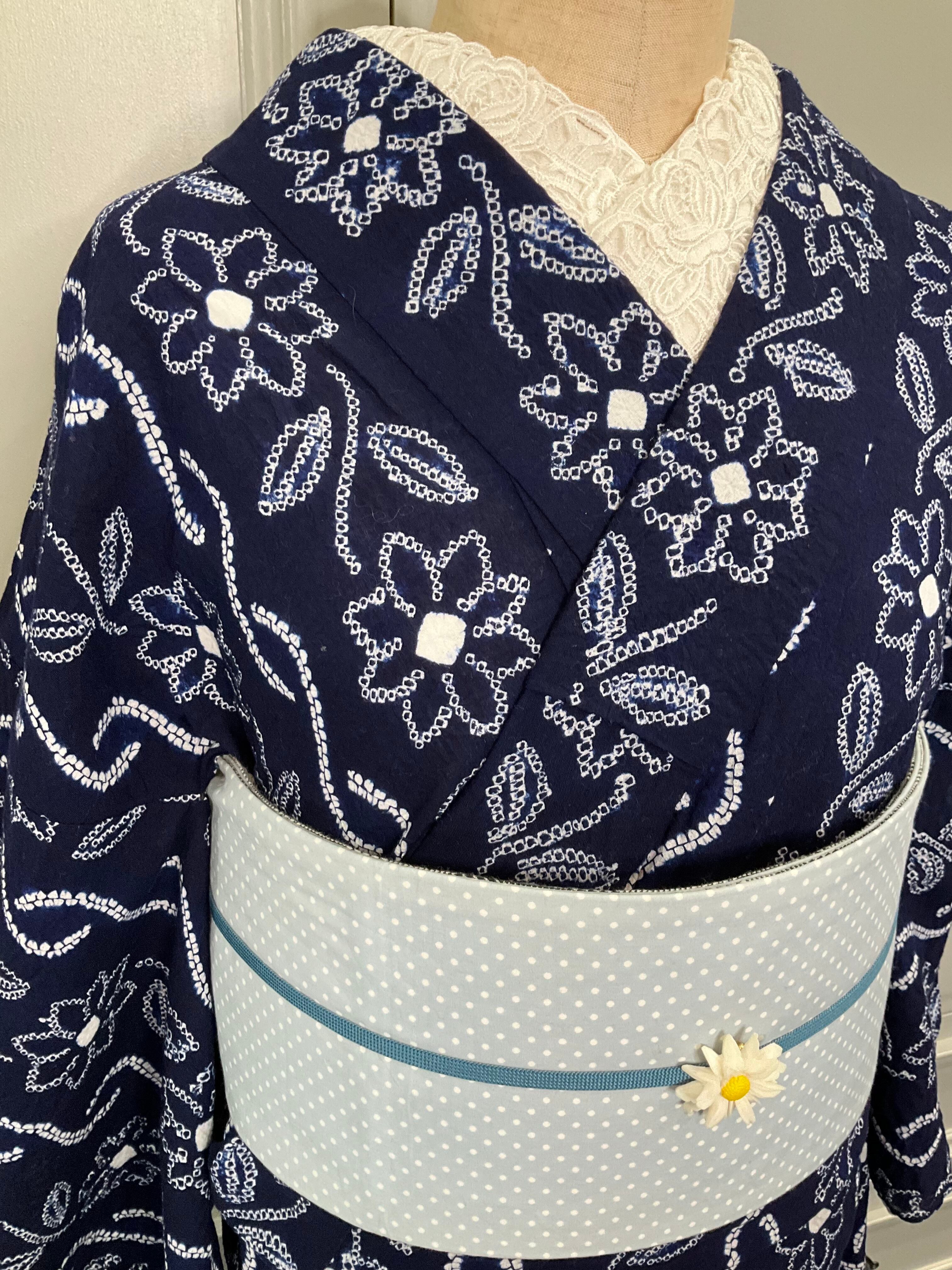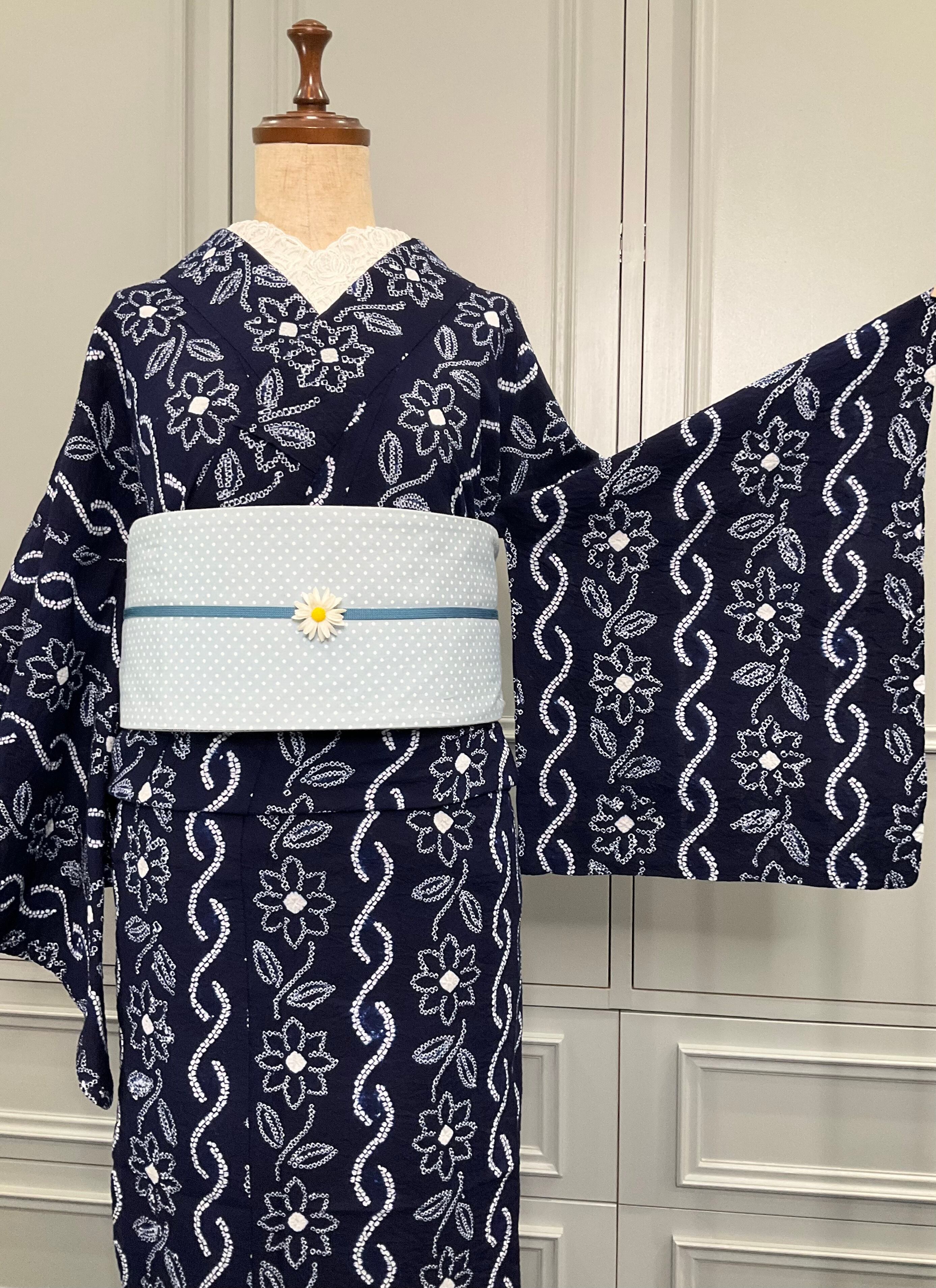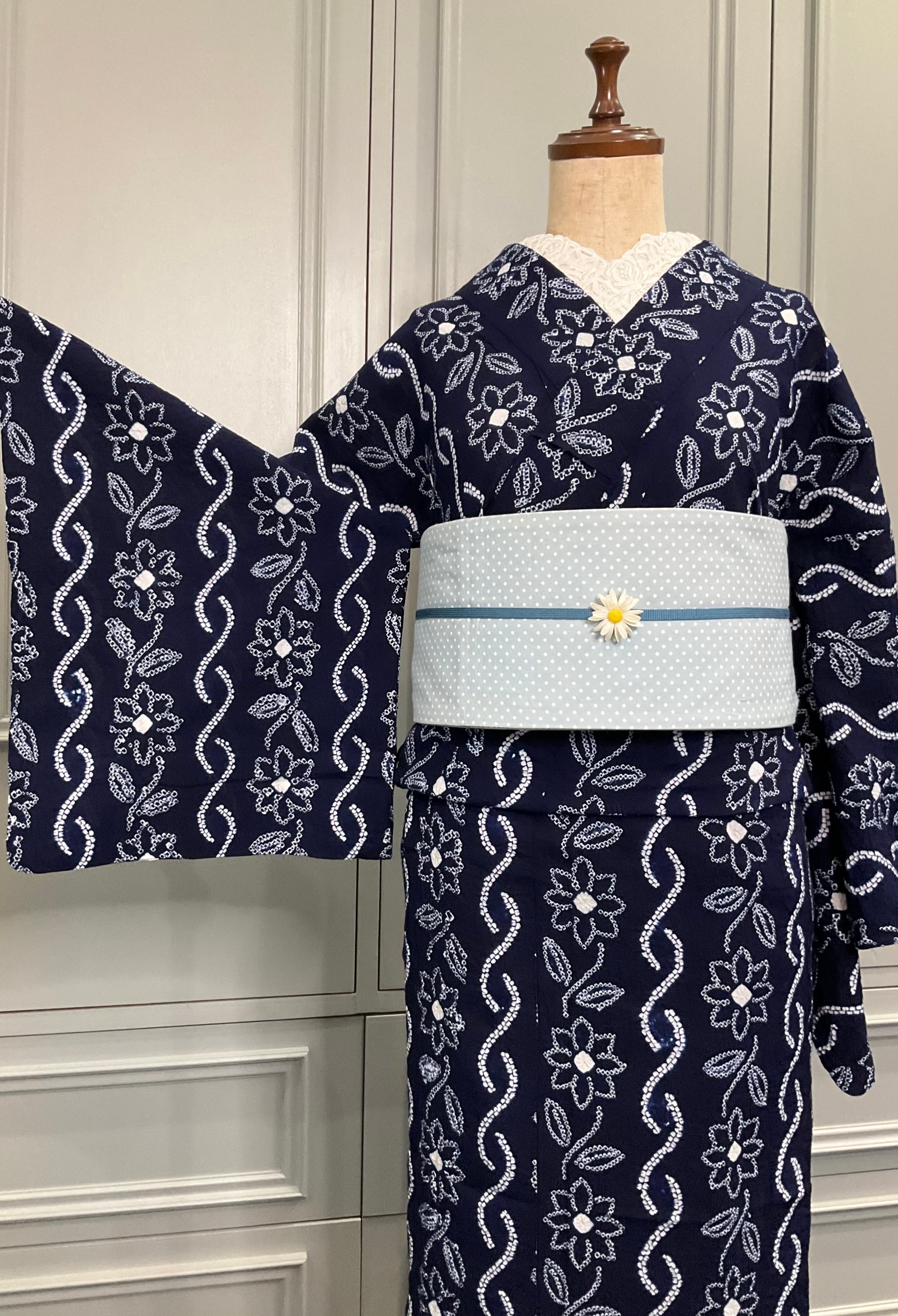藍色の地色に、花模様がデザインされた、有松鳴海絞り浴衣です♪