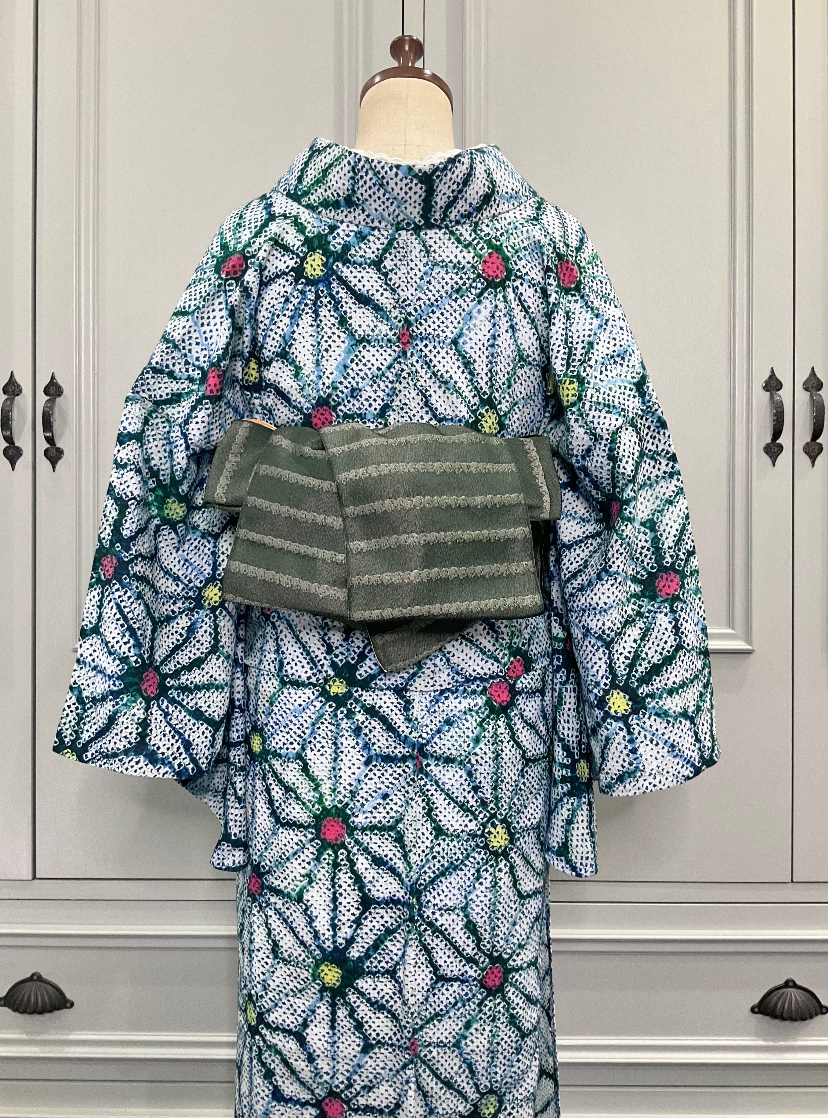 ホワイトの抜け感がスッキリとした地色に、ブルー系やグリーン系のグラデーションで彩られた、麻の葉の模様が全体に描かれた、こちらの絞り浴衣。