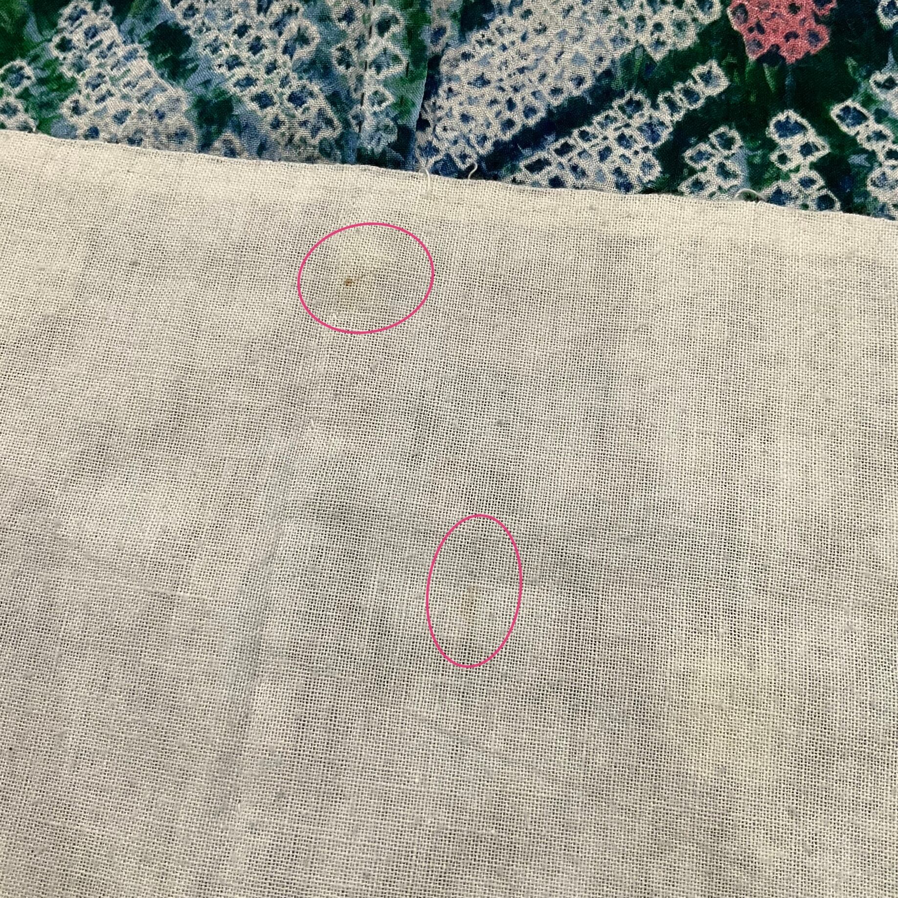 居敷当て・衿(中心に近いところ)・左外袖(上部)に、目立ちにくいですが、うっすら小さな変色有り。