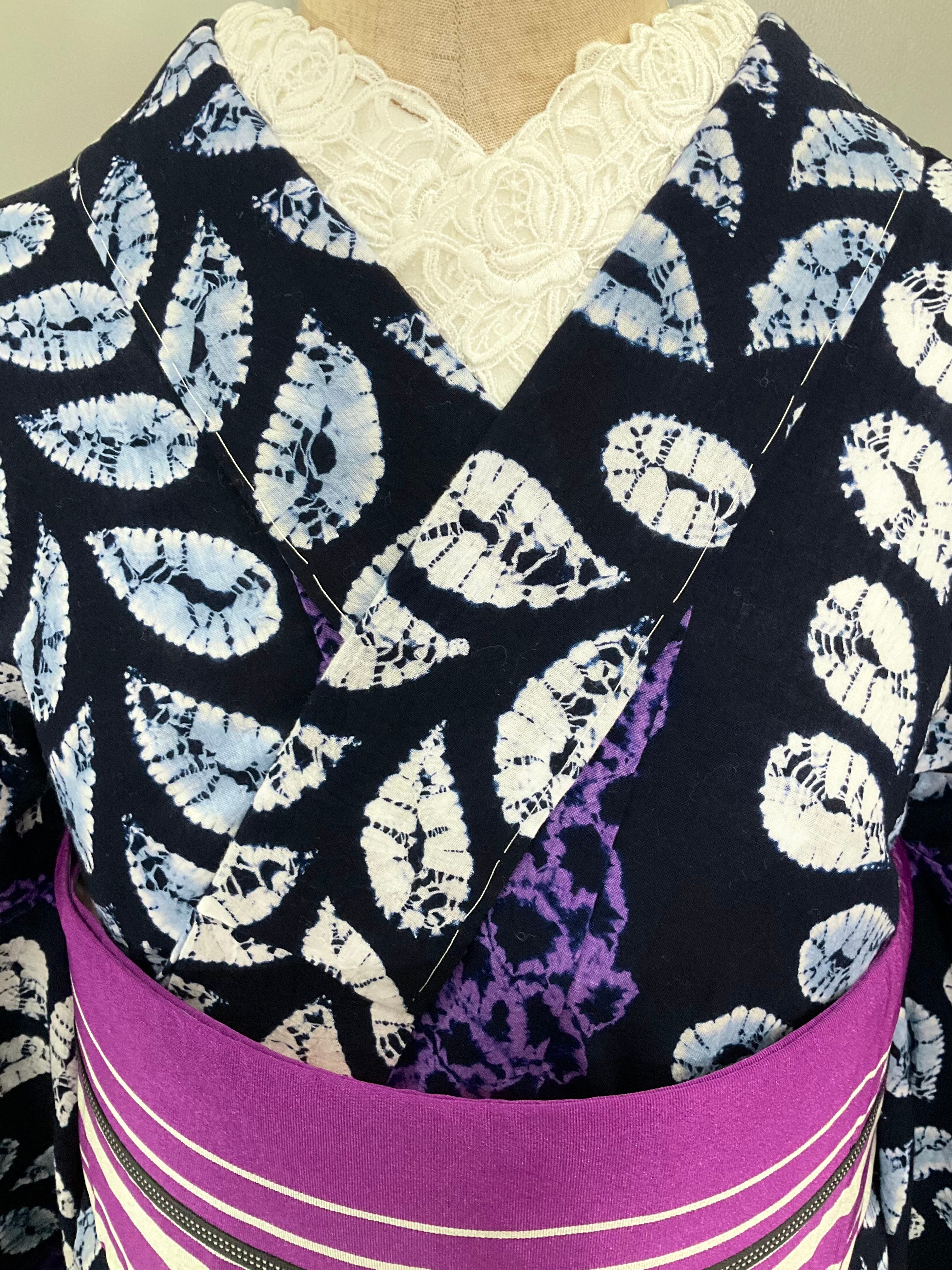 絞り浴衣は衿を入れて着ると単衣として着ていただける為、残暑厳しい秋口まで、まだまだ着ていただけますよ♪