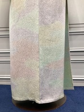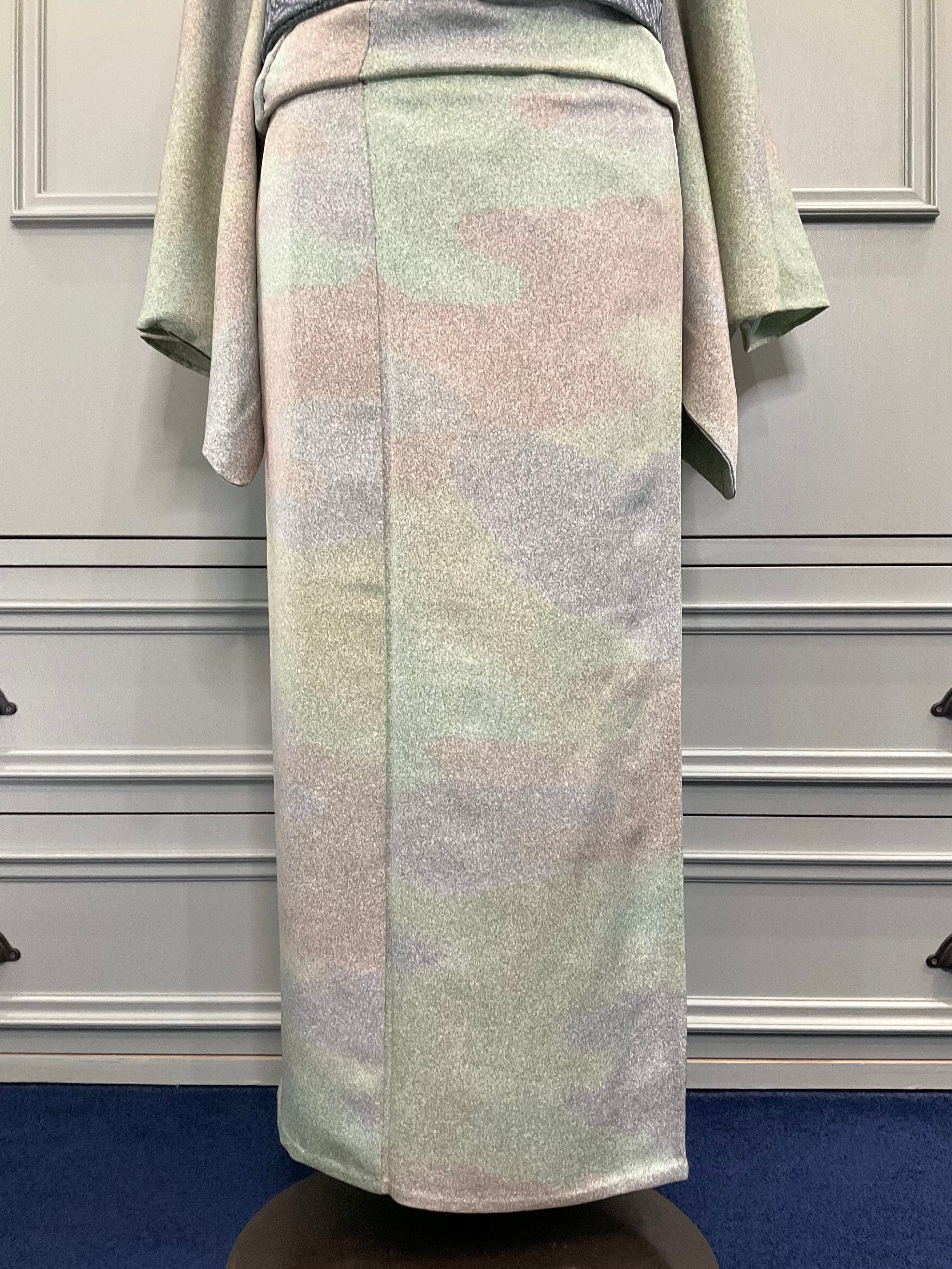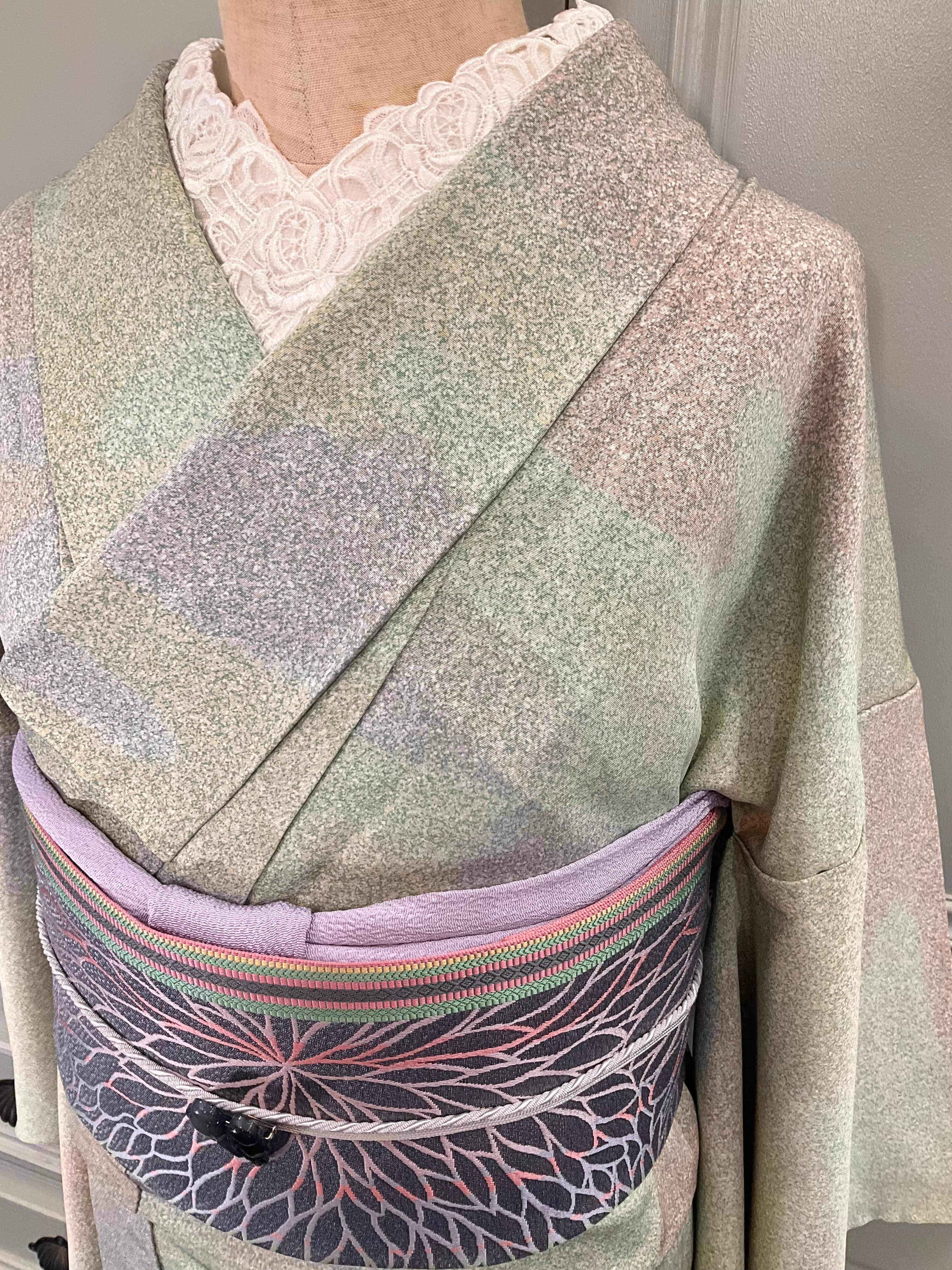 グリーン系、パープル系、イエロー系、ピンク系の複数のカラーの組み合わせと、蒔糊散らしのようなデザインが綺麗なこちらのお着物。