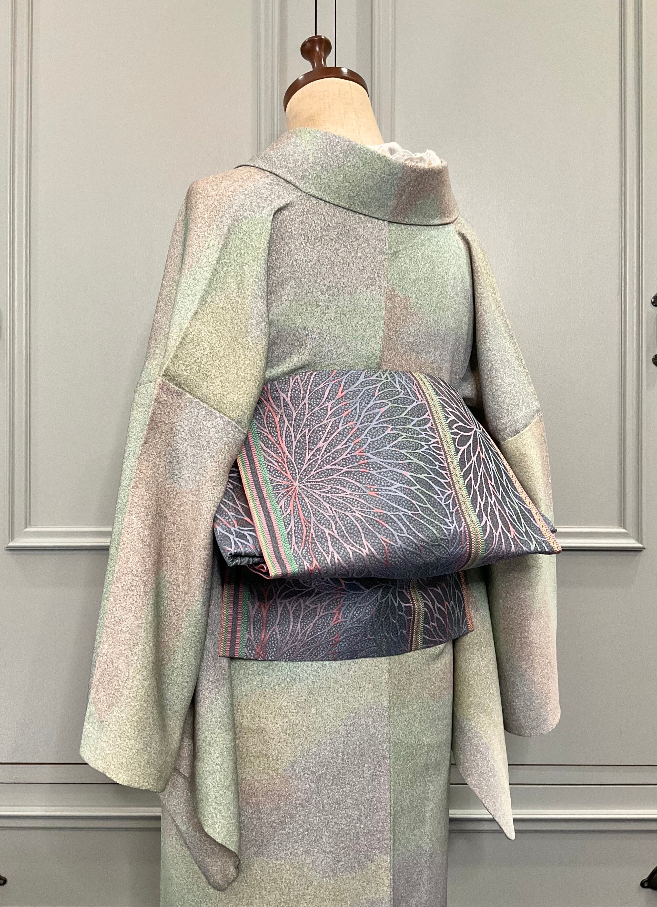 帯の縁には左右お色が違ったラインが入っており、また真ん中の右側寄りにも1本ラインが入っていることによって、右回しに締めた時と、左回しに締めた時では、胴回り部分の柄の出方が変わるんです♪