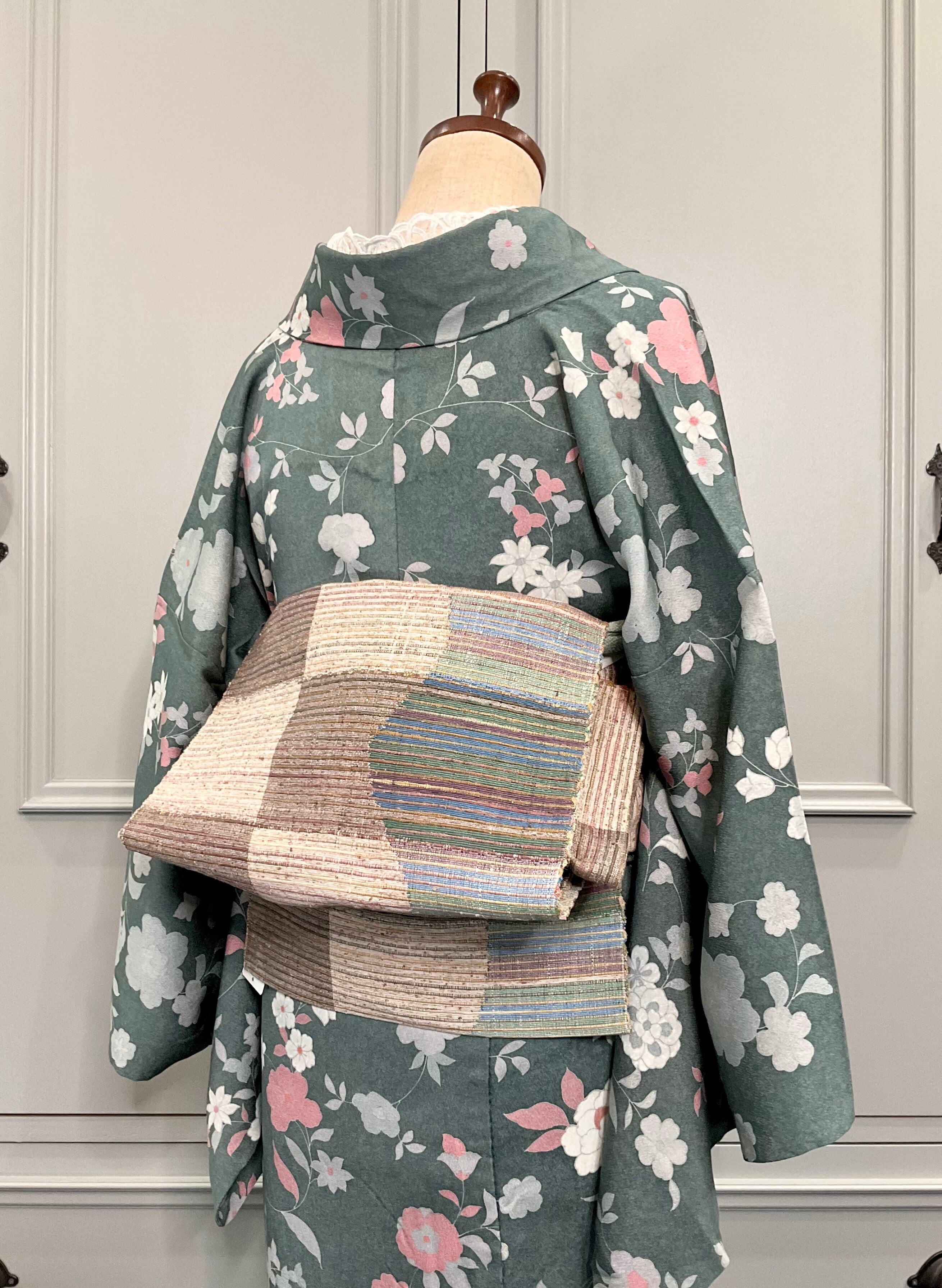 あまり柄が主張しないデザインですので、着物に柄のものを合わせていただいても、バランス良くコーディネートしていただけますし、あまり柄が無いお着物と合わせると、帯のデザインが引き立ち、コーディネートのアクセントになって、素敵だと思います♡