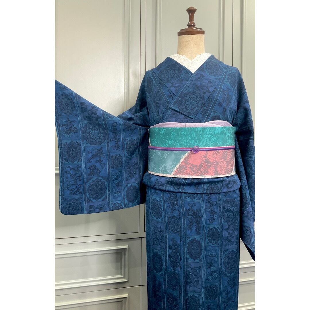 近くで見ると、微妙に違う複数のブルー系のお色で彩られ、オリエンタルなデザインがオシャレなこちらのお着物。