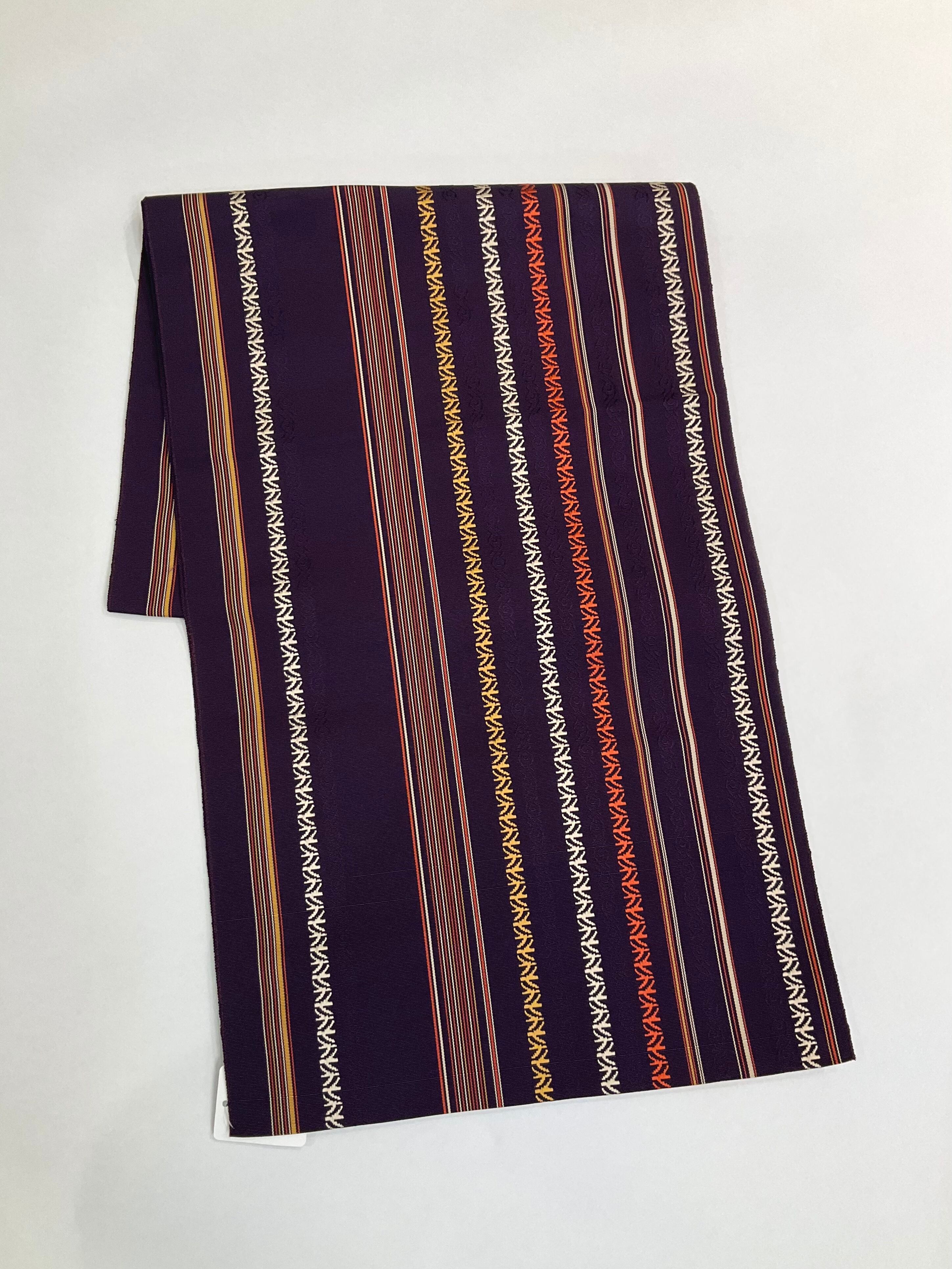 パープル系の地色に、レッド系、イエロー系、ホワイト系などの差し色が素敵な、博多織八寸名古屋帯(松葉仕立て)です♪