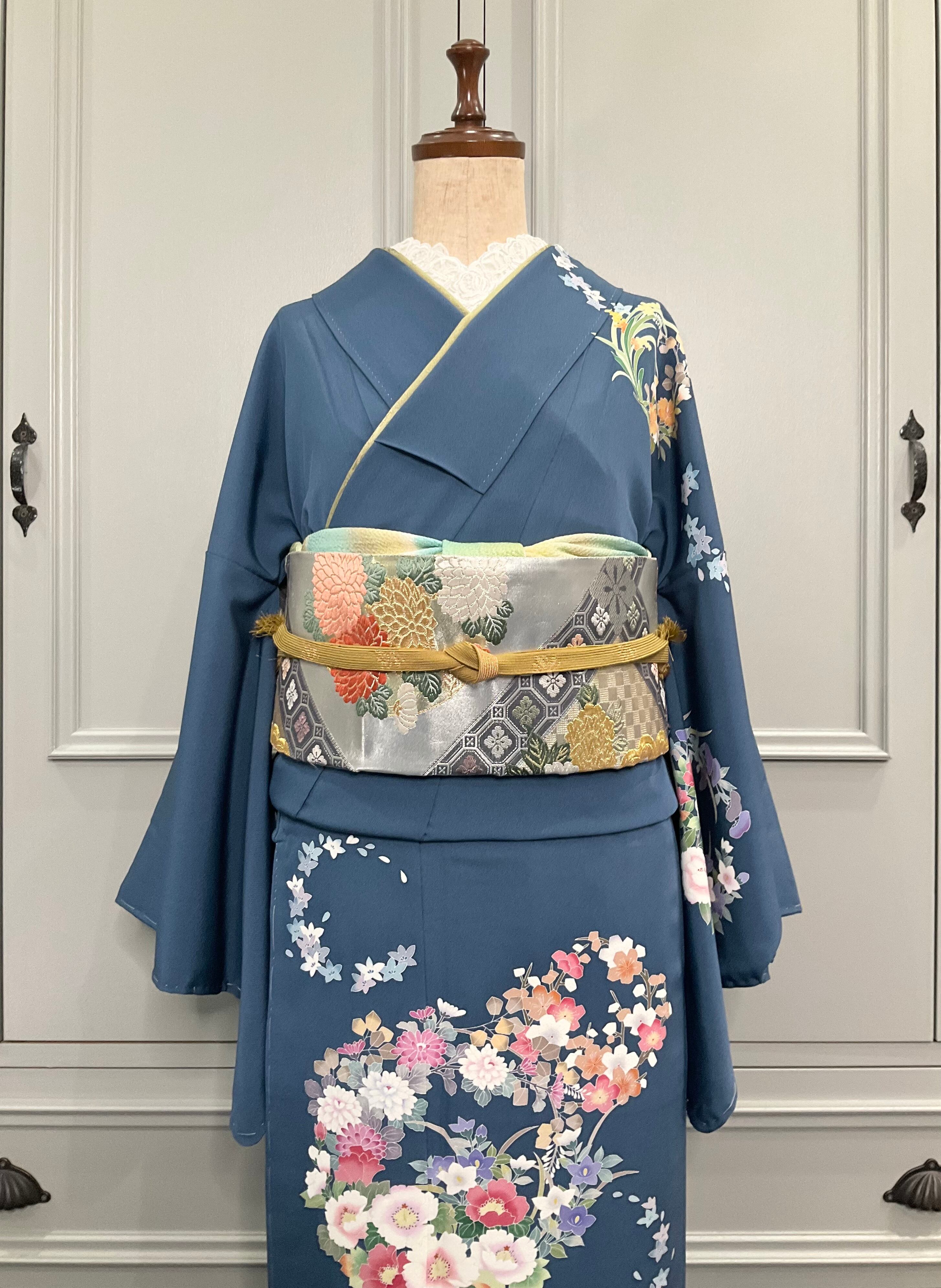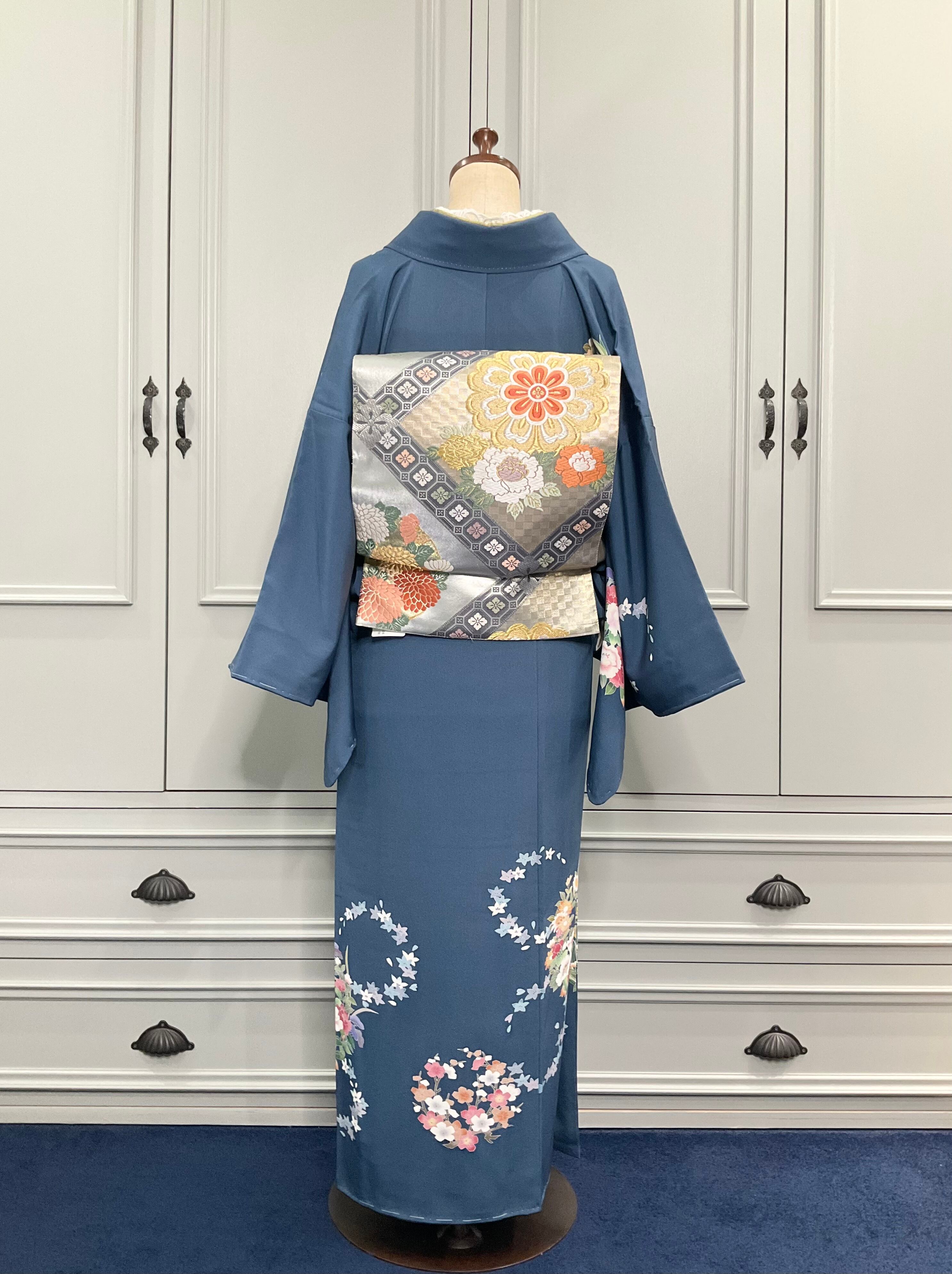 少しグレーがかった、スモーキーなブルーのお色が上品でオシャレなこちらのお着物。