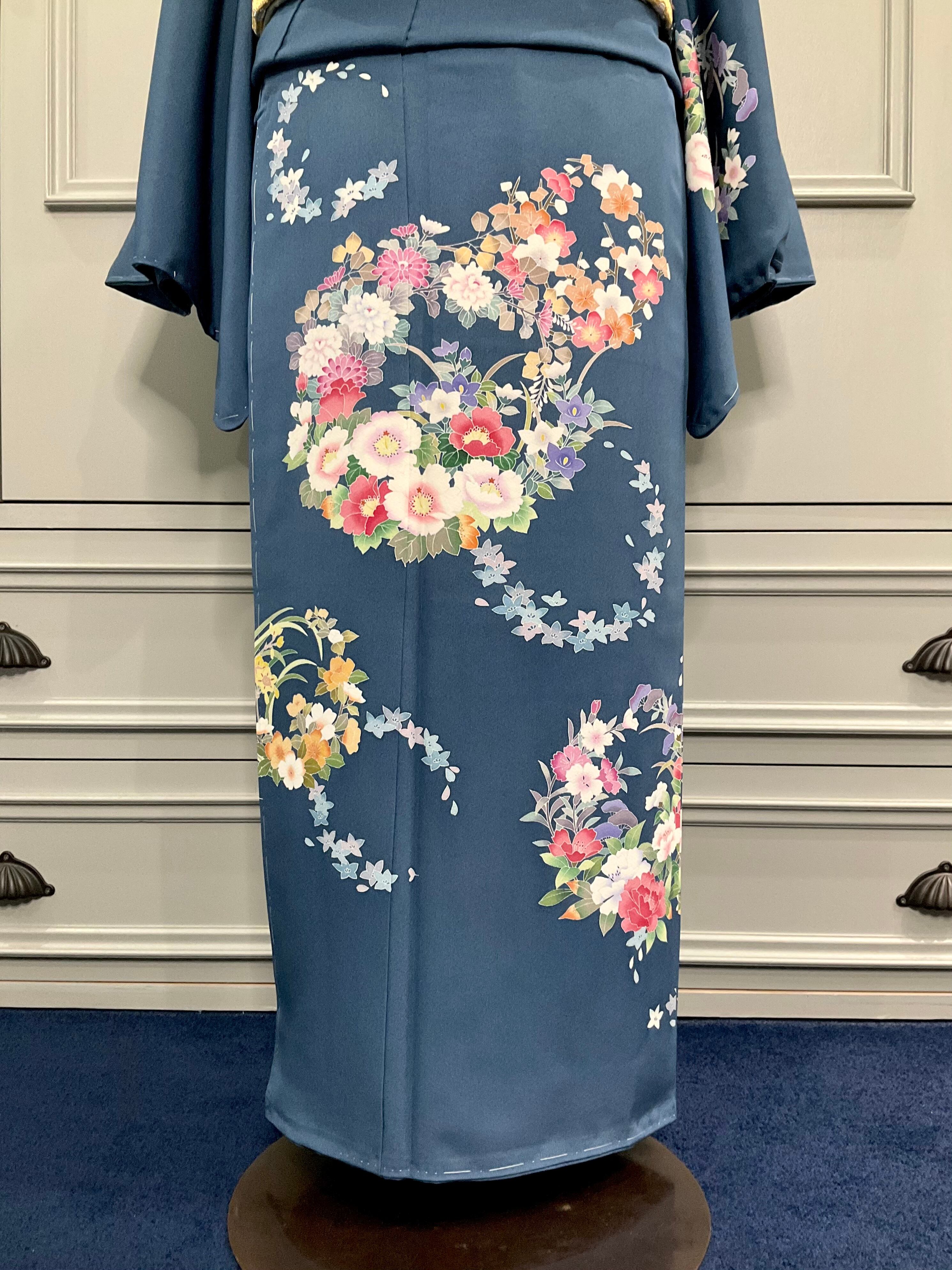 ロング*サラテリ・ブルー 花丸文*リサイクル訪問着キモノ 0943