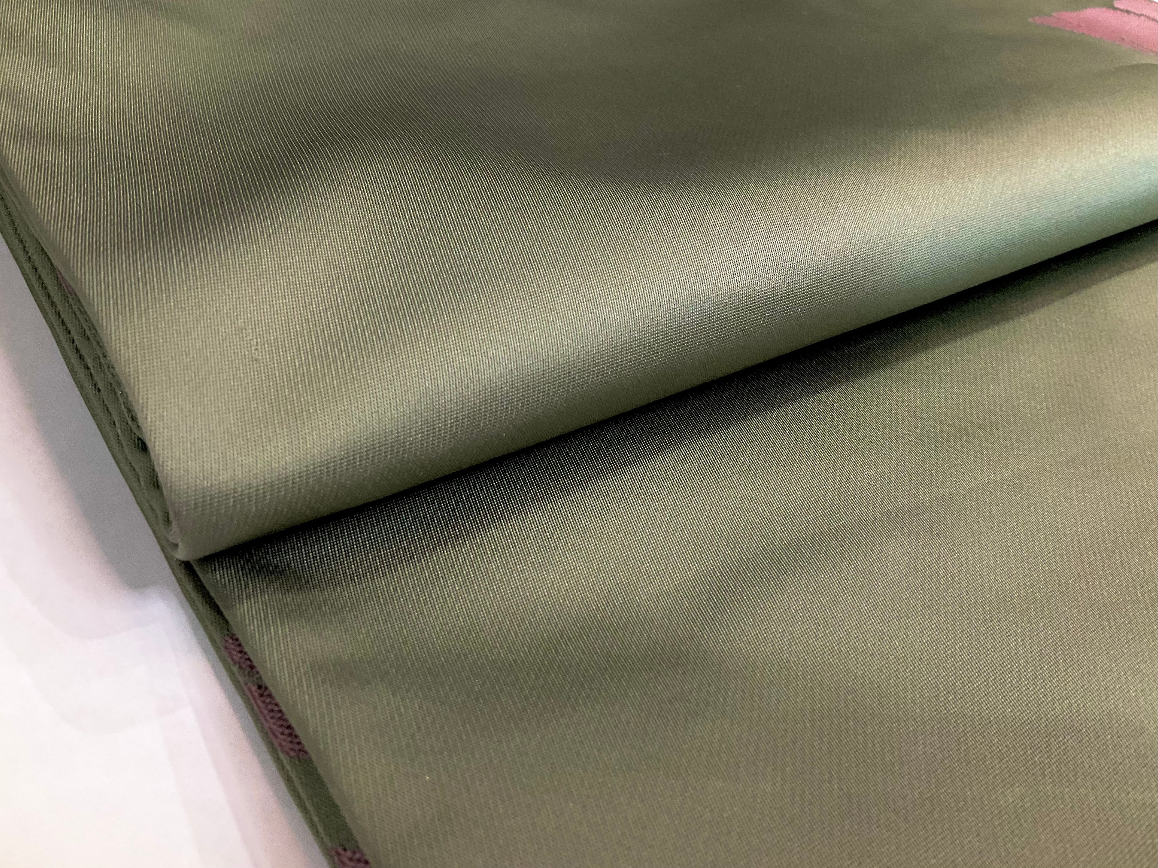 落ち着いたカーキ系の地色に、ピンク系で彩られたすずめたちが愛らしい、こちらの洒落袋帯。