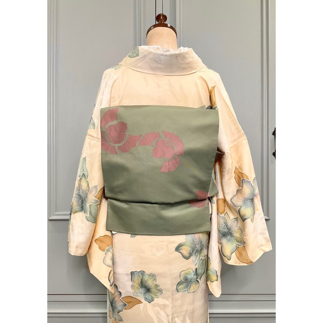 カーキ系の地色に、雀がデザインされた、洒落袋帯です♪