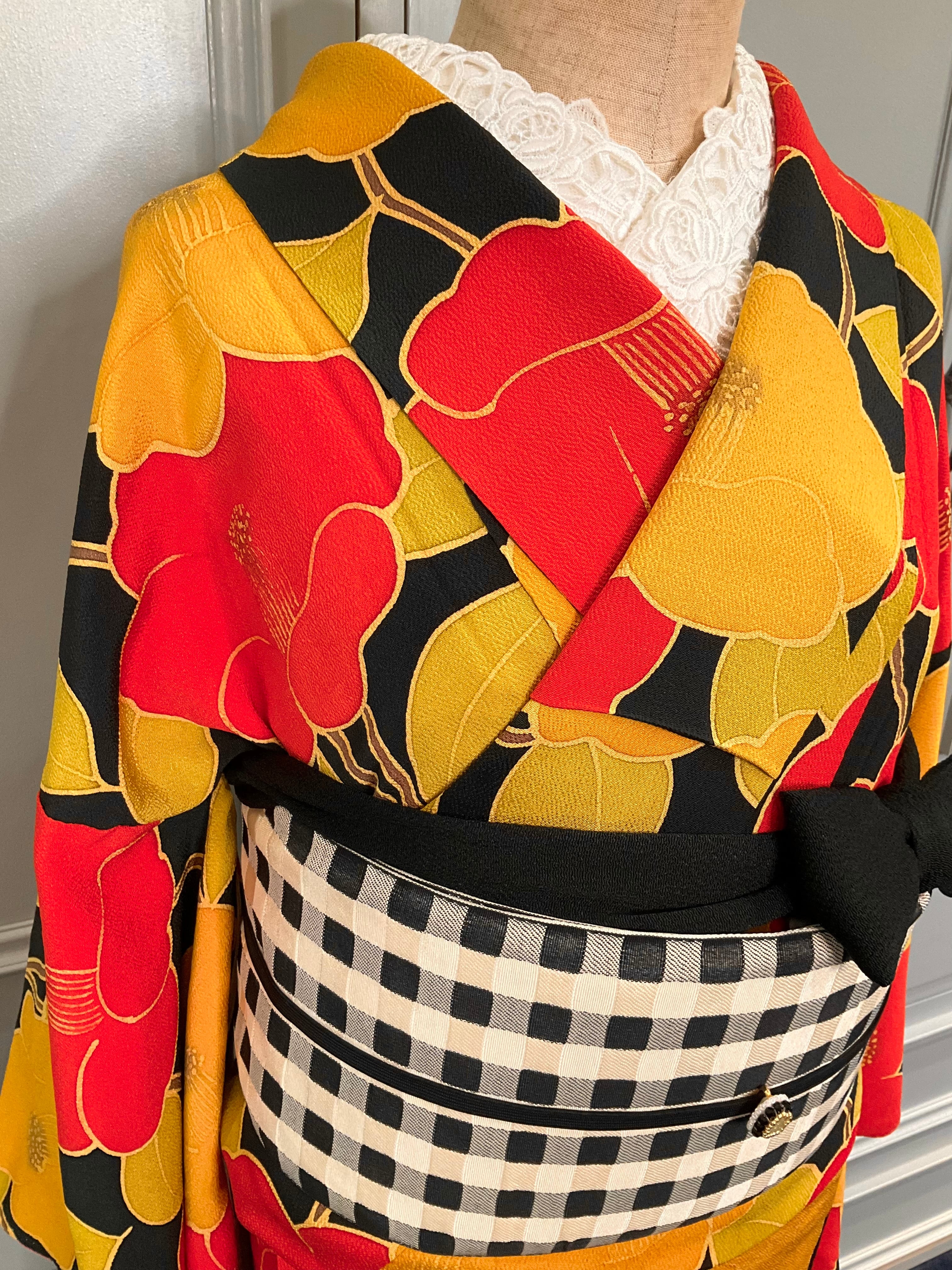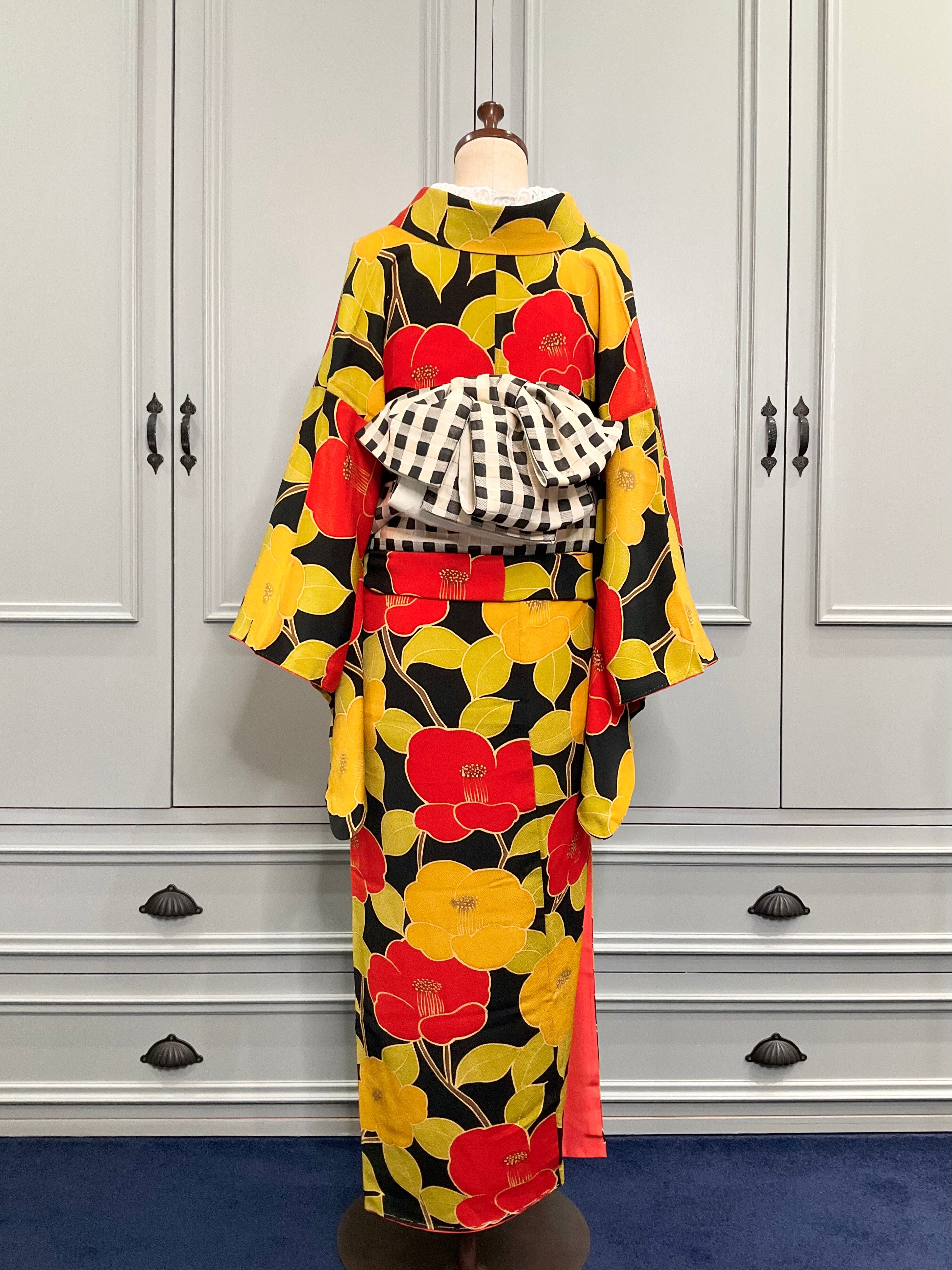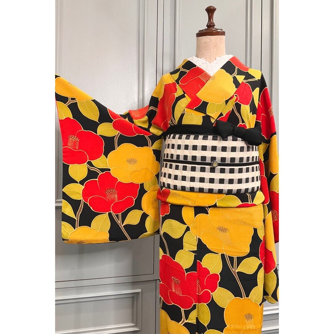 全体的に大きく描かれた、モダンなデザインの椿が華やかなので、帯をシンプルにして、着物を主役にしたコーディネートもオススメですよ♡