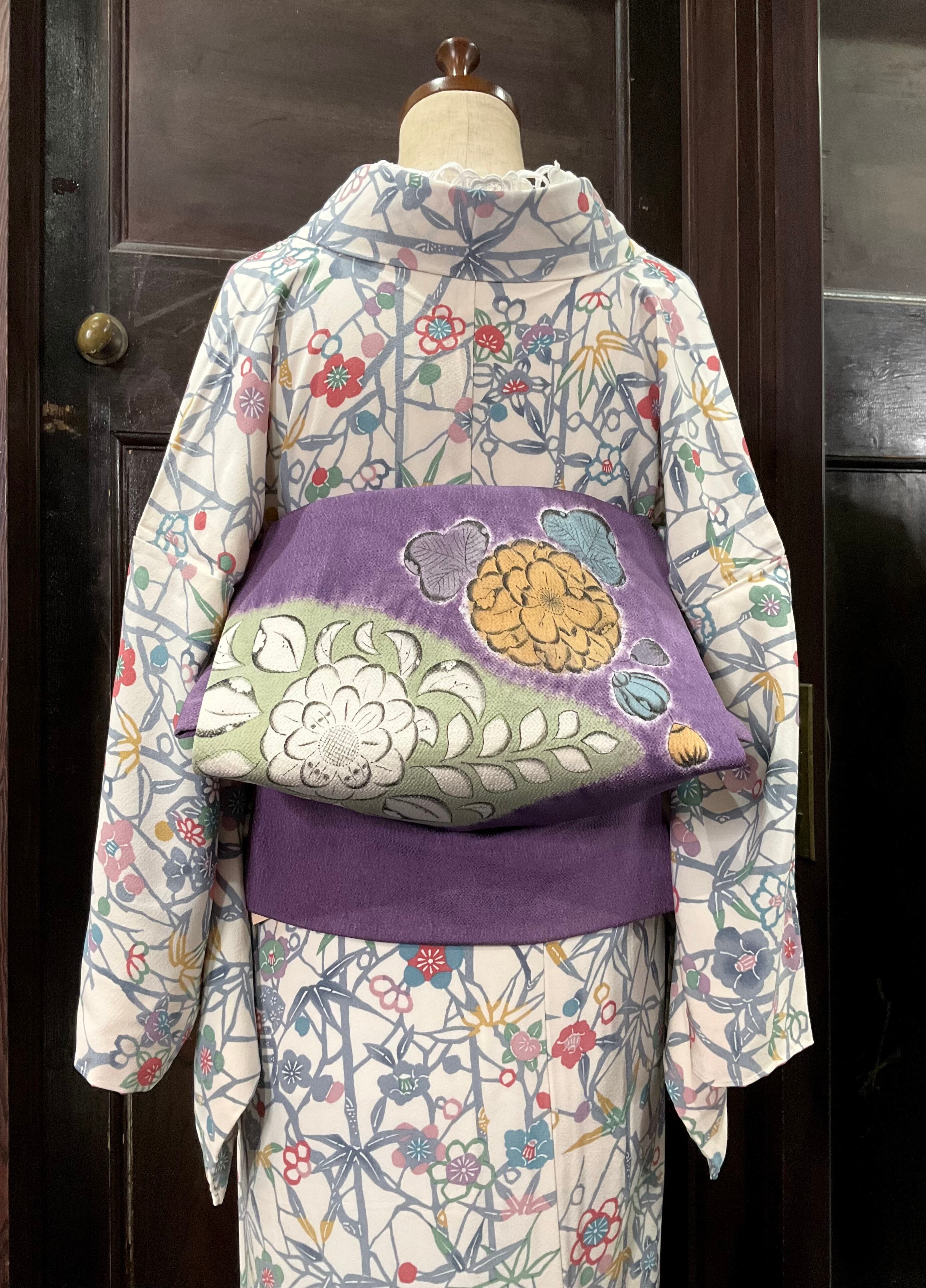 主に竹や椿柄グレーになっていることで、全体的にメリハリもあり、落ち着いた印象ですので、アイボリー系の地色ですが、秋から冬の寒い時期にもオススメです^^