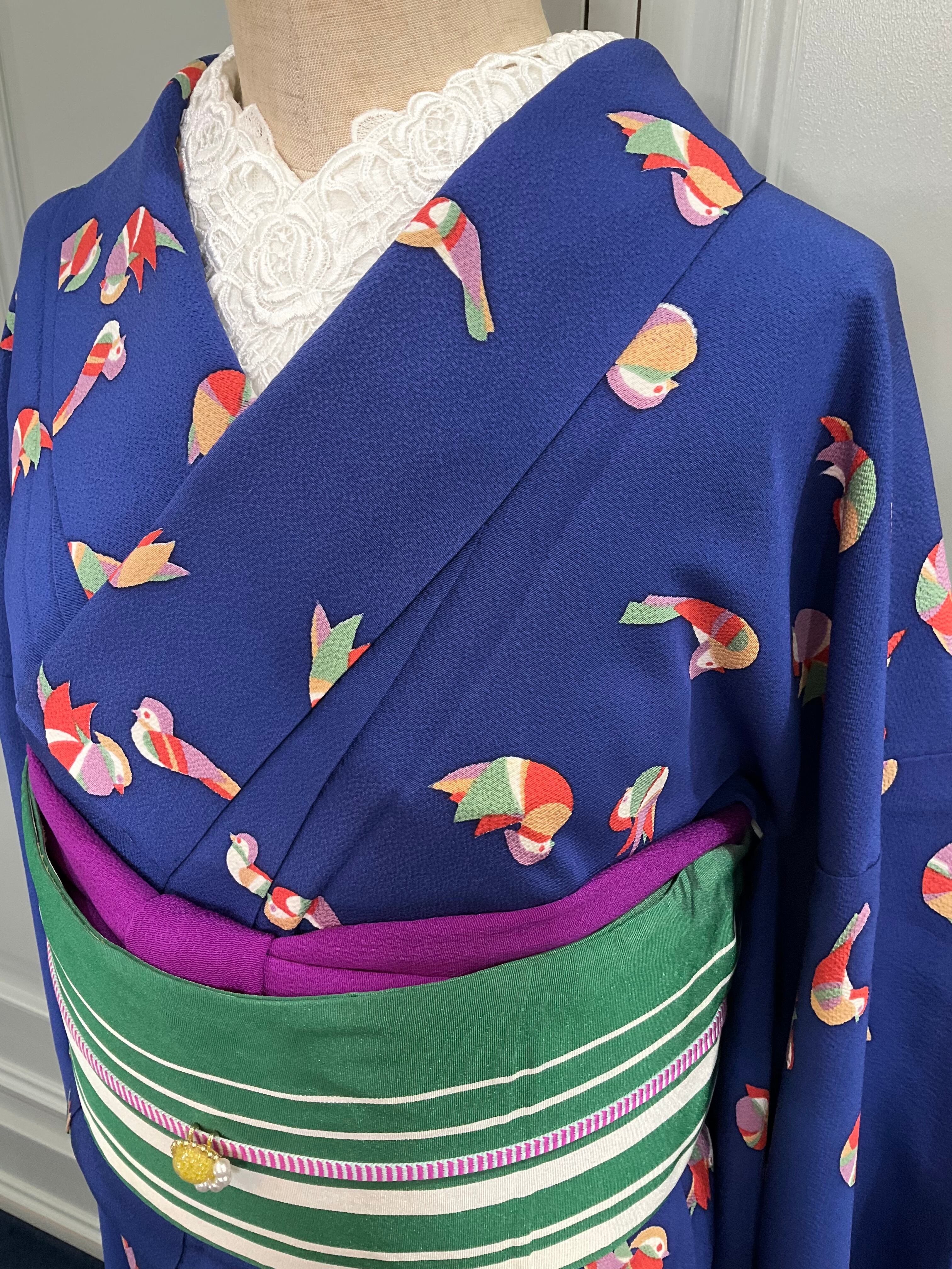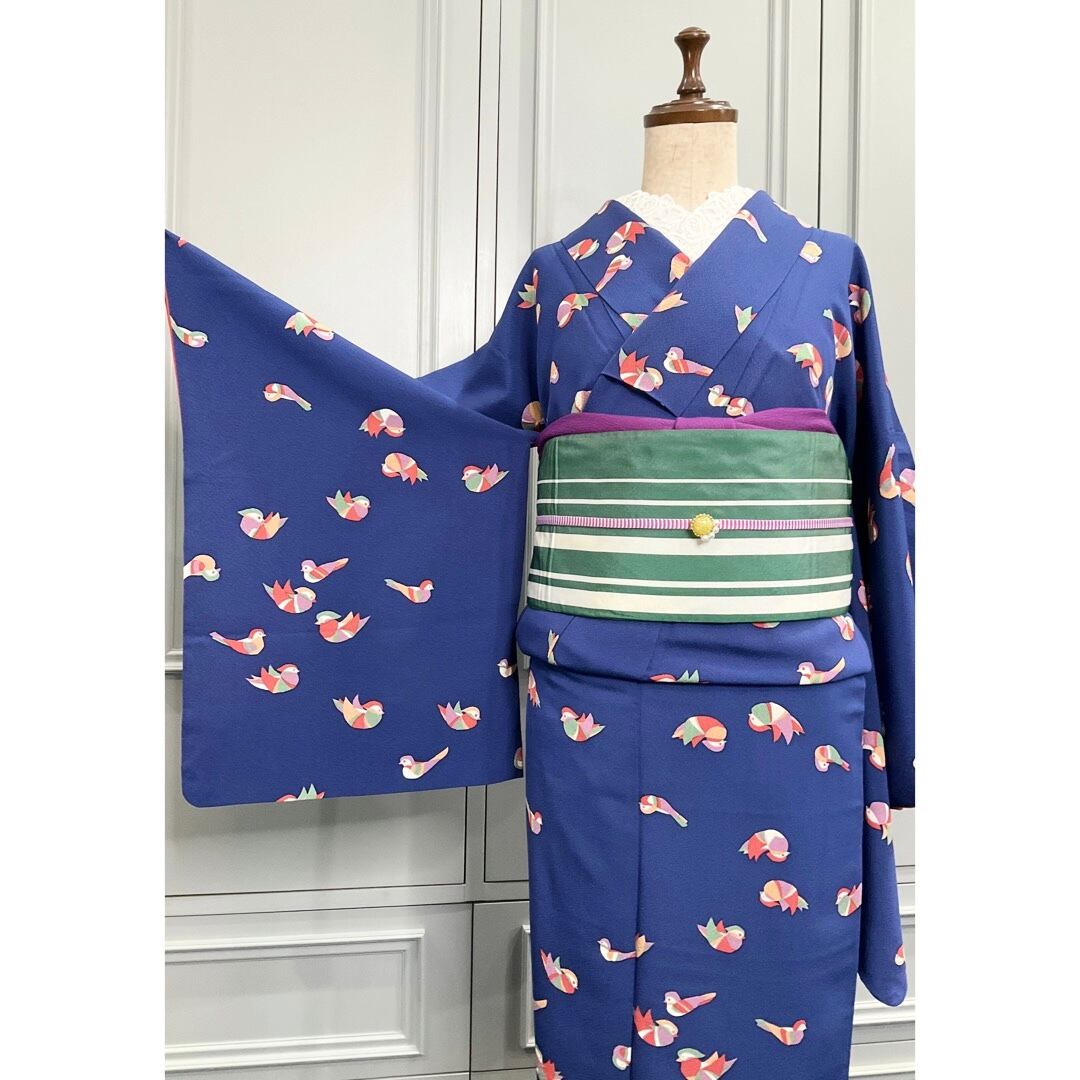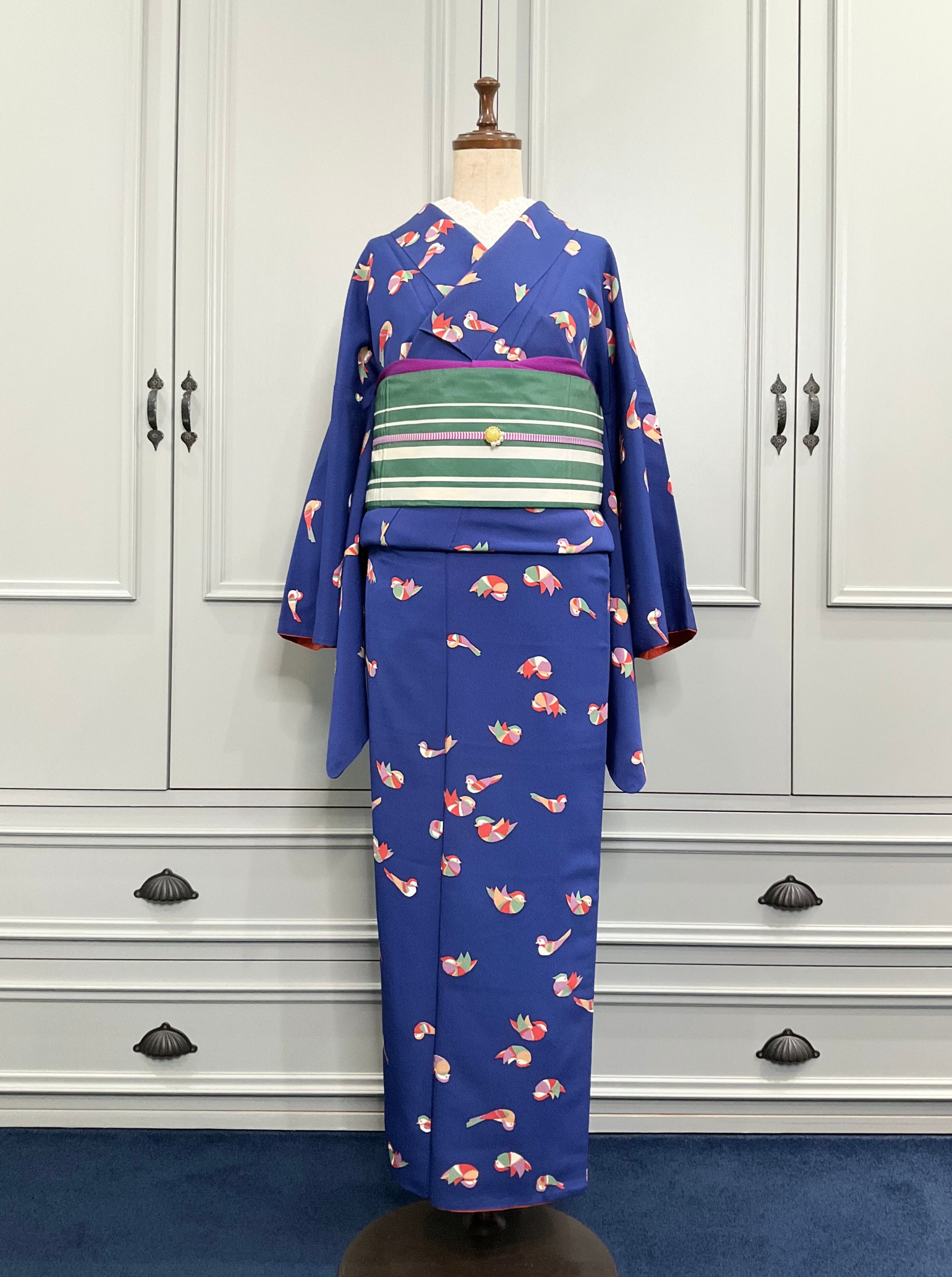 ブルーの地色に、おしどりがデザインされた小紋着物です♪