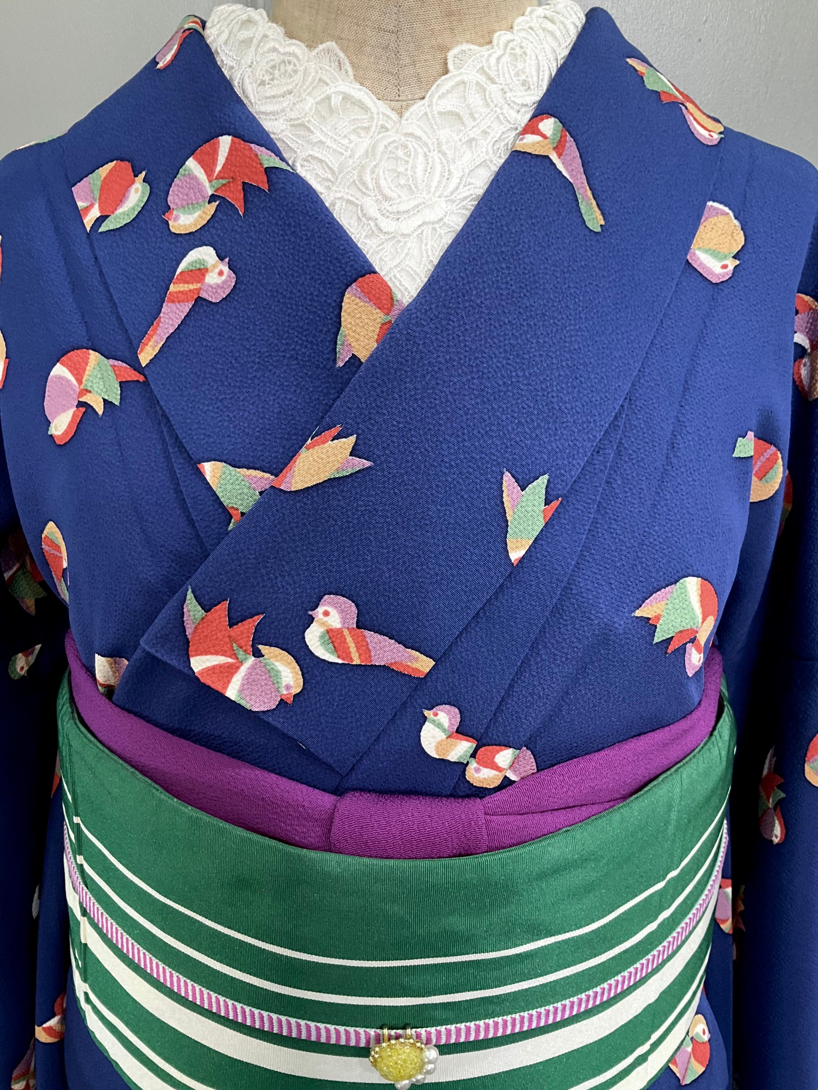 少し濃いめのブルーの地色に、色とりどりの愛らしいオシドリがたくさん描かれた、こちらのお着物。