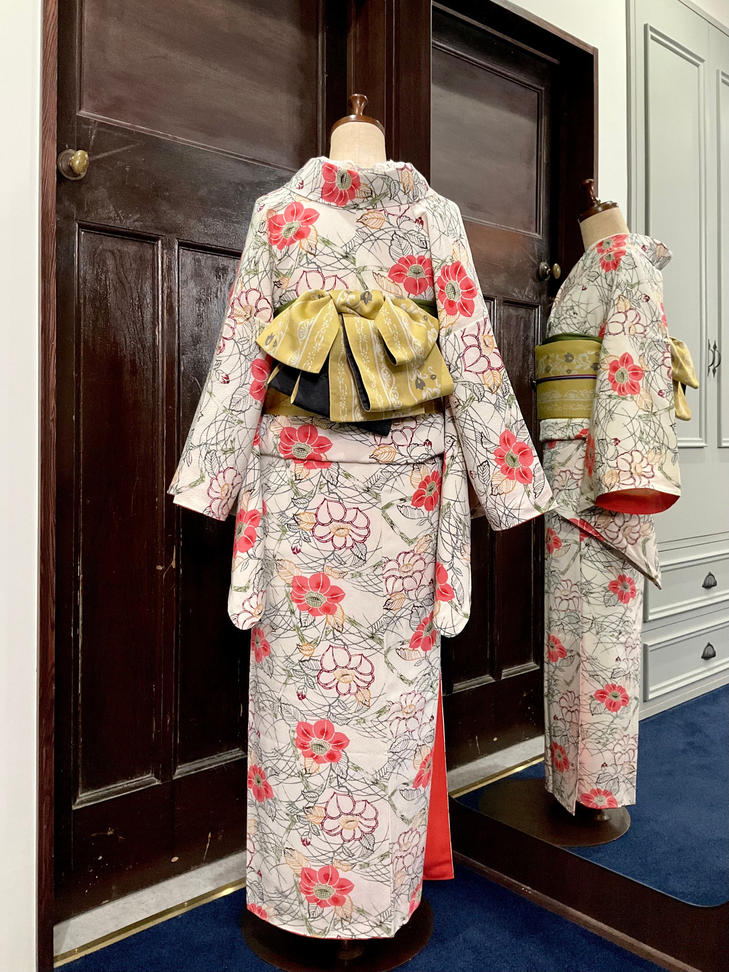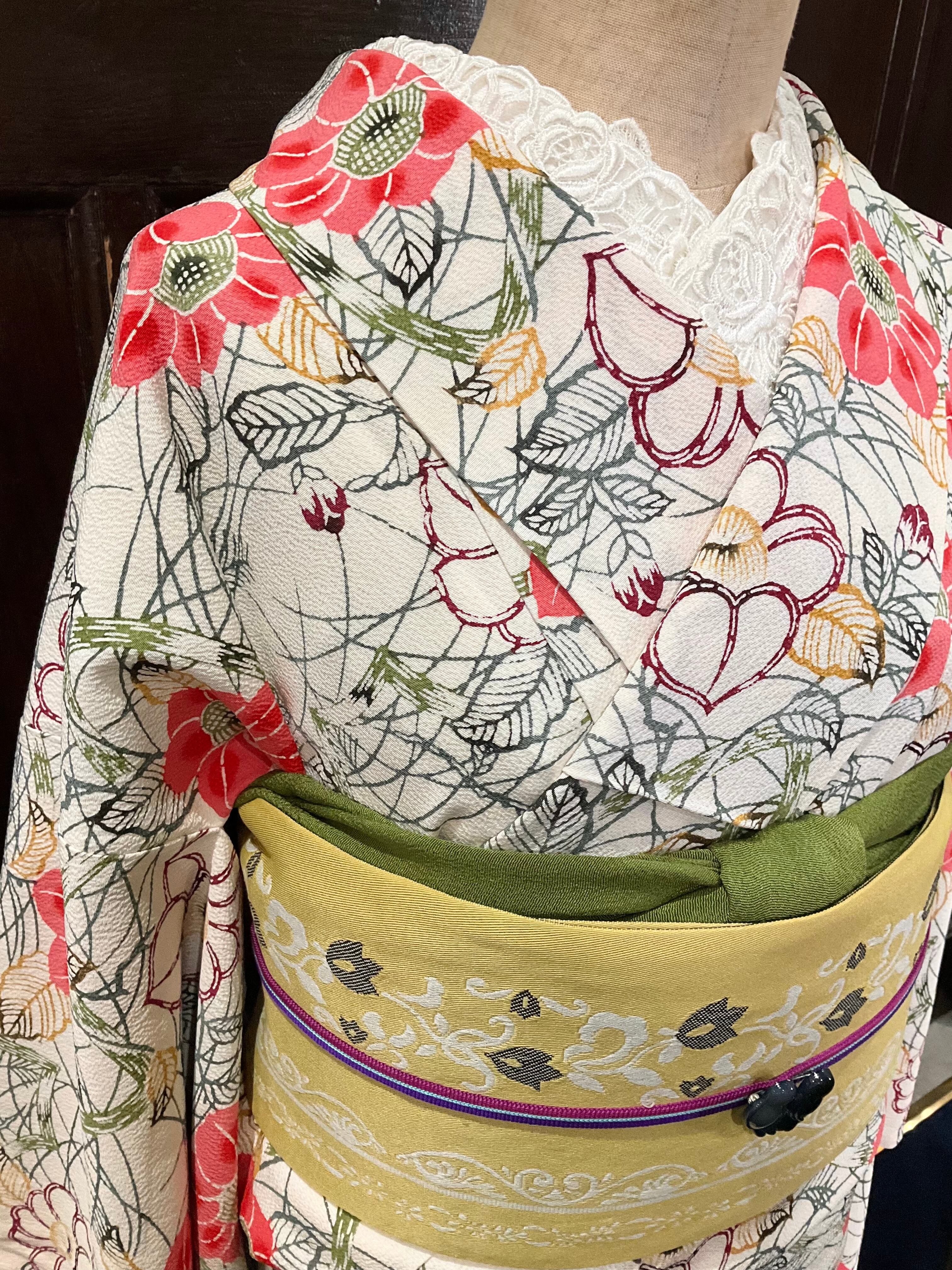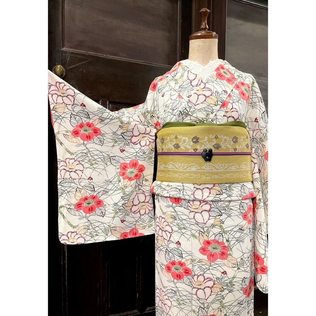 全体的に描かれた、椿の花を中心としたデザインが華やかなこちらのお着物。