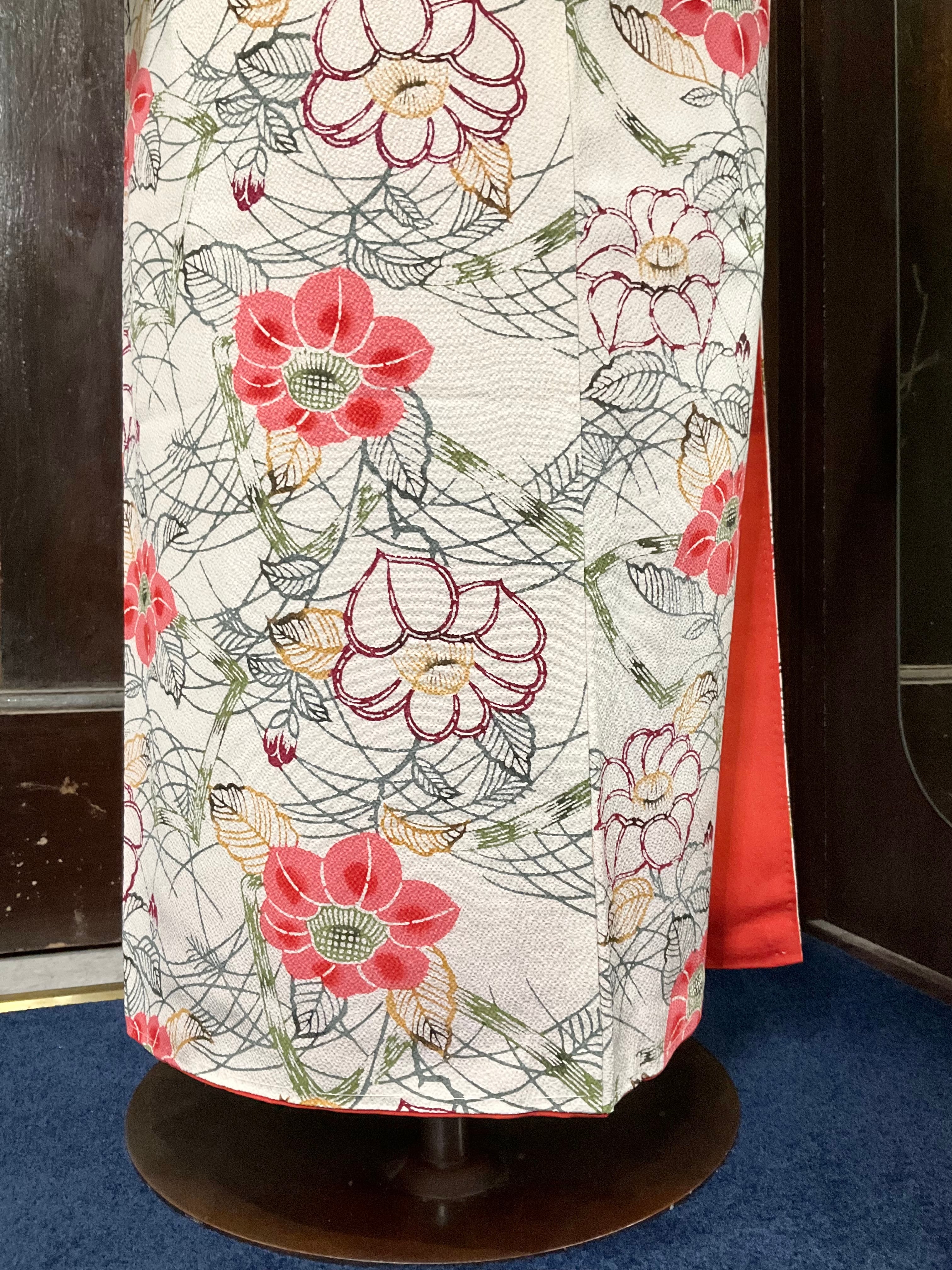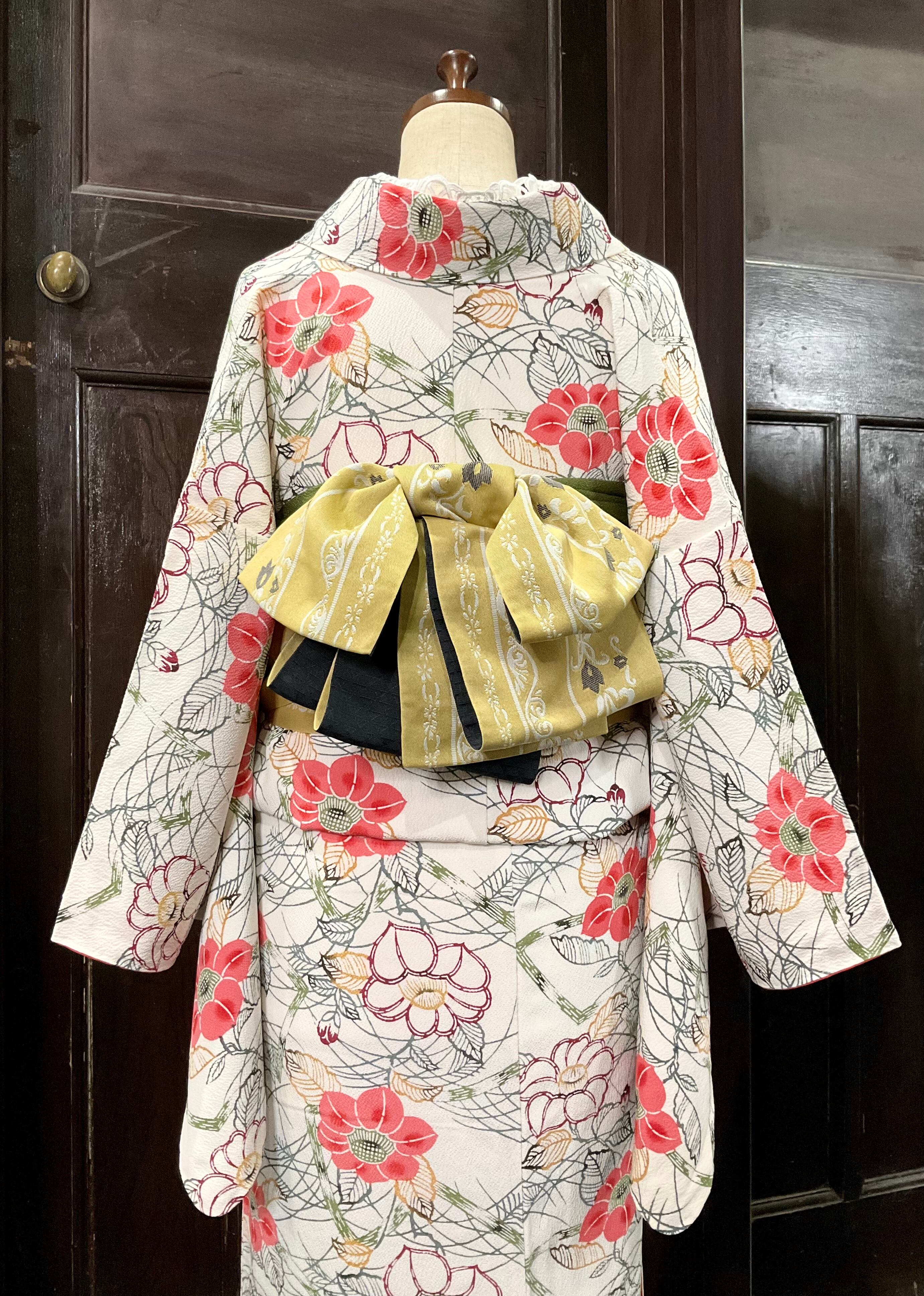 オフホワイト 椿の咲く庭にて*リサイクル小紋キモノ 0960