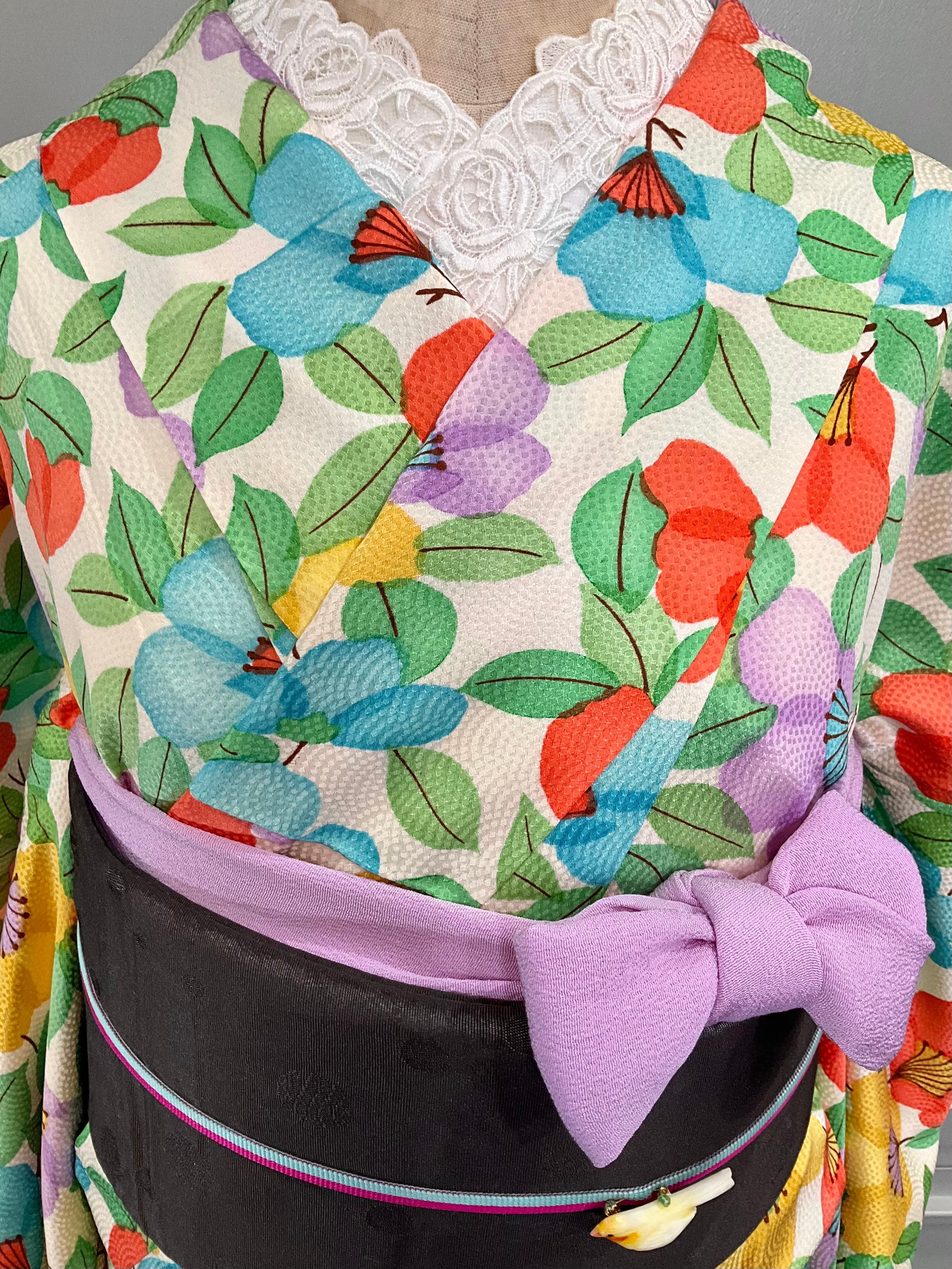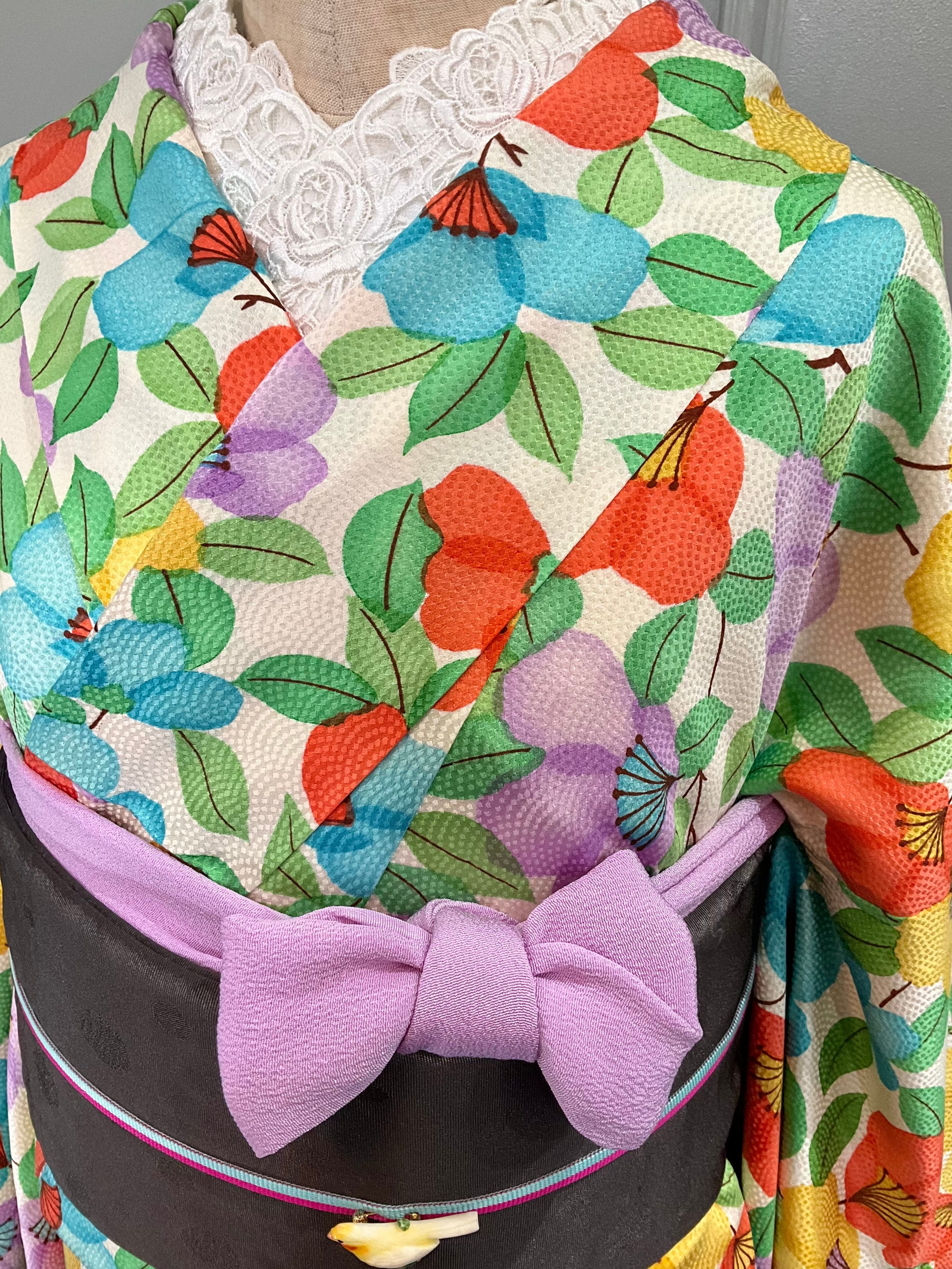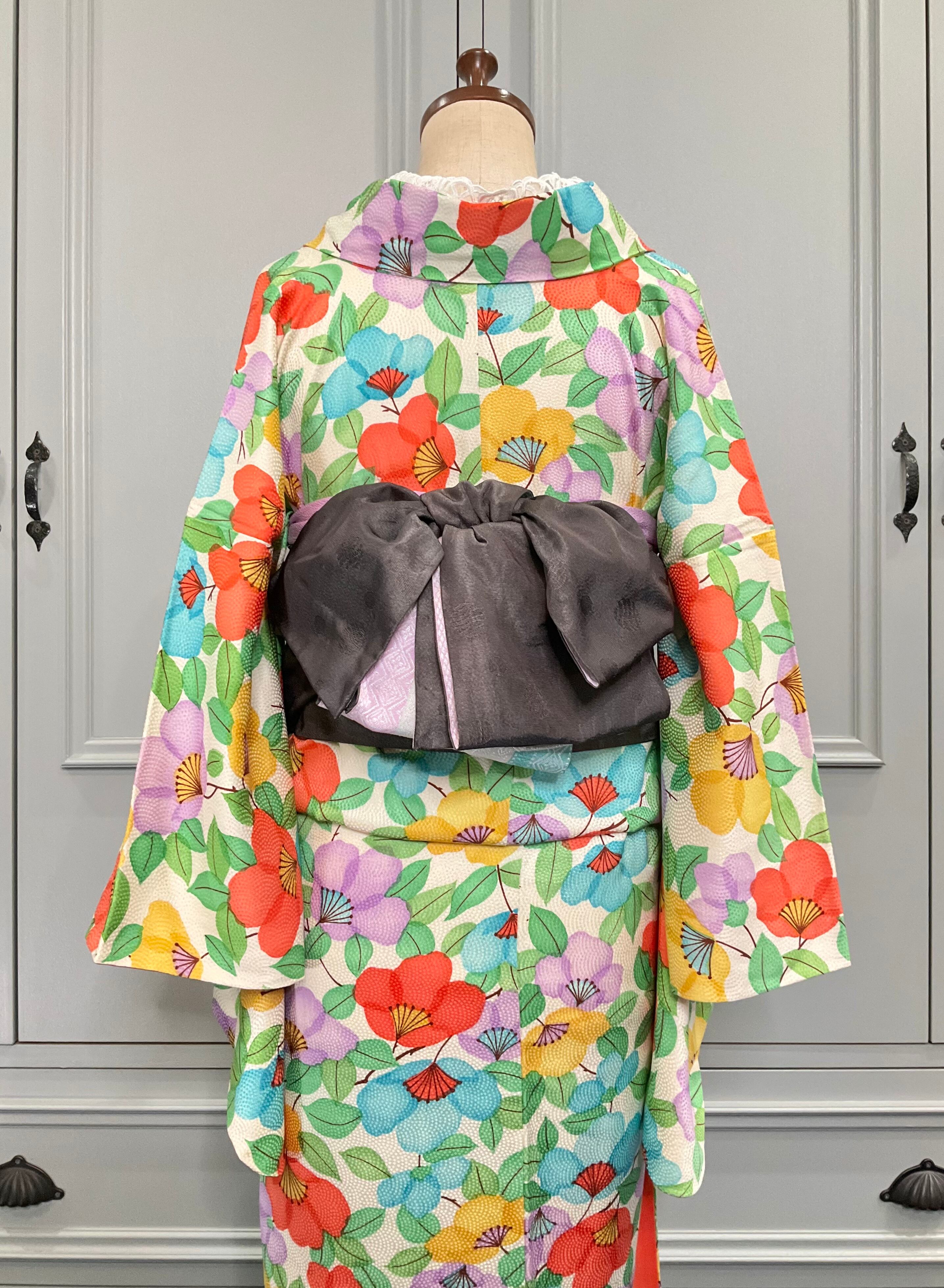 色数も多く、柄もびっしりと描かれているので、着物を主役に、合わせる帯はシンプルなデザインのものとコーディネートしていただくのもオススメです♡