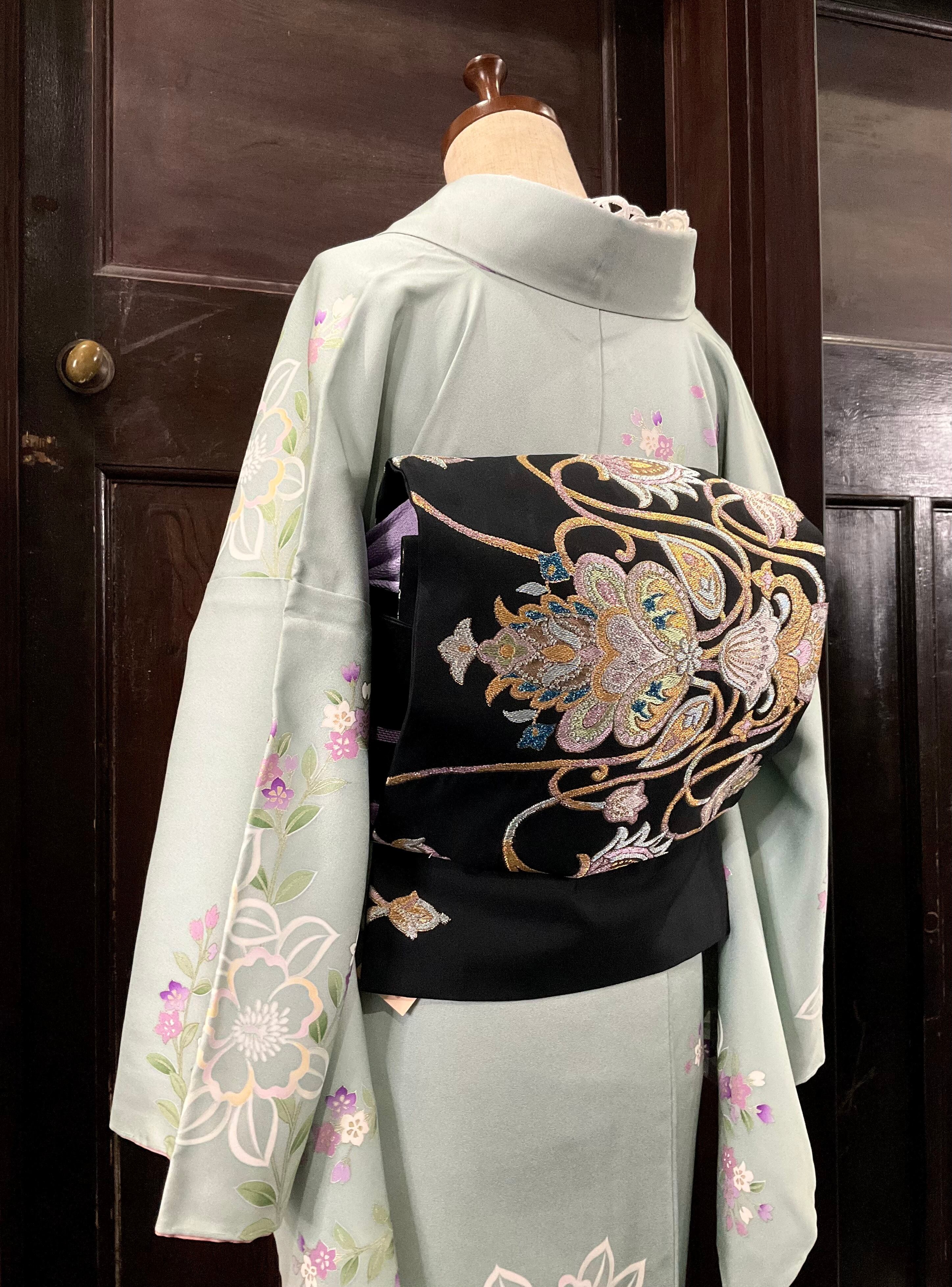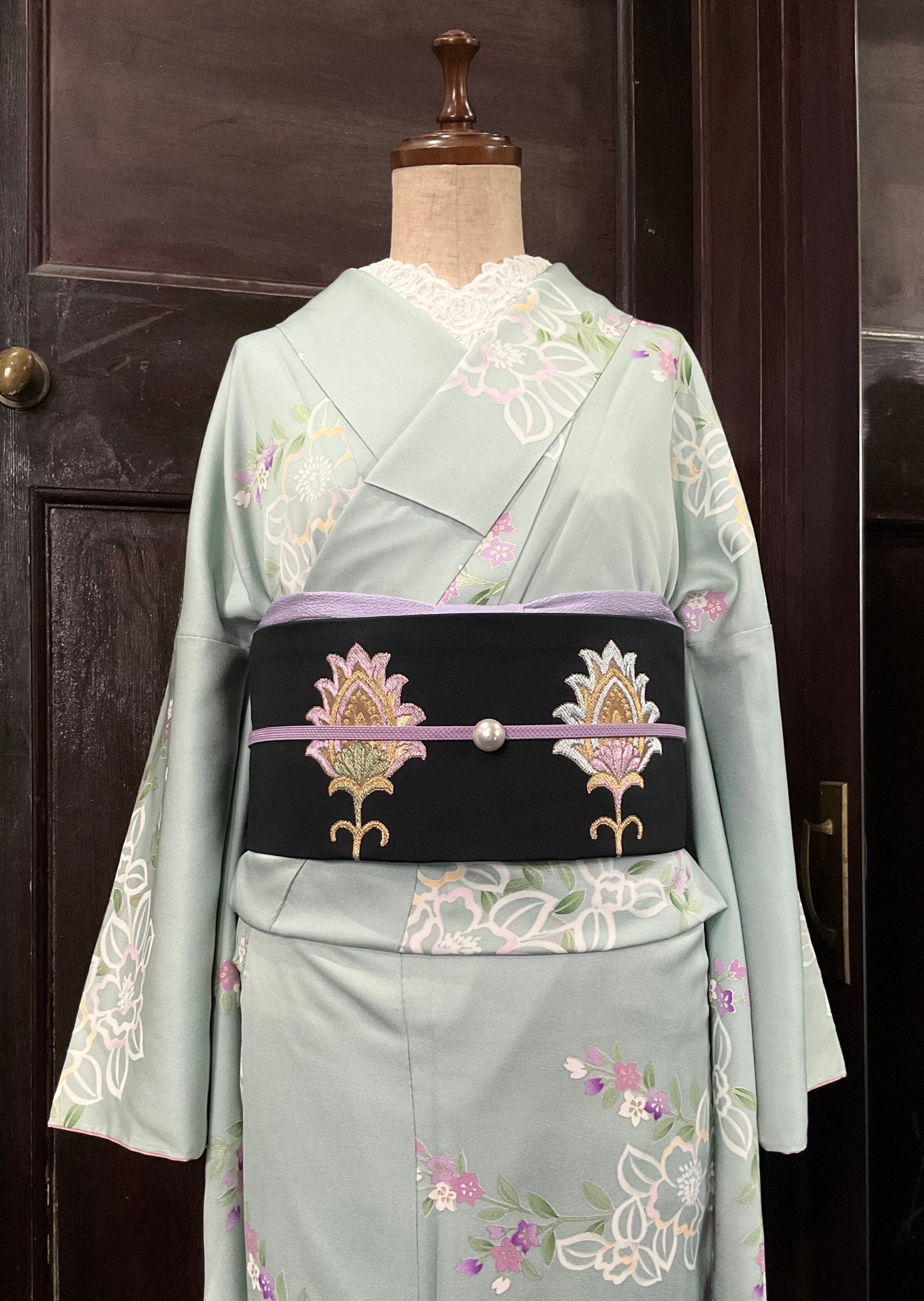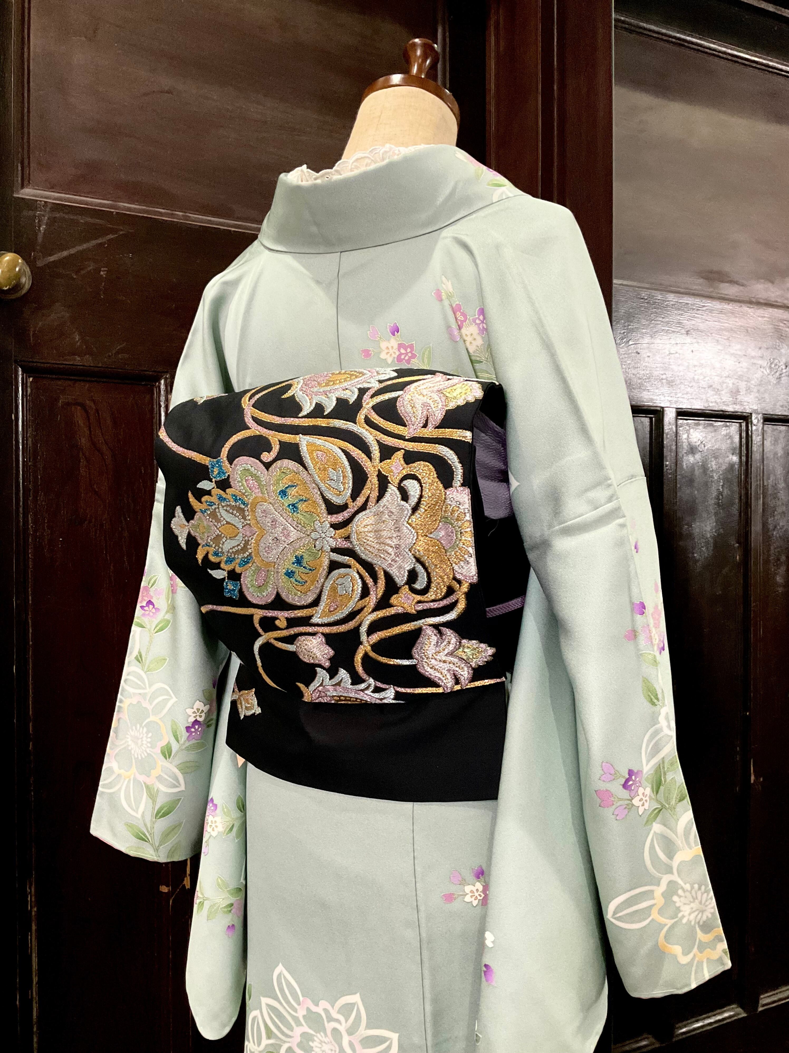 キラキラと煌めく金糸や銀糸がたくさん使われた柄部分は、お花をモチーフにしたシャンデリアを横にしたデザインのようにも見え、とても豪華です✨