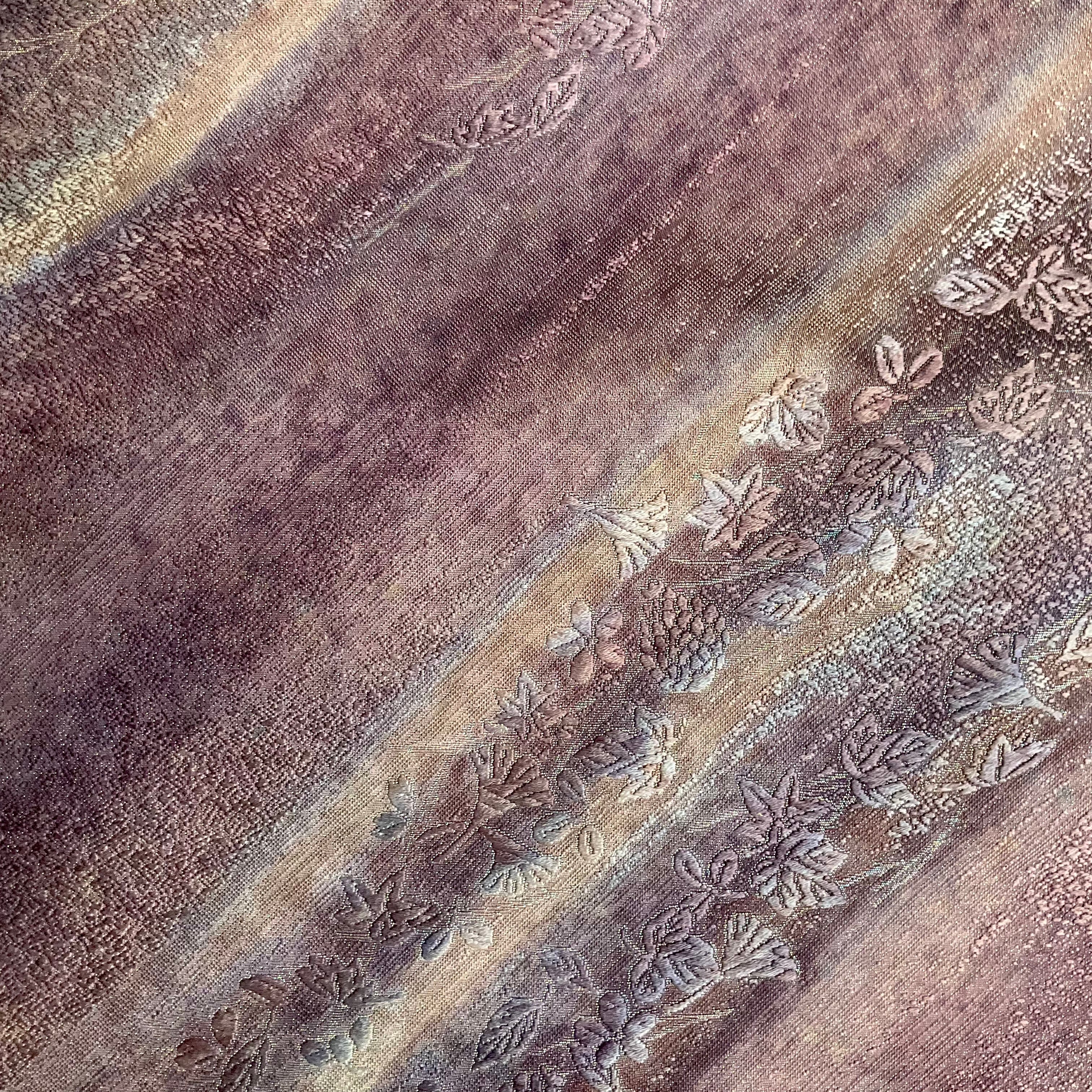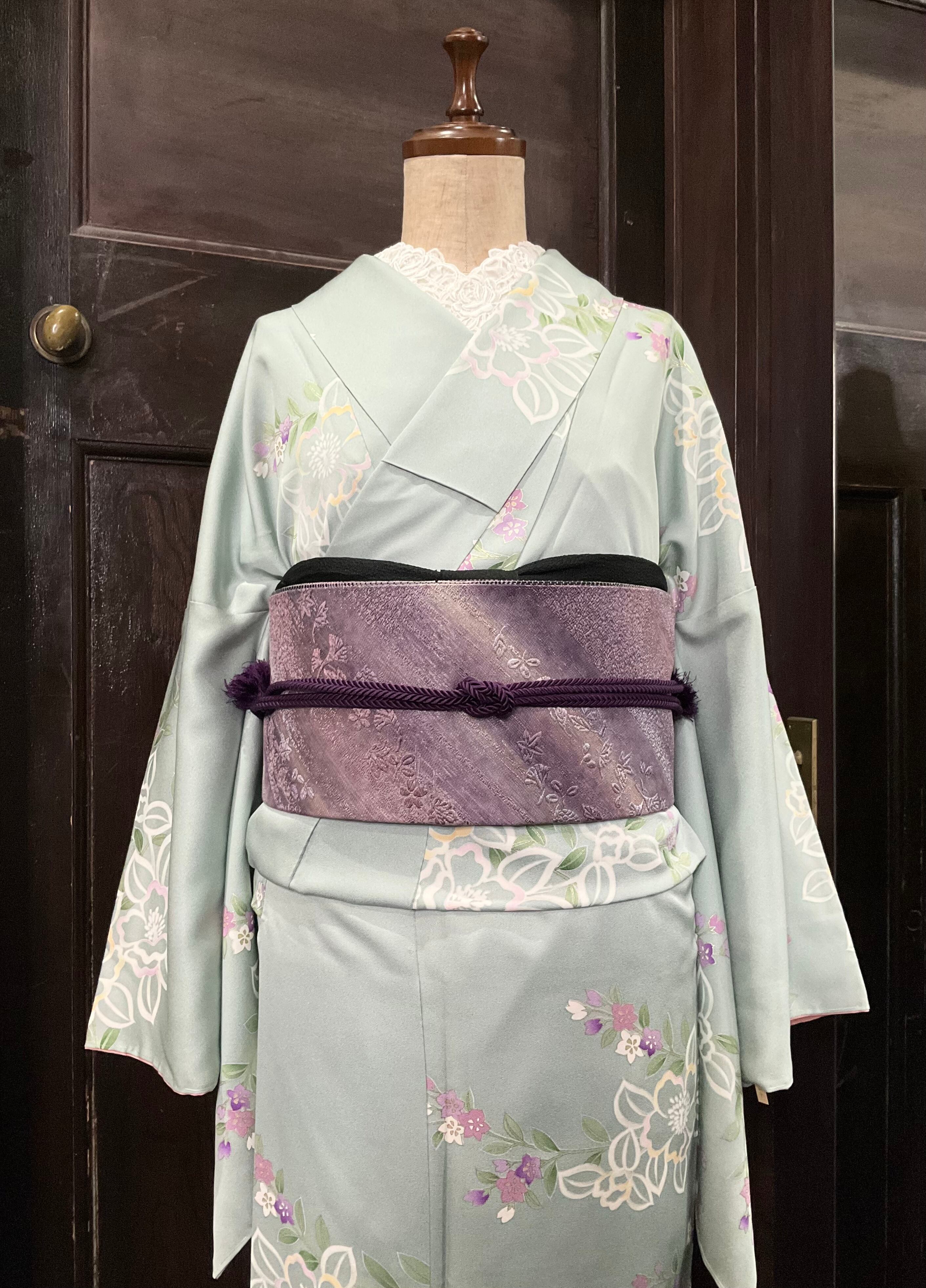 パープル系の地色に、葉や花模様がデザインされた、名古屋帯です♪