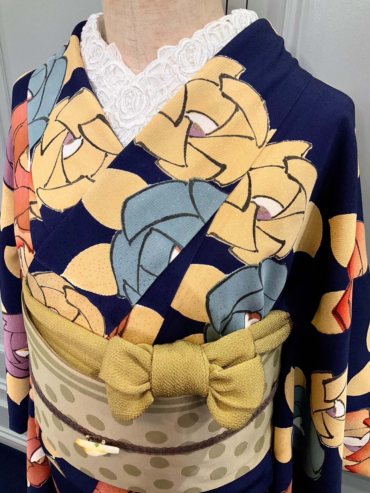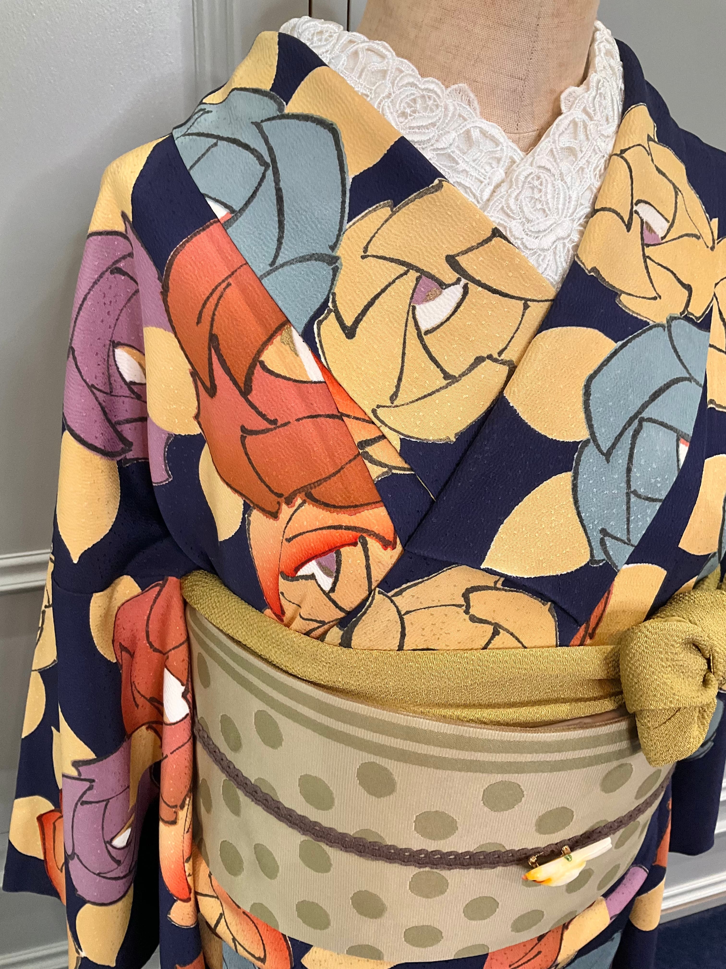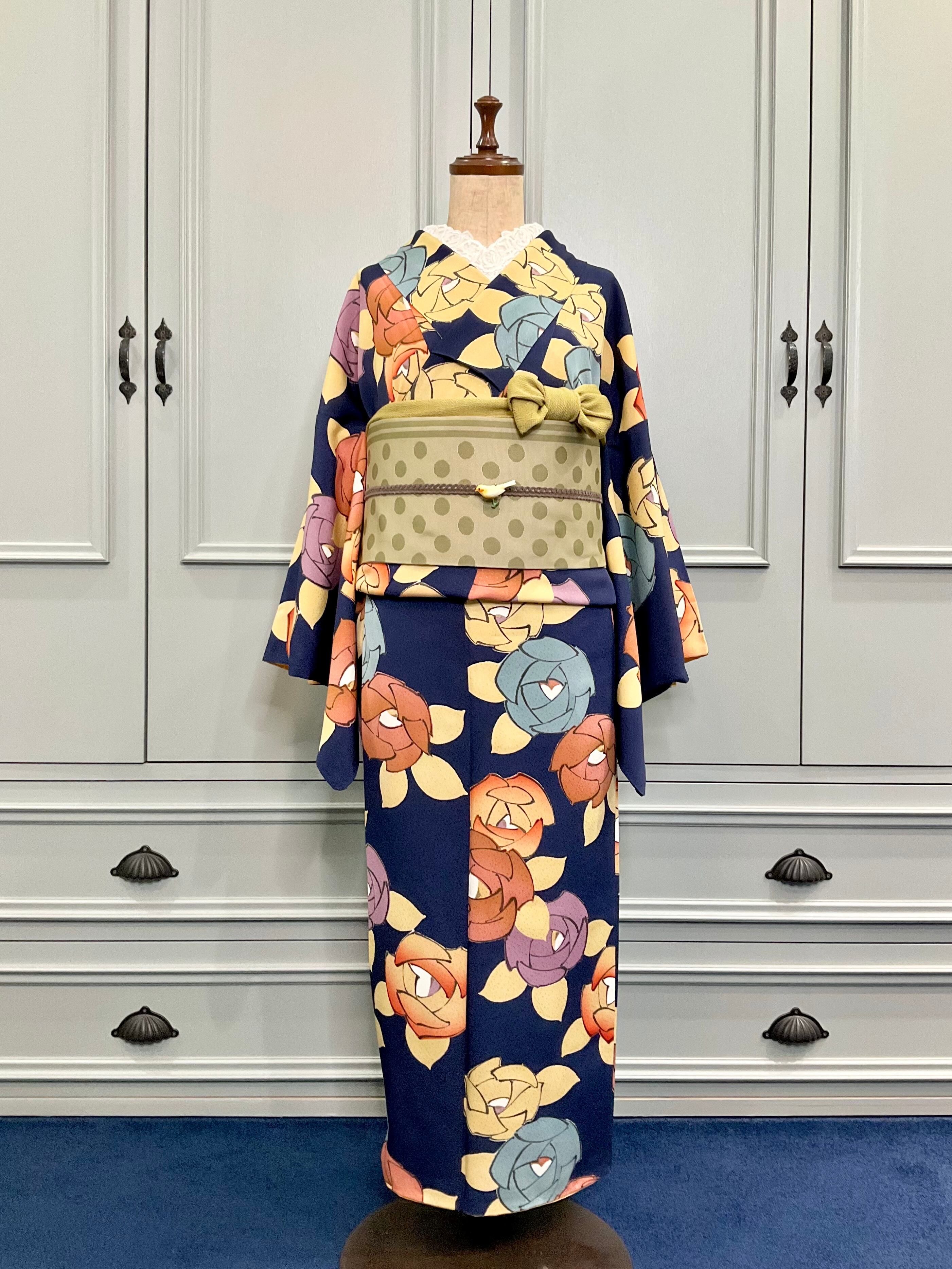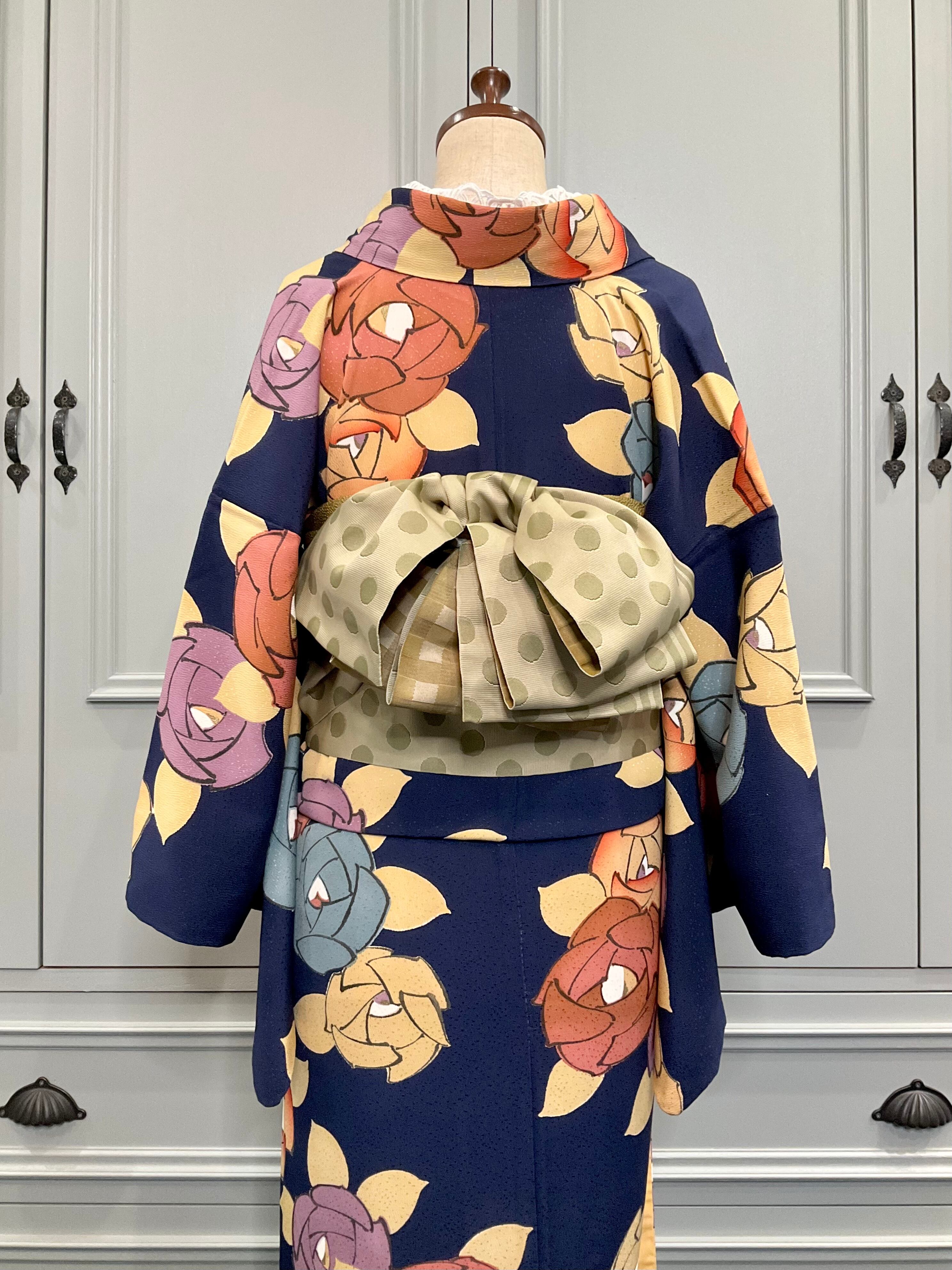 深みのあるインディゴ系の地色に、大きく描かれた色とりどりの薔薇の花模様が華やかな、こちらのお着物。