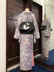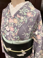 ほんのりスモーキーなパープル系の地色に、パステル調の花模様が綺麗なこちらのお着物。