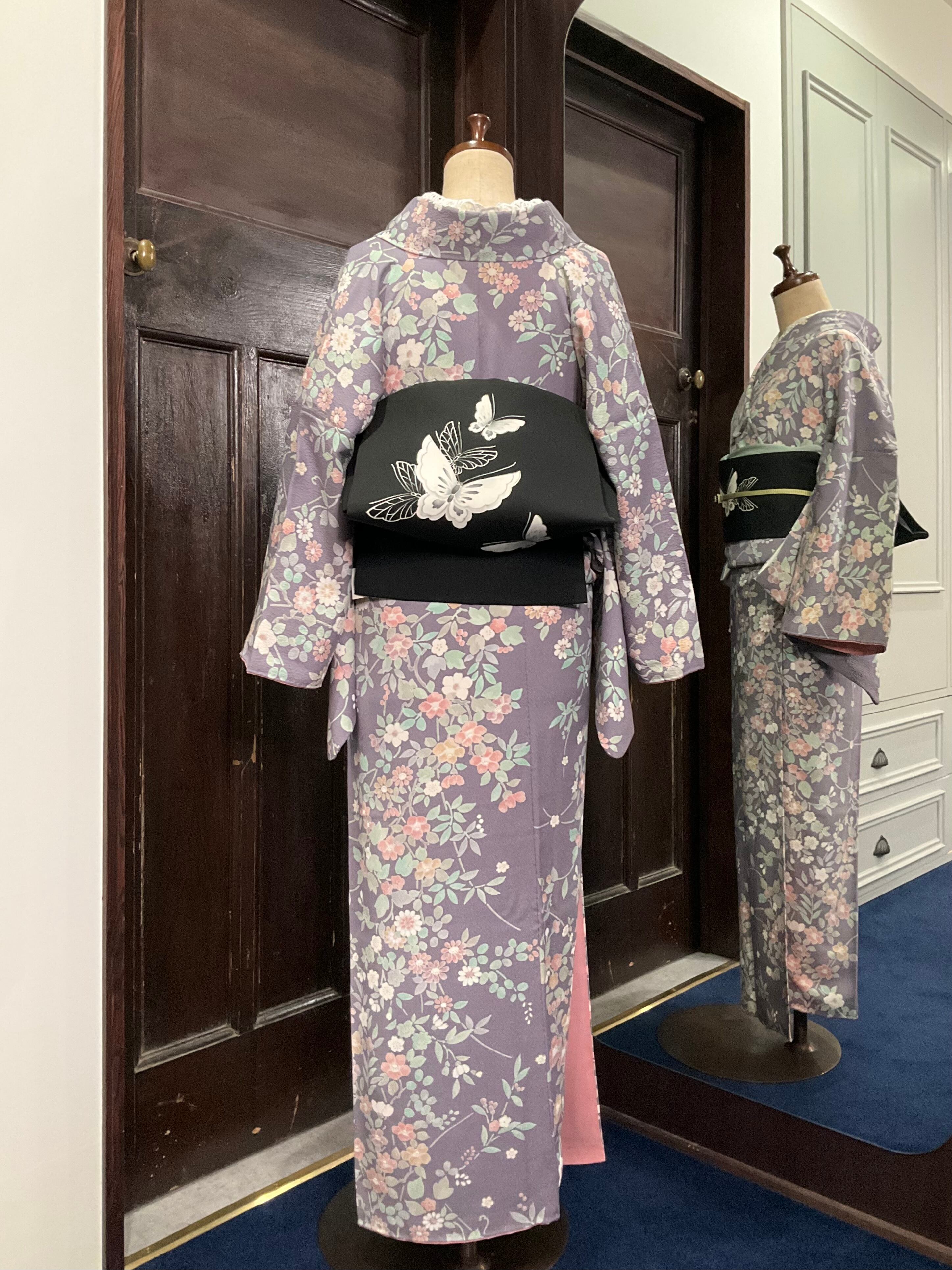 全体的にやわらかなお色なので、春は白っぽいものやパステル調を、秋冬にはブラックや濃いめのお色の帯を合わせるのもオススメです♡