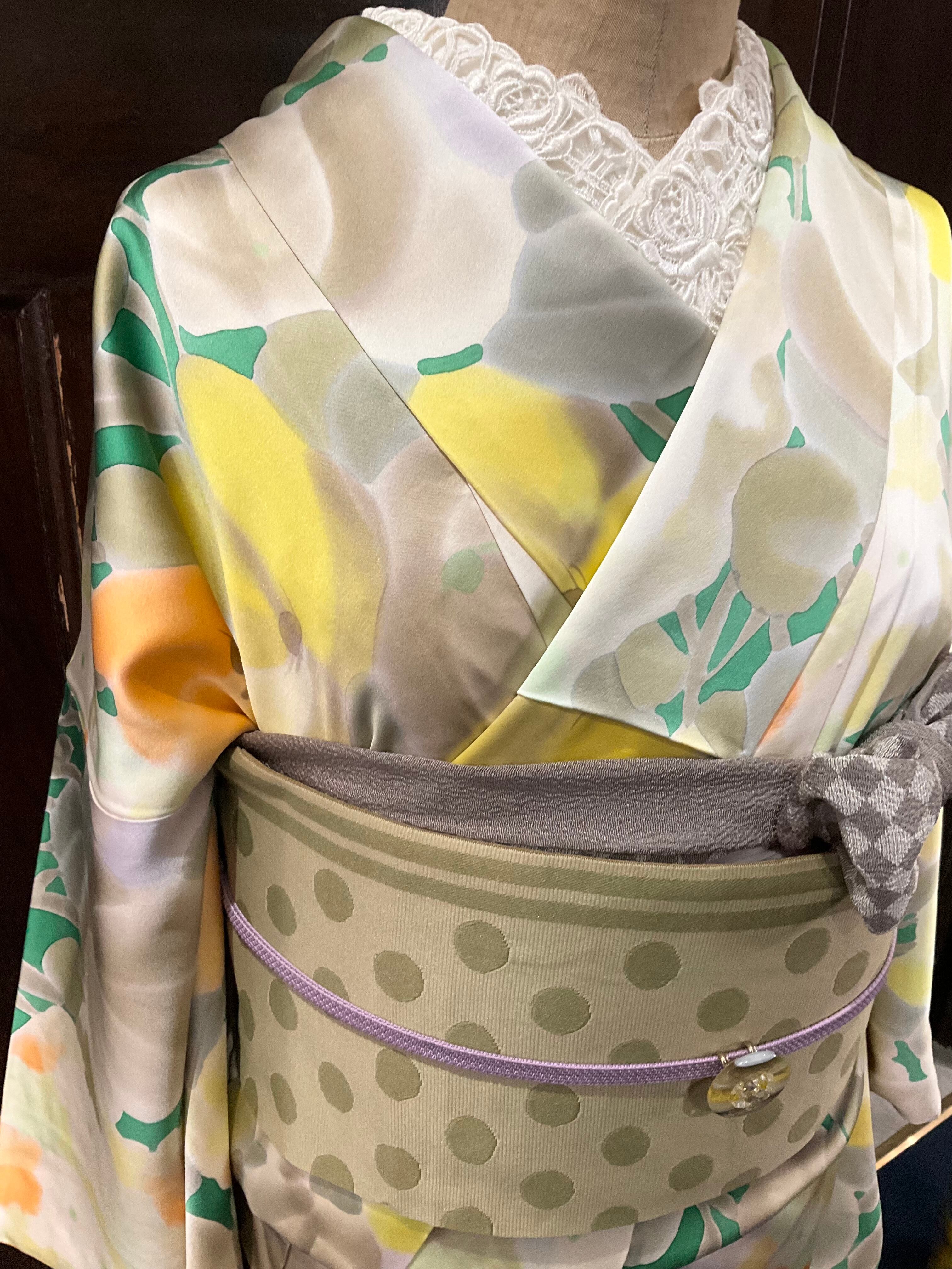 水彩絵の具で描いたような、じんわりと広がる色彩が綺麗なこちらのお着物。