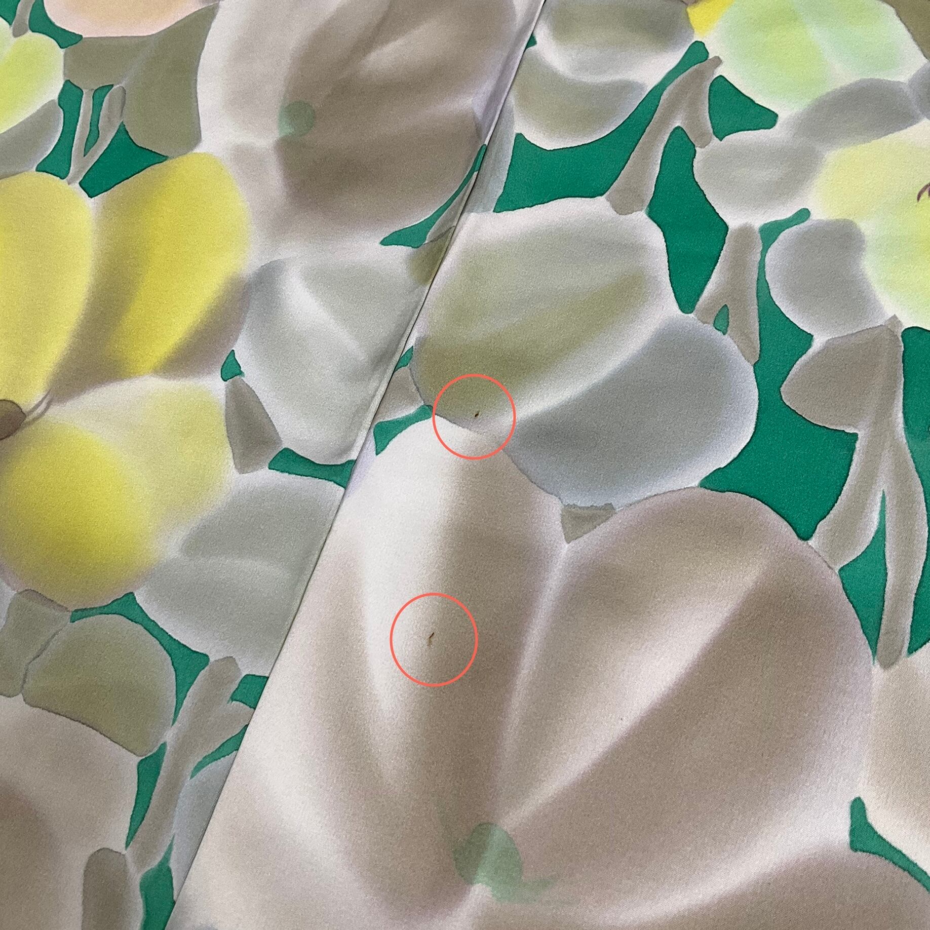 左後ろ身頃(裾から約36.5cmあたりと約42.5cmあたり)、胴裏(左前身頃の裾から約66cmあたり)に、小さな変色有り。