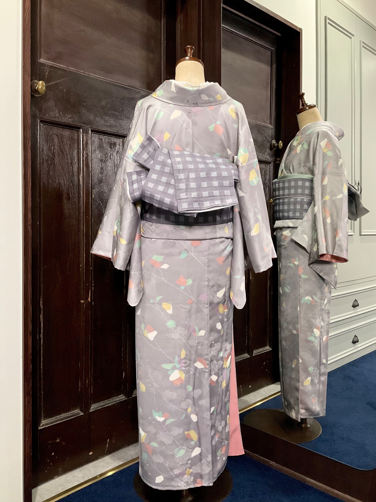 淡いグレー系の地色に、花模様がデザインされた、小紋着物です♪
