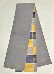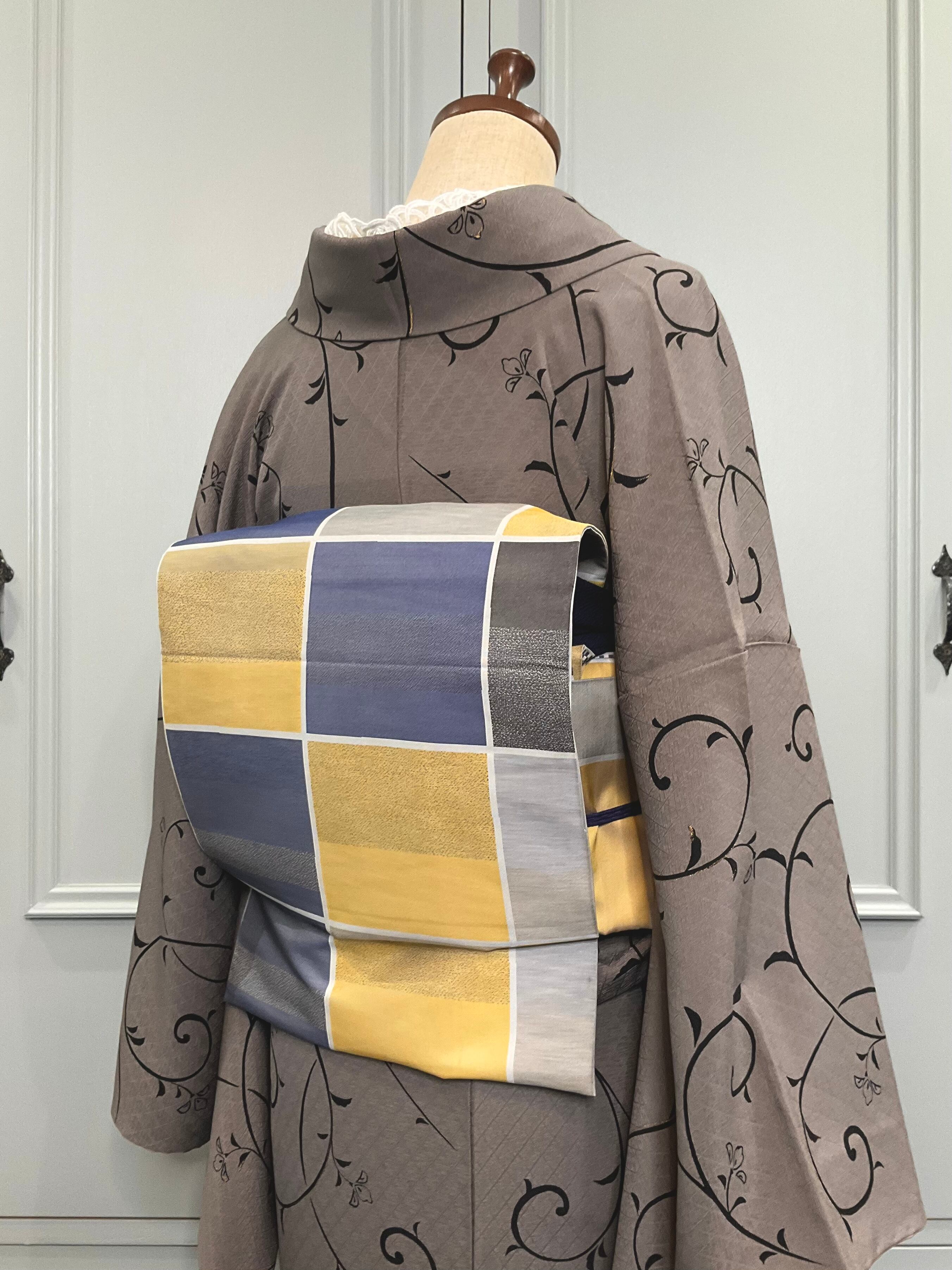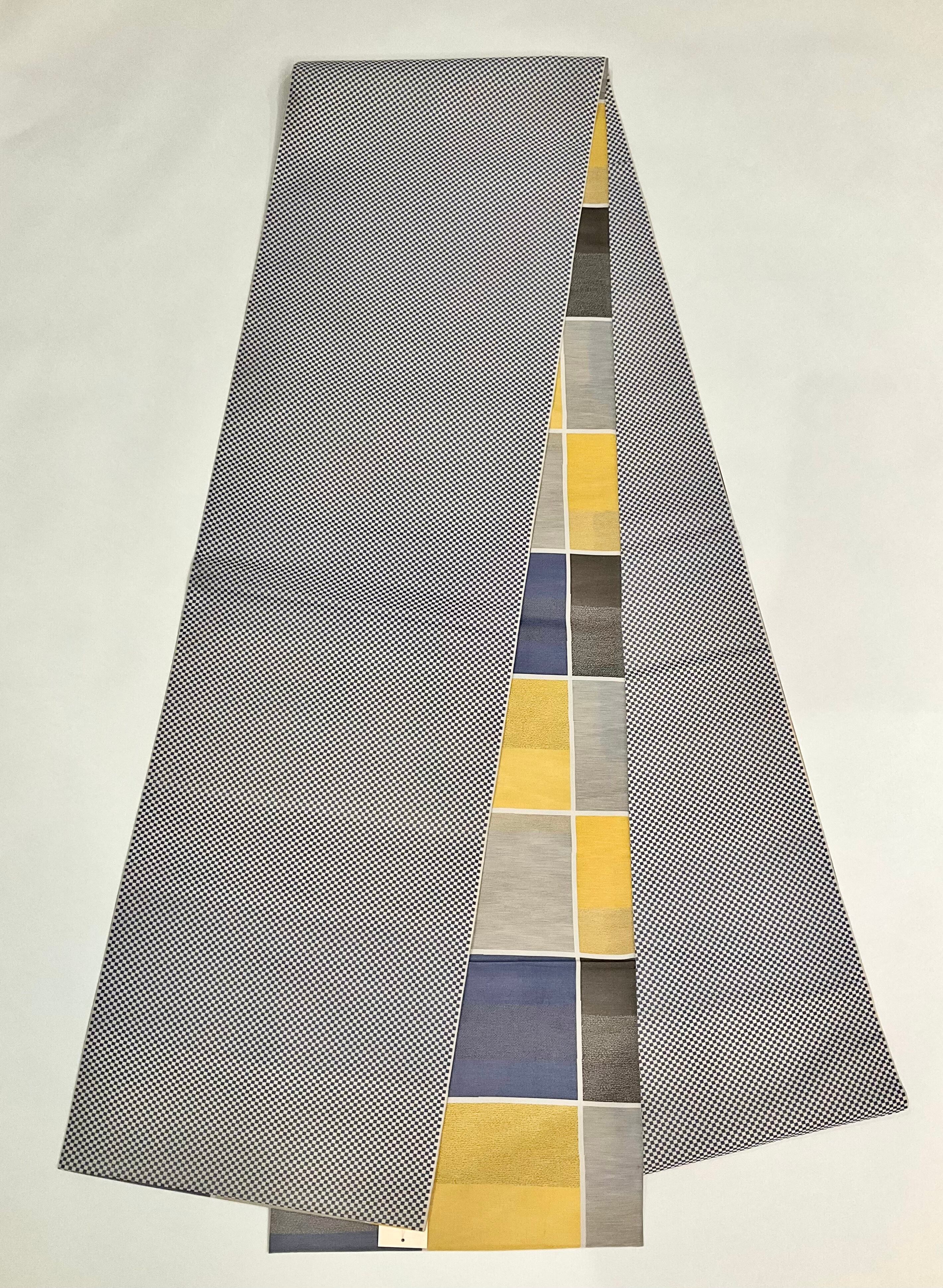 イエロー、ブルー、グレー、ブラウンと、4色のお色がランダムに配色された、スクエアのデザインがモダンなこちらの洒落袋帯。