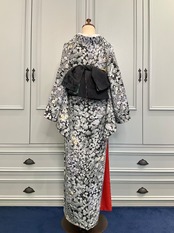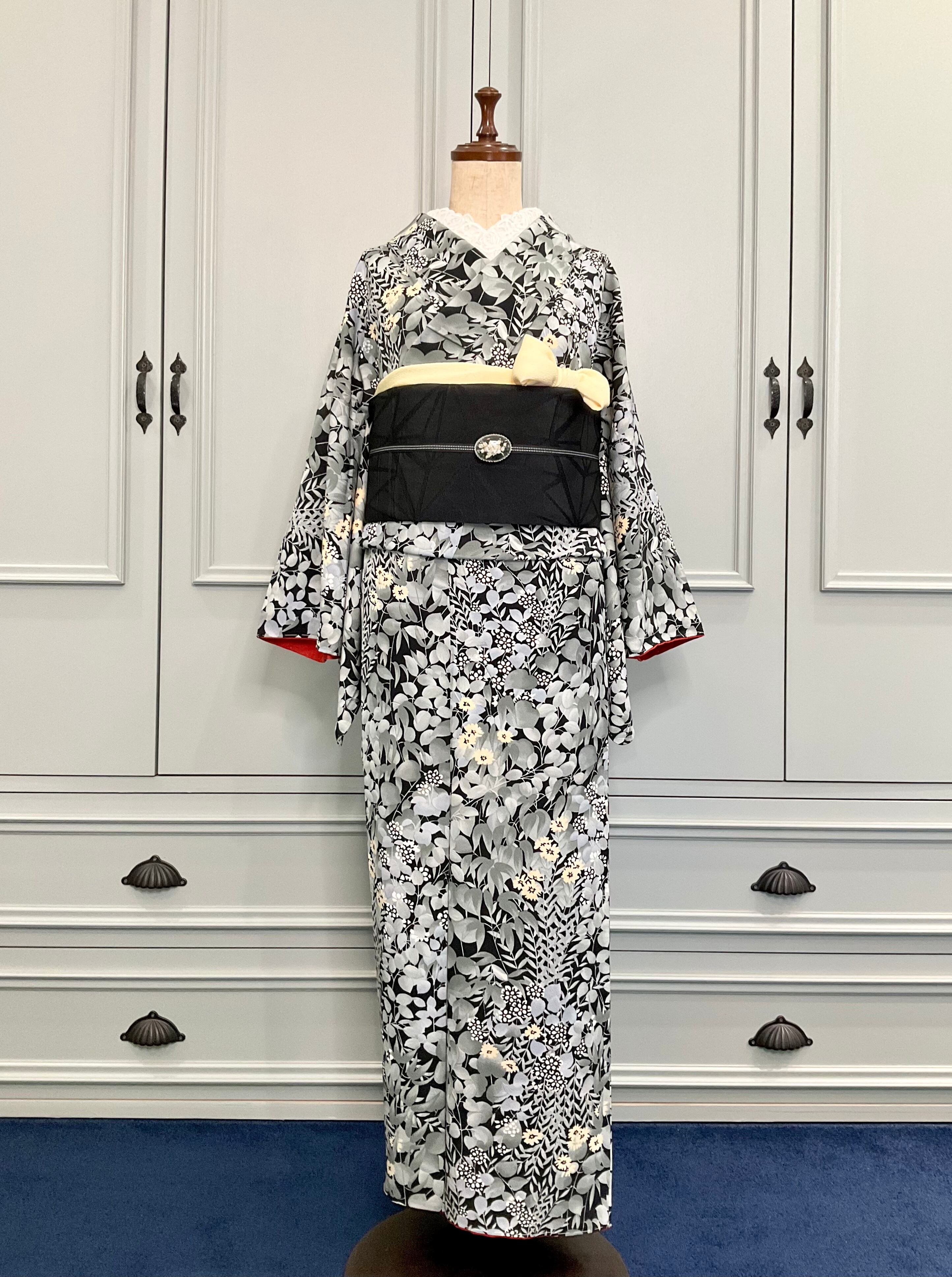 ブラックの地色に、モノトーンカラーを中心とした花模様がシックなこちらのお着物。