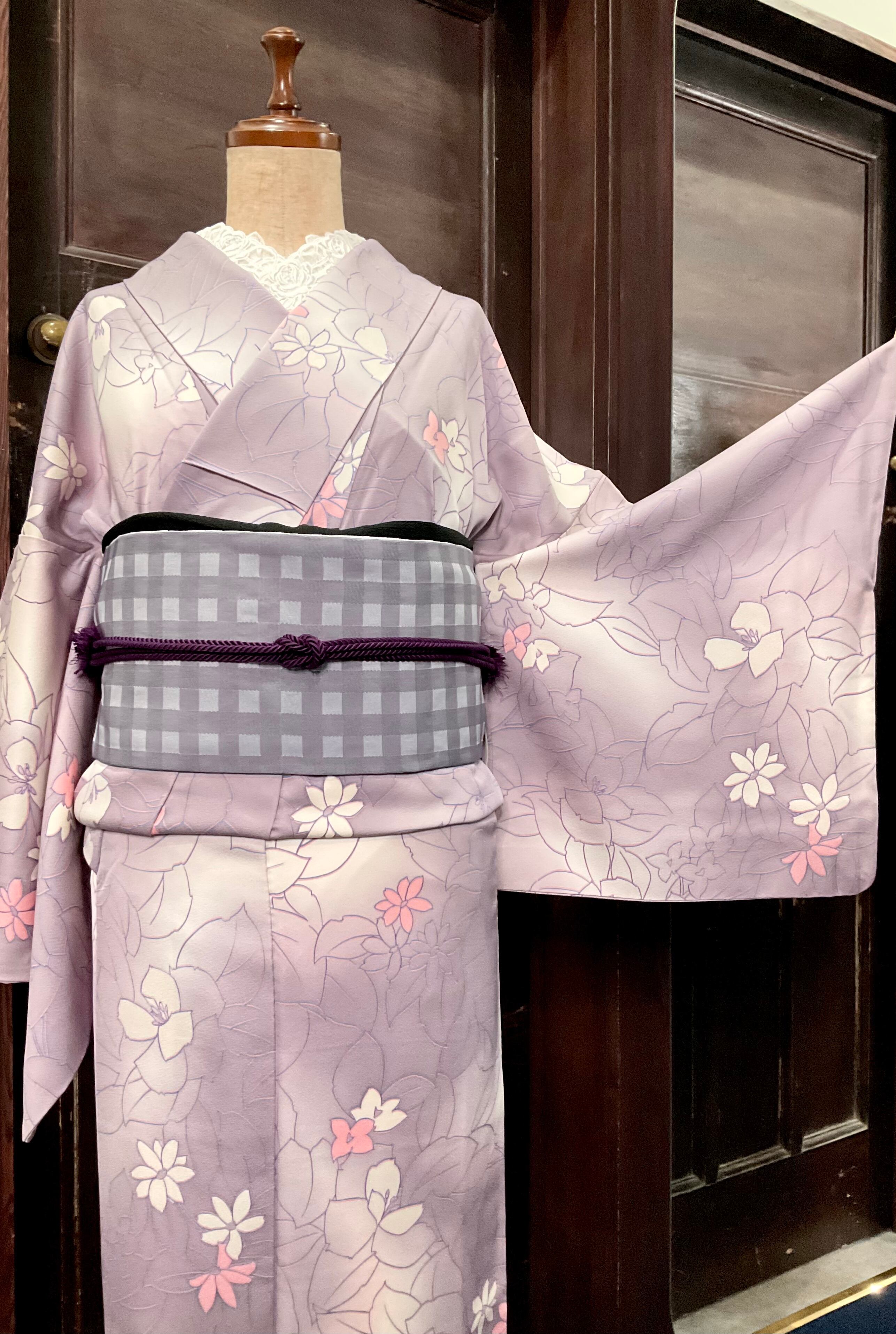 パープル系の地色に、花模様がデザインされた、小紋着物です♪