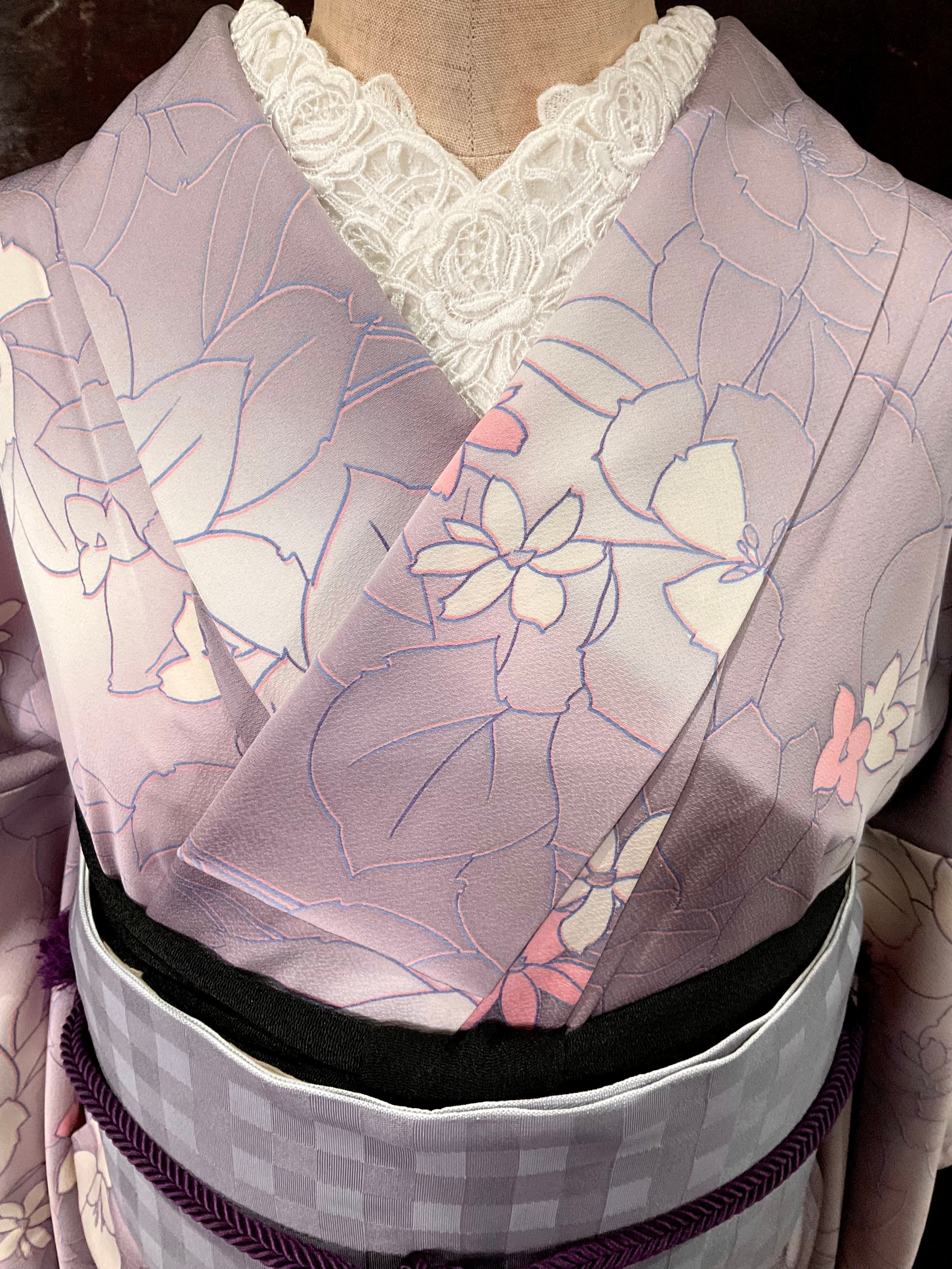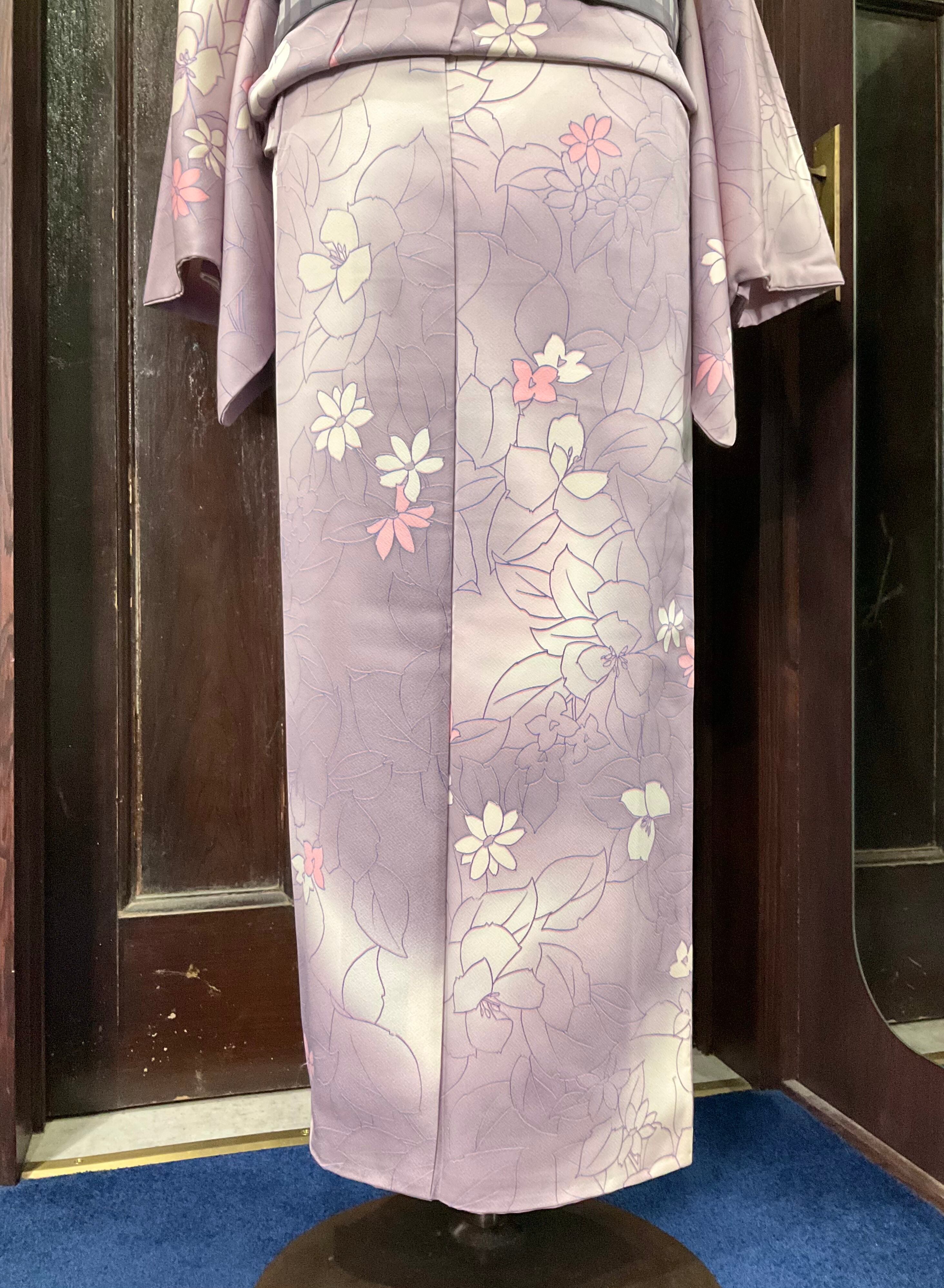 霞がかかったような、少しスモーキーで落ち着いた印象のパープル系の地色が、やわらかなグラデーションになっていて綺麗なこちらのお着物。