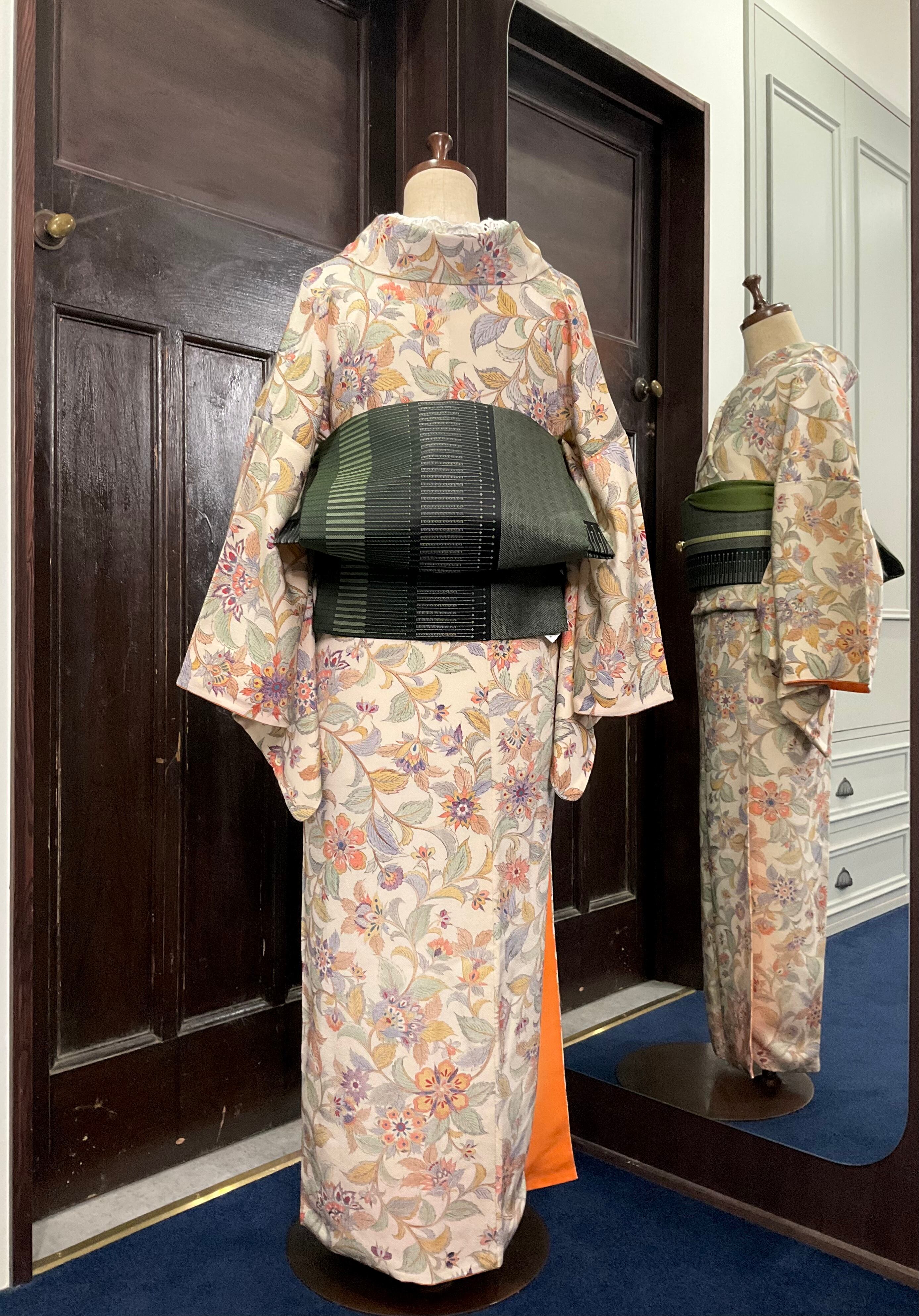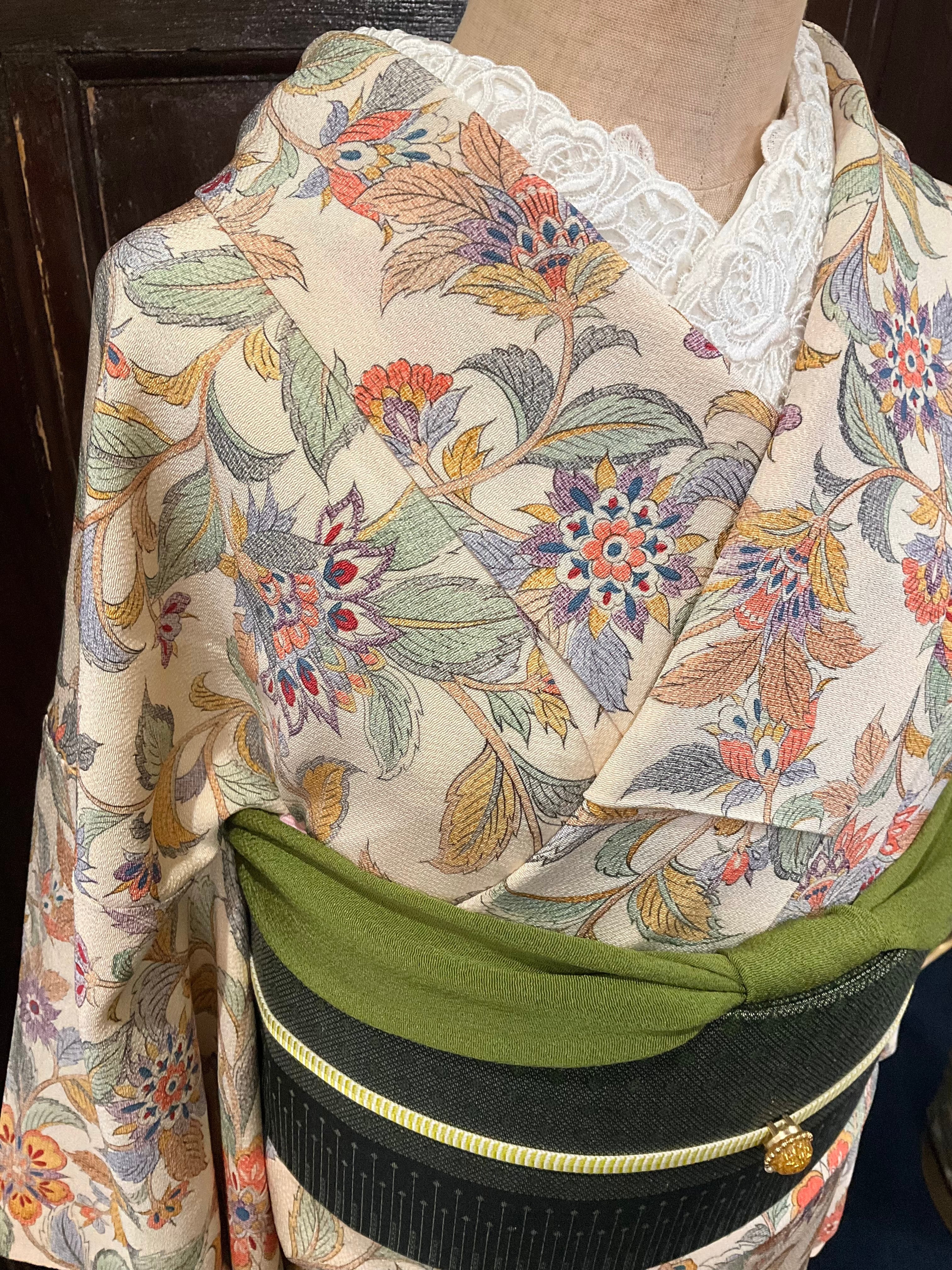 やさしいクリーム系の地色に、全体的に描かれた、オリエンタルな雰囲気漂う花模様のデザインがオシャレなこちらのお着物。