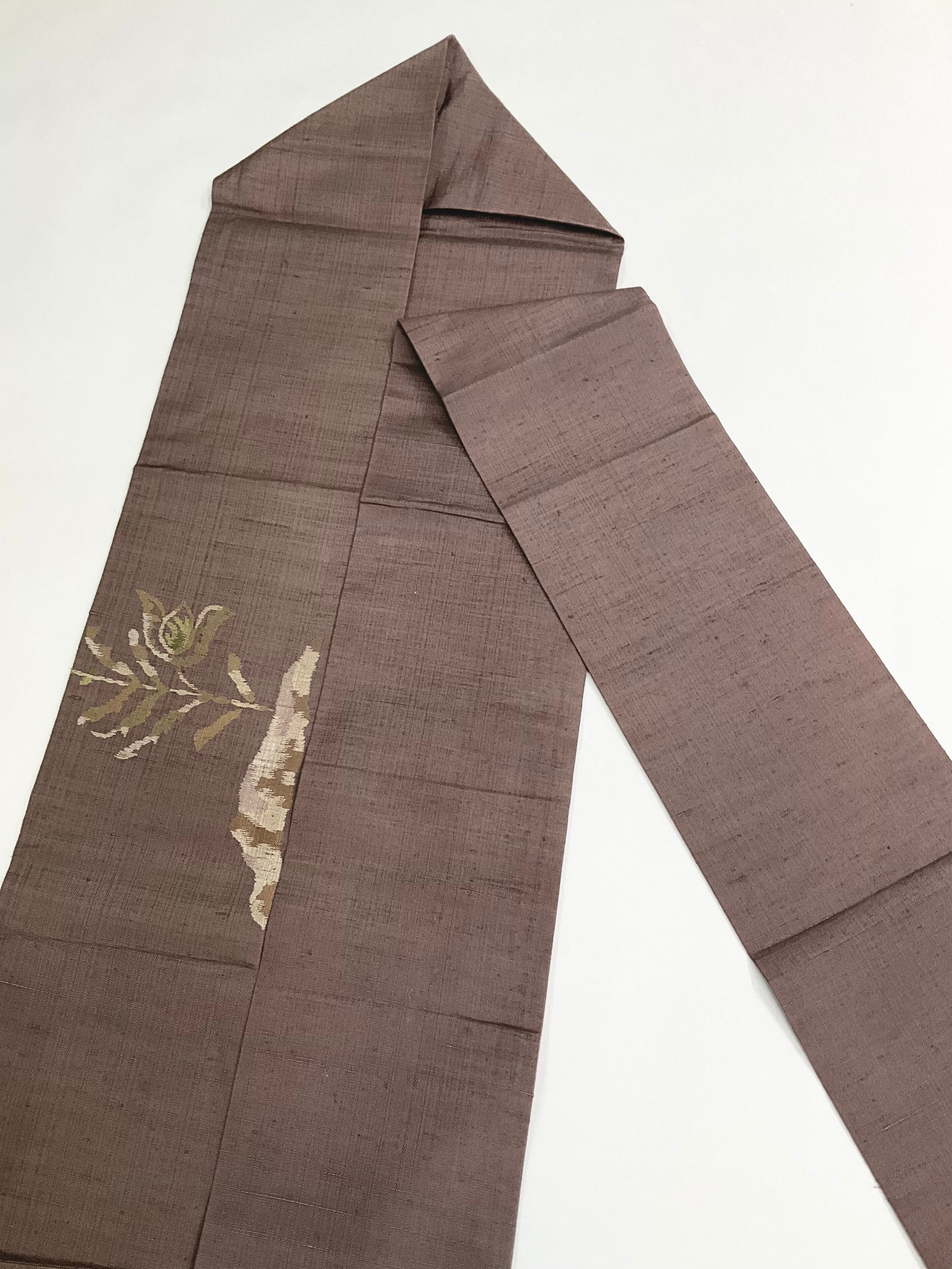 紬地のほっこり落ち着いたブラウンの地色に、木のような、草花のような植物と鳥さんがやさしい雰囲気です^^